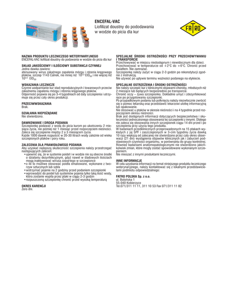 ENCEFAL-VAC Liofilizat doustny do pododawania w wodzie do picia dla kur NAZWA PRODUKTU LECZNICZEGO WETERYNARYJNEGO ENCEFAL-VAC liofilizat doustny do podawania w wodzie do picia dla kur SKŁAD JAKOŚCIOWY I ILOŚCIOWY SUBSTANCJI CZYNNEJ Jedna dawka zawiera: atenuowany wirus zakaźnego zapalenia mózgu i rdzenia kręgowego ptaków, szczep 1143 Calnek, nie mniej niż 103,0 EID50 i nie więcej niż 104,0 EID50 WSKAZANIA LECZNICZE Czynne uodparnianie kur stad reprodukcyjnych i towarowych przeciw zakaźnemu zapaleniu mózgu i rdzenia kręgowego ptaków. Odporność pojawia się po 3-4 tygodniach od daty szczepienia i utrzymuje się przez cały okres produkcji. PRZECIWWSKAZANIA Brak. DZIAŁANIA NIEPOŻĄDANE Nie stwierdzono. DAWKOWANIE I DROGA PODANIA Szczepionkę podawać z wodą do picia kurom po ukończeniu 2 miesiąca życia, nie później niż 1 miesiąc przed rozpoczęciem nieśności. Zaleca się szczepienie między 2 a 3 miesiącem życia. Każde 1000 dawek rozpuścić w 20-30 litrach wody zależnie od wieku szczepionych ptaków i pory roku. ZALECENIA DLA PRAWIDŁOWEGO PODANIA Aby uzyskać najlepszą skuteczność szczepienia należy przestrzegać następujących zaleceń: •upewnić się, że w systemie poideł i w wodzie nie są obecne środki o działaniu dezynfekcyjnym, gdyż nawet w śladowych ilościach mogą inaktywować wirusa zawartego w szczepionce •o ile to możliwe stosować poidła emaliowane, wykonane z tworzyw sztucznych lub szkła •wstrzymać pojenie na 2 godziny przed podaniem szczepionki •wprowadzić do poideł lub systemów pojenia tylko taką ilość wody, która zostanie wypita przez ptaki w ciągu 2-3 godzin •rozpuszczoną szczepionkę chronić przed wysoką temperaturą OKRES KARENCJI Zero dni. SPECJALNE ŚRODKI OSTROŻNOŚCI PRZY PRZECHOWYWANIU I TRANSPORCIE Przechowywać w miejscu niedostępnym i niewidocznym dla dzieci. Przechowywać w temperaturze od +2°C do +6°C. Chronić przed światłem. Nie zamrażać. Szczepionkę należy zużyć w ciągu 2-3 godzin po rekonstytucji zgodnie z instrukcją. Nie używać po upływie terminu ważności podanego na etykiecie. SPECJALNE OSTRZEŻENIA I ŚRODKI OSTROŻNOŚCI Nie należy szczepić kur z klinicznymi objawami choroby, młodszych niż 2 miesiące lub będących bezpośrednio po transporcie. Chronić oczy – żywa szczepionka. Dokładnie umyć i zdezynfekować ręce po przygotowaniu szczepionki. Po przypadkowym podaniu lub połknięciu należy niezwłocznie zwrócić się o pomoc lekarską oraz przedstawić lekarzowi ulotkę informacyjną lub opakowanie. Nie stosować u ptaków w okresie nieśności i na 4 tygodnie przed rozpoczęciem okresu nieśności. Brak jest dostępnych informacji dotyczących bezpieczeństwa i skuteczności jednoczesnego stosowania tej szczepionki z innymi. Dlatego nie zaleca się stosowania innych szczepionek ciągu 14 dni przed i po szczepieniu przy użyciu tego produktu. W badaniach przedklinicznych przeprowadzonych na 15 ptakach wyklutych z jaj SPF i zaszczepionych w 3-cim tygodniu życia dawką 10 razy większą od zalecanej nie stwierdzano przez cały okres obserwacji (21 dni) wystąpienia objawów klinicznych jak i zaburzeń podstawowych czynności organizmu, w porównaniu do grupy kontrolnej. Również badaniami anatomopatologicznymi nie stwierdzono jakichkolwiek zmian, które mogły zostać spowodowane wykonanym szczepieniem. Nie mieszać z innymi produktami leczniczymi. INNE INFORMACJE W celu uzyskania informacji na temat niniejszego produktu leczniczego weterynaryjnego, należy kontaktować się z lokalnymi przedstawicielami podmiotu odpowiedzialnego: FATRO POLSKA Sp. z o.o. ul. Bolońska 1 55-040 Kobierzyce Tel.071/311 11 11, 311 10 53 Fax 071/311 11 82