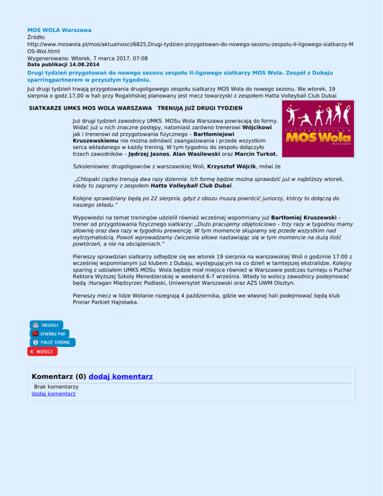 MOS WOLA Warszawa Źródło: http://www.moswola.pl/mos/aktualnosci/6825,Drugi-tydzien-przygotowan-do-nowego-sezonu-zespolu-II-ligowego-siatkarzy-M OS-Wol.html Wygenerowano: Wtorek, 7 marca 2017, 07:08 Data publikacji 14.08.2014 Drugi tydzień przygotowań do nowego sezonu zespołu II-ligowego siatkarzy MOS Wola. Zespół z Dubaju sparringpartnerem w przyszłym tygodniu. Już drugi tydzień trwają przygotowania drugoligowego zespołu siatkarzy MOS Wola do nowego sezonu. We wtorek, 19 sierpnia o godz.17,00 w hali przy Rogalińskiej planowany jest mecz towarzyski z zespołem Hatta Volleyball Club Dubai SIATKARZE UMKS MOS WOLA WARSZAWA TRENUJĄ JUŻ DRUGI TYDZIEŃ Już drugi tydzień zawodnicy UMKS MOSu Wola Warszawa powracają do formy. Widać już u nich znaczne postępy, natomiast zarówno trenerowi Wójcikowi jak i trenerowi od przygotowania fizycznego – Bartłomiejowi Kruszewskiemu nie można odmówić zaangażowania i przede wszystkim serca wkładanego w każdy trening. W tym tygodniu do zespołu dołączyło trzech zawodników – Jędrzej Jasnos, Alan Wasilewski oraz Marcin Turkot. Szkoleniowiec drugoligowców z warszawskiej Woli, Krzysztof Wójcik, mówi że „Chłopaki ciężko trenują dwa razy dziennie. Ich formę będzie można sprawdzić już w najbliższy wtorek, kiedy to zagramy z zespołem Hatta Volleyball Club Dubai. Kolejne sprawdziany będą po 22 sierpnia, gdyż z obozu muszą powrócić juniorzy, którzy to dołączą do naszego składu.” Wypowiedzi na temat treningów udzielił również wcześniej wspomniany już Bartłomiej Kruszewski – trener od przygotowania fizycznego siatkarzy: „Dużo pracujemy objętościowo – trzy razy w tygodniu mamy siłownię oraz dwa razy w tygodniu prewencję. W tym momencie skupiamy się przede wszystkim nad wytrzymałością. Powoli wprowadzamy ćwiczenia siłowe nastawiając się w tym momencie na dużą ilość powtórzeń, a nie na obciążeniach.” Pierwszy sprawdzian siatkarzy odbędzie się we wtorek 19 sierpnia na warszawskiej Woli o godzinie 17:00 z wcześniej wspomnianym już klubem z Dubaju, występującym na co dzień w tamtejszej ekstralidze. Kolejny sparing z udziałem UMKS MOSu Wola będzie miał miejsce również w Warszawie podczas turnieju o Puchar Rektora Wyższej Szkoły Menedżerskiej w weekend 6-7 września. Wtedy to wolscy zawodnicy podejmować będą :Huragan Międzyrzec Podlaski, Uniwersytet Warszawski oraz AZS UWM Olsztyn. Pierwszy mecz w lidze Wolanie rozegrają 4 października, gdzie we własnej hali podejmować będą klub Pronar Parkiet Hajnówka. Komentarz (0) dodaj komentarz Brak komentarzy dodaj komentarz