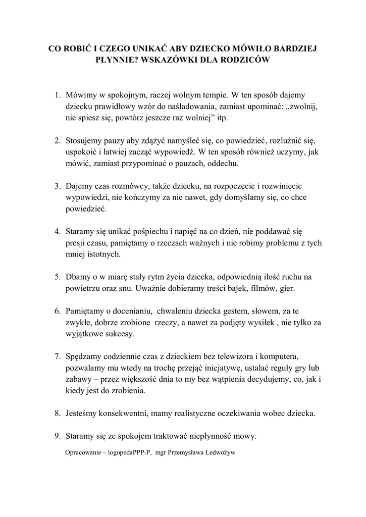 CO ROBIĆ I CZEGO UNIKAĆ ABY DZIECKO MÓWIŁO BARDZIEJ PŁYNNIE? WSKAZÓWKI DLA RODZICÓW 1. Mówimy w spokojnym, raczej wolnym tempie. W ten sposób dajemy dziecku prawidłowy wzór do naśladowania, zamiast upominać: „zwolnij, nie spiesz się, powtórz jeszcze raz wolniej” itp. 2. Stosujemy pauzy aby zdążyć namyśleć się, co powiedzieć, rozluźnić się, uspokoić i łatwiej zacząć wypowiedź. W ten sposób również uczymy, jak mówić, zamiast przypominać o pauzach, oddechu. 3. Dajemy czas rozmówcy, także dziecku, na rozpoczęcie i rozwinięcie wypowiedzi, nie kończymy za nie nawet, gdy domyślamy się, co chce powiedzieć. 4. Staramy się unikać pośpiechu i napięć na co dzień, nie poddawać się presji czasu, pamiętamy o rzeczach ważnych i nie robimy problemu z tych mniej istotnych. 5. Dbamy o w miarę stały rytm życia dziecka, odpowiednią ilość ruchu na powietrzu oraz snu. Uważnie dobieramy treści bajek, filmów, gier. 6. Pamiętamy o docenianiu, chwaleniu dziecka gestem, słowem, za te zwykłe, dobrze zrobione rzeczy, a nawet za podjęty wysiłek , nie tylko za wyjątkowe sukcesy. 7. Spędzamy codziennie czas z dzieckiem bez telewizora i komputera, pozwalamy mu wtedy na trochę przejąć inicjatywę, ustalać reguły gry lub zabawy – przez większość dnia to my bez wątpienia decydujemy, co, jak i kiedy jest do zrobienia. 8. Jesteśmy konsekwentni, mamy realistyczne oczekiwania wobec dziecka. 9. Staramy się ze spokojem traktować niepłynność mowy. Opracowanie – logopedaPPP-P, mgr Przemysława Ledwożyw
