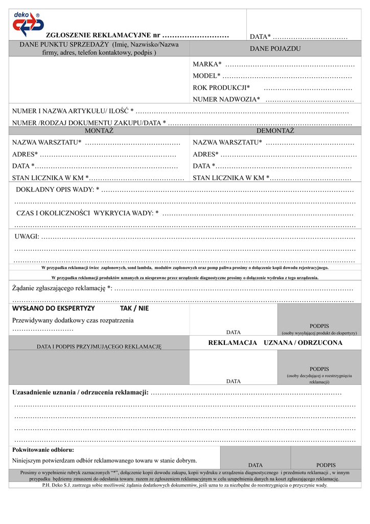 ZGŁOSZENIE REKLAMACYJNE nr ……………………… DANE PUNKTU SPRZEDAŻY (Imię, Nazwisko/Nazwa firmy, adres, telefon kontaktowy, podpis ) DATA* …………………………… DANE POJAZDU MARKA* ………………………………………………… MODEL* ………………………………………………… ROK PRODUKCJI* ………………………………… NUMER NADWOZIA* ………………………………… NUMER I NAZWA ARTYKUŁU/ ILOŚĆ * ………………………………………………………………………….……… NUMER /RODZAJ DOKUMENTU ZAKUPU/DATA * ……………………………………………………………………… MONTAŻ DEMONTAŻ NAZWA WARSZTATU* …………………………………… NAZWA WARSZTATU* ………………………………… ADRES* …………………………………………………… ADRES* …………………………………………………… DATA *……………………………………………………… DATA *…………………………………………………… STAN LICZNIKA W KM *…………………………………… STAN LICZNIKA W KM *……………………………… DOKŁADNY OPIS WADY: * ………………………………………………………………………………………………… …………………………………………………………………………………………………………………………………… CZAS I OKOLICZNOŚCI WYKRYCIA WADY: * ………………………………………………………………………… …………………………………………………………………………………………………………………………………… UWAGI: ………………………………………………………………………………………………………………………… …………………………………………………………………………………………………………………………………… …………………………………………………………………………………………………………………………………… W przypadku reklamacji świec zapłonowych, sond lambda, modułów zapłonowych oraz pomp paliwa prosimy o dołączenie kopii dowodu rejestracyjnego. W przypadku reklamacji produktów uznanych za niesprawne przez urządzenie diagnostyczne prosimy o dołączenie wydruku z tego urządzenia. Żądanie zgłaszającego reklamację *: …………………………………………………………………………………………… …………………………………………………………………………………………………………………………………… WYSŁANO DO EKSPERTYZY TAK / NIE Przewidywany dodatkowy czas rozpatrzenia ……………………… DATA I PODPIS PRZYJMUJĄCEGO REKLAMACJĘ PODPIS DATA (osoby wysyłającej produkt do ekspertyzy) REKLAMACJA UZNANA / ODRZUCONA PODPIS (osoby decydującej o rozstrzygnięciu reklamacji) DATA Uzasadnienie uznania / odrzucenia reklamacji: ………………………………………………………………………… …………………………………………………………………………………………………………………………………… …………………………………………………………………………………………………………………………………… …………………………………………………………………………………………………………………………………… …………………………………………………………………………………………………………………………………… Pokwitowanie odbioru: Niniejszym potwierdzam odbiór reklamowanego towaru w stanie dobrym. DATA PODPIS Prosimy o wypełnienie rubryk zaznaczonych “*”, dołączenie kopii dowodu zakupu, kopii wydruku z urządzenia diagnostycznego i przedmiotu reklamacji , w innym przypadku będziemy zmuszeni do odesłania towaru razem ze zgłoszeniem reklamacyjnym w celu uzupełnienia danych na koszt zgłaszającego reklamację. P.H. Deko S.J. zastrzega sobie możliwość żądania dodatkowych dokumentów, jeśli uzna to za niezbędne do rozstrzygnięcia o przyczynie wady.