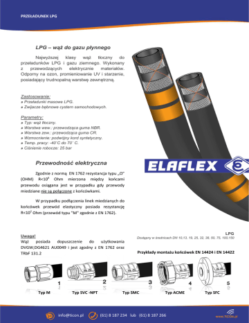 PRZEŁADUNEK LPG LPG – wąż do gazu płynnego Najwyższej klasy wąż tłoczny do przeładunków LPG i gazu ziemnego. Wykonany z przewodzących elektrycznie materiałów. Odporny na ozon, promieniowanie UV i starzenie, posiadający trudnopalną warstwę zewnętrzną. Zastosowanie: » Przeładunki masowe LPG. » Zwijacze bębnowe cystern samochodowych. Parametry: » Typ: wąż tłoczny. » Warstwa wew.: przewodząca guma NBR. » Warstwa zew.: przewodząca guma CR. » Wzmocnienie: podwójny kord syntetyczny. » Temp. pracy: -40˚C do 70˚ C. » Ciśnienie robocze: 25 bar Przewodność elektryczna Zgodnie z normą EN 1762 rezystancja typu „Ω” (OHM) R<106 Ohm mierzona między końcami przewodu osiągana jest w przypadku gdy przewody miedziane nie są połączone z końcówkami. W przypadku podłączenia linek miedzianych do końcówek przewód elastyczny posiada rezystancję R<102 Ohm (przewód typu "M" zgodnie z EN 1762). LPG Uwaga! Wąż posiada dopuszczenie do użytkowania DVGW;DG4621 AU0049 i jest zgodny z EN 1762 oraz TRbF 131.2 Typ M Typ SVC -NPT [email protected] Dostępny w średnicach DN 10,13, 19, 25, 32, 38, 50, 75, 100,150 Przykłady montażu końcówek EN 14424 i EN 14422 Typ SMC Typ ACME (61) 8 187 234 lub (61) 8 187 266 Typ SFC TICON N Węże i Szybkozłącza dla Przemysłu Kilka słów o firmie TICON Firma Ticon Sp. z o.o. powstała w 1996r. Naszym celem stało się dostarczanie profesjonalnych rozwiązań w zakresie doboru i sprzedaży węży przemysłowych, przewodów elastycznych, kompensatorów, armatury przemysłowej oraz urządzeń napełniająco-opróżniających. W naszej ofercie można znaleźć produkty renomowanych firm. Stosowane przez naszych dostawców najnowocześniejsze technologie dają gwarancję najwyższej jakości, trwałości i bezpieczeństwa. Wszyscy nasi dostawcy posiadają certyfikaty jakości serii ISO 9000 oraz liczne inne certyfikaty i dopuszczenia stosownie do wymogów krajowych i branżowych. Naszym atutem jest wszechstronność, bogata wiedza fachowa oraz posiadanie wszystkich wymaganych na polskim rynku uprawnień (TDT, WDT), certyfikatów itp. Dzięki temu Ticon cieszy się zaufaniem dużego kręgu stałych Klientów. Należą do nich największe w Polsce zakłady przemysłu petrochemicznego i rafineryjnego, zakłady chemiczne, firmy farmaceutyczne i kosmetyczne, dystrybutorzy i przewoźnicy paliw, zakłady przemysłu spożywczego i wiele innych firm o charakterze produkcyjnym. Staramy się sprostać wymaganiom wszystkich Klientów i odpowiedzieć na każde zapotrzebowanie. Oprócz standardowych produktów projektujemy, wykonujemy i dostarczamy zaprojektowane indywidualnie gotowe przewody oraz urządzenia napełniająco-opróżniające. Przeprowadzamy montaż i badania techniczne oraz serwis przewodów gotowych i urządzeń NO również bezpośrednio u Klienta (usługa Mobile Service). Stawiamy na profesjonalizm, najwyższą jakość i kompleksową obsługę naszych Klientów. Poszukujemy optymalnych rozwiązań. Ticon Sp. z o.o. Węże i Szybkozłącza dla Przemysłu Ul. Poznańska 37 62-020 Swarzędz, Jasin NIP 781-10-98-120 Sekretariat tel. (61) 81 87 230 Fax (61) 81 87 231 Strona internetowa: http://ticon.pl Sklep internetowy: http://sklep.ticon.pl Dział Handlowy Tel. (61) 81 87 234 Tel. (61) 81 87 266 Tel. (61) 81 87 248 Węże i przewody Gumowe, tworzywowe, teflonowe, metalowe, kompozytowe, silikonowe. Wyposażenie terminali Urządzania Napełniająco-Opróżniające, podesty konstrukcyjne, ramiona przeładunkowe, schodki. Armatura przemysłowa Złącza i adaptory, szybkozłącza, złącza awaryjnego rozłączania, końcówki do węży, obejmy mocujące, zawory, pistolety nalewcze. Kompensatory Gumowe, stalowe, teflonowe, tkaninowe. Części i akcesoria Uszczelki, zestawy naprawcze, węże osłonowe, pistolety do wody, zawiesia do węży, pasy uziemiające itp. Serwis Dysponujemy mobilnym serwisem urządzeń NO i przewodów elastycznych. Usługi projektowe Projekt, dostawa, montaż elementów oporowych do złączy awaryjnego rozłączania. Uzgodnienie dokumentacji projektowej w TDT. Badania odbiorowe w obecności inspektora TDT. Przygotowanie dokumentacji rejestracyjnej urządzenia NO.