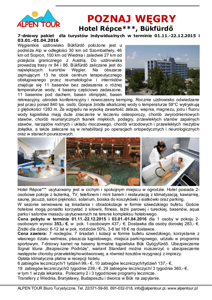 POZNAJ WĘGRY Hotel Répce***, Bükfürdő 7-dniowy pakiet dla turystów indywidualnych w terminie 01.11.-22.12.2015 i 03.01.-01.04.2016 Węgierskie uzdrowisko Bükfürdő położone jest u podnóża Alp w odległości 30 km od Szombathely, 46 km od Sopron, 100 km od Wiednia i zaledwie 27 km od przejścia granicznego z Austrią. Do uzdrowiska prowadzą trasy nr 84 i 86. Bükfürdő zaliczane jest do największych kurortów Węgier. Na obszarze zajmującym 13 ha obok centrum terapeutycznego obsługiwanego przez reumatologów i internistów znajduje się 11 basenów bez zadaszenia o różnej temperaturze wody, 4 baseny częściowo zadaszone, 11 basenów pod dachem, basen olimpijski, basen rekreacyjny, ośrodek konferencyjny i nowoczesny kemping. Rocznie uzdrowisko odwiedzane jest przez ponad 840 tys. osób. Gorące źródła alkalicznej wody o temperaturze 58°C wytryskują z głębokości 1283 m. Ze względu na wysoką zawartość żelaza, wapnia, magnezu, jodu i fluoru wody kąpieliska mają duże znaczenie w leczeniu osteoporozy, chorób zwyrodnieniowych stawów, chorób reumatycznych tkanek miękkich, podagry, przewlekłych stanów zapalnych stawów, narządów rodnych i układu moczowego, chorób wrzodowych i przewlekłych nieżytów żołądka, a także zalecane są w rehabilitacji po operacjach ortopedycznych i neurologicznych oraz w stanach pourazowych. Hotel Répce*** usytuowany jest w cichym i spokojnym miejscu w ogrodzie. Hotel posiada 2osobowe pokoje z łazienką, TV, telefonem i mini barem i restauracją z klimatyzacją, kawiarnię, saunę, jacuzzi, salon piękności, solarium, boiska do koszykówki i siatkówki oraz parking. W sezonie serwowane są śniadania i obiadokolacje w formie szwedzkiego bufetu. Goście hotelowi mogą ponadto korzystać z siłowni, fitness, łaźni parowej i tureckiej, basenów, aqua parku i salonów masażu usytuowanych na terenie kompleksu hotelowego. Cena pobytu w terminie 01.11.-22.12.2015 i 03.01.-01.04.2016 dla 1 osoby w pokoju 2osobowym wynosi 353,- €, w pok. 1-osobowym 437,- €. Dostawka dla osoby dorosłej 283,- €. Zniżki dla dzieci: 6-12 lat w pok. rodziców 50%, 3-6 lat 18 € na dostawce. Cena zawiera: 7 noclegów, 7 śniadań i kolacji w formie bufetu szwedzkiego, korzystanie z własnego działu wellness, płaszcza kąpielowego, miejsca parkingowego, udziału w programie sportowym, 7-dniowy karnet na baseny termalne kąpieliska Bük Gyógyfürdő. Ubezpieczenie Signal Iduna „Bezpieczne Podróże”, wariant Standard można rozszerzyć o ubezpieczenie następstw choroby przewlekłej/nowotworowej, a również kosztów rezygnacji z imprezy. Opłata klimatyczna płatna w recepcji hotelu. 6 zabiegów leczniczych/1 tydzień 99,- €, 10 zabiegów leczniczych/tydzień 137,- €, 19 zabiegów leczniczych/2 tygodnie 239,- €, 29 zabiegów leczniczych/ 3 tygodnie 360,- €, w tym 1 wizyta lekarska. Polecamy 2 i 3 tygodniowe programy lecznicze. Transfery z Wiednia, Bratysławy, Budapesztu i dworca w Bük na zapytanie. ALPEN TOUR Biuro Turystyczne, Tel. 22/371-59-60, 691-032-018, [email protected], www.alpentour.pl