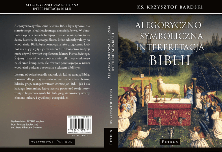 Alegoryczno-symboliczna interpretacja Biblii ISBN 978-83-7720-377-4 Wydawnictwo PETRUS wspiera Dom Pomocy Społecznej św. Brata Alberta w Ojcowie www.WydawnictwoPetrus.pl cena det. 29,00 zł Alegoryczno-symboliczna interpretacja Biblii Lektura obowiązkowa dla wszystkich, którzy czytają Biblię. Zarówno dla profesjonalistów – duszpasterzy, katechetów, liderów grup, zaangażowanych chrześcijan, itd. – jak i dla każdego humanisty, który zechce poszerzyć swoje horyzonty o bogactwo symboliki biblijnej, stanowiącej istotny element kultury i cywilizacji europejskiej. Ks. Krzysztof Bardski Alegoryczno-symboliczna lektura Biblii była typowa dla starożytnego i średniowiecznego chrześcijaństwa. W obrazach i opowiadaniach biblijnych szukano nie tylko świadectw historii, ale żywego Słowa, które oddziaływałoby na wyobraźnię. Biblia była postrzegana jako drogocenny klejnot mieniący się tysiącami znaczeń. To bogactwo tradycji może ożywić również współczesną lekturę Pisma Świętego. Żyjemy przecież w erze obrazu nie tylko wyświetlanego na ekranie komputera, ale również powstającego w naszej wyobraźni podczas obcowania z tekstem biblijnym. K s. K r z y s z t o f B a r d s k i Alegoryczno-symboliczna interpretacja Biblii
