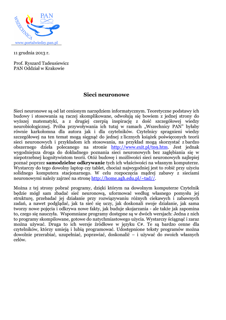 www.portalwiedzy.pan.pl 11 grudnia 2013 r. Prof. Ryszard Tadeusiewicz PAN Oddział w Krakowie Sieci neuronowe Sieci neuronowe są od lat cenionym narzędziem informatycznym. Teoretyczne podstawy ich budowy i stosowania są raczej skomplikowane, odwołują się bowiem z jednej strony do wyższej matematyki, a z drugiej czerpią inspirację z dość szczegółowej wiedzy neurobiologicznej. Próba przywoływania ich tutaj w ramach „Wszechnicy PAN” byłaby równie karkołomna dla autora jak i dla czytelników. Czytelnicy spragnieni wiedzy szczegółowej na ten temat mogą sięgnąć do jednej z licznych książek poświęconych teorii sieci neuronowych i przykładom ich stosowania, na przykład mogą skorzystać z bardzo obszernego dzieła polecanego na stronie http://www.exit.pl/tn9.htm. Jest jednak wygodniejsza droga do dokładnego poznania sieci neuronowych bez zagłębiania się w niepotrzebnej kognitywistom teorii. Otóż budowę i możliwości sieci neuronowych najlepiej poznać poprzez samodzielne odkrywanie tych ich właściwości na własnym komputerze. Wystarczy do tego dowolny laptop czy tablet, chociaż najwygodniej jest to robić przy użyciu solidnego komputera stacjonarnego. W celu rozpoczęcia mądrej zabawy z sieciami neuronowymi należy zajrzeć na stronę http://home.agh.edu.pl/~tad//. Można z tej strony pobrać programy, dzięki którym na dowolnym komputerze Czytelnik będzie mógł sam zbadać sieć neuronową, uformować według własnego pomysłu jej strukturę, przebadać jej działanie przy rozwiązywaniu różnych ciekawych i zabawnych zadań, a nawet podglądać, jak ta sieć się uczy, jak doskonali swoje działanie, jak sama tworzy nowe pojęcia i odkrywa nowe fakty, jak buduje skojarzania - ale także jak zapomina to, czego się nauczyła. Wspomniane programy dostępne są w dwóch wersjach: Jedna z nich to programy skompilowane, gotowe do natychmiastowego użycia. Wystarczy ściągnąć i zaraz można używać. Druga to ich wersje źródłowe w języku C#. Te są bardzo cenne dla czytelników, którzy umieją i lubią programować. Udostępnione teksty programów można dowolnie przerabiać, uzupełniać, poprawiać, doskonalić – i używać do swoich własnych celów. www.portalwiedzy.pan.pl Sieci neuronowe powstały w taki sposób, że ludzi od wieków fascynował biologiczny mózg (człowieka lub zwierząt - oznaczenie A na rysunku powyżej). Badania naukowe biologów (B) dostarczyły wielu szczegółowych wyników na temat mózgu, które stały się źródłem obszernej współcześnie dostępnej wiedzy o mózgu, która jednak w tej postaci, w jakiej wyłania się z badań biologów jest trudna do całościowego ogarnięcia i do interpretacji. Wiedza biologiczna o mózgu jest gromadzona jako wartość sama w sobie, dodatkowo staje się ona jednak podstawą analiz, prowadzonych przez biocybernetyków (C), którzy na tej podstawie zbudowali wiele modeli matematycznych, opisujących mózg i jego działanie (D). Opierając się na tych modelach matematycznych neurocybernetycy zbudowali z kolei sieci neuronowe, najpierw jako specjalizowane układy elektroniczne (E), ale obecnie najczęściej symulowane za pomocą odpowiednich programów w strukturach zwykłych komputerów (F). Na tych sieciach można prowadzić różne badania, eksperymenty, analizy – w związku z tym być może z pomocą tego narzędzia uda się lepiej zrozumieć działanie rzeczywistego mózgu. Ale głównie sieci neuronowe wykorzystywane są jako narzędzia do rozwiązywania problemów informatycznych, zgodnie ze schematem pokazanym poniżej. www.portalwiedzy.pan.pl Kluczowym elementem przy stosowaniu sieci neuronowych, jest proces ich uczenia. Schemat przykładowego procesu uczenia sieci pokazano na rysunku poniżej, przy czym rysunek ten dotyczy trochę nietypowego (chociaż łatwego do narysowania) przykładu nabywanie przez sieć umiejętności klasyfikowania przedstawianych jej ludzkich twarzy, które trzeba klasyfikować jako twarze mężczyzn lob kobiet. W rzeczywistości sieci neuronowe uczą się zadań o wiele poważniejszych i związanych z licznymi ważnymi praktycznymi zadaniami. O tym wszystkim będzie mowa w trakcie wykładu.