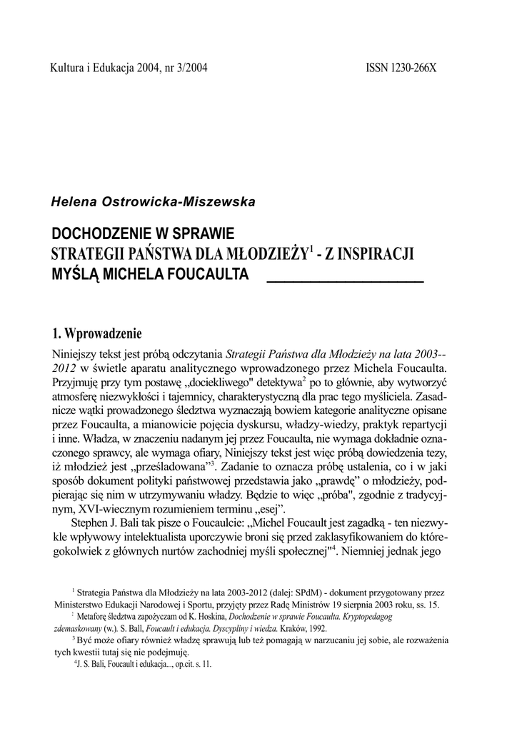 Kultura i Edukacja 2004, nr 3/2004 ISSN 1230-266X Helena Ostrowicka-Miszewska DOCHODZENIE W SPRAWIE STRATEGII PAŃSTWA DLA MŁODZIEŻY1 - Z INSPIRACJI MYŚLĄ MICHELA FOUCAULTA __________________ 1. Wprowadzenie Niniejszy tekst jest próbą odczytania Strategii Państwa dla Młodzieży na lata 2003-2012 w świetle aparatu analitycznego wprowadzonego przez Michela Foucaulta. Przyjmuję przy tym postawę „dociekliwego" detektywa2 po to głównie, aby wytworzyć atmosferę niezwykłości i tajemnicy, charakterystyczną dla prac tego myśliciela. Zasadnicze wątki prowadzonego śledztwa wyznaczają bowiem kategorie analityczne opisane przez Foucaulta, a mianowicie pojęcia dyskursu, władzy-wiedzy, praktyk repartycji i inne. Władza, w znaczeniu nadanym jej przez Foucaulta, nie wymaga dokładnie oznaczonego sprawcy, ale wymaga ofiary, Niniejszy tekst jest więc próbą dowiedzenia tezy, iż młodzież jest „prześladowana”3. Zadanie to oznacza próbę ustalenia, co i w jaki sposób dokument polityki państwowej przedstawia jako „prawdę” o młodzieży, podpierając się nim w utrzymywaniu władzy. Będzie to więc „próba", zgodnie z tradycyjnym, XVI-wiecznym rozumieniem terminu „esej”. Stephen J. Bali tak pisze o Foucaulcie: „Michel Foucault jest zagadką - ten niezwykle wpływowy intelektualista uporczywie broni się przed zaklasyfikowaniem do któregokolwiek z głównych nurtów zachodniej myśli społecznej"4. Niemniej jednak jego 1 Strategia Państwa dla Młodzieży na lata 2003-2012 (dalej: SPdM) - dokument przygotowany przez Ministerstwo Edukacji Narodowej i Sportu, przyjęty przez Radę Ministrów 19 sierpnia 2003 roku, ss. 15. 2 Metaforę śledztwa zapożyczam od K. Hoskina, Dochodzenie w sprawie Foucaulta. Kryptopedagog zdemaskowany (w.). S. Ball, Foucault i edukacja. Dyscypliny i wiedza. Kraków, 1992. 3 Być może ofiary również władzę sprawują lub też pomagają w narzucaniu jej sobie, ale rozważenia tych kwestii tutaj się nie podejmuję. 4 J. S. Bali, Foucault i edukacja..., op.cit. s. 11. 20 __________________________________Helena Ostrowicka-Miszewska twórczość inspiruje filozofów, psychologów, socjologów, kryminologów, pedagogów i nie tylko. Prace autora Archeologii wiedzy burzą poczucie oczywistości, zwracając uwagę na tajemniczość tego, co pozornie zwyczajne i znane. Jego twórczość wnosi też ciekawe spojrzenie na politykę państwa. Wedle Foucaulta (1995) zainteresowanie istotą wiedzy doprowadziło do podważania założeń dotyczących jej pewności i „dekonstrukcji” poddano zarówno „dyscypliny” wytwarzające wiedzę, jak i „prawdę" przez nie kreowaną5. Wydaje się, iż zainteresowanie to jest tym bardziej istotne przy „dekonstrukcji” tekstów oficjalnej polityki państwa, W polityce państwowej uobecnia się bowiem dążenie do przedstawiania świata w kategoriach „naturalnych" i oczywistych faktów. W książkach Nadzorować i karać (1998) oraz w pierwszym tomie Historii seksualności (1995) demaskuje Foucault ukryte formy represji i normalizacji6. Centralnym motywem w twórczości Foucaulta jest analiza określonych idei i procesów, w wyniku których nabrały one normatywnego i uniwersalnego charakteru. Podstawową kategorią pojęciową jest dyskurs, który odnosi się do tego, kto, co, gdzie i kiedy mówi oraz jaki zakres władzy posiada osoba mówiąca. Według Foucaulta dyskursy są „praktykami formułującymi przedmioty, o których owe dyskursy mówią"7. Tak rozumiane dyskursy kształtowane są m.in. przez czynniki instytucjonalne, społeczne i światopoglądowe, które mają wpływ na przedmiot, formę lub wybór tematyki wypowiedzi oraz na to, kto i z jakiej pozycji je formułuje8. Gdyby uznać, że dyskursy ustanawiane są nie tylko przez to, co zawierają, ale także przez to, co pomijają, rozważmy, jaki jest świat w obrębie dyskursu upowszechnianego przez tzw. politykę młodzieżową państwa. Zgodnie z intencją Foucaulta9 chodzi mi tu o dociekanie rządzących dyskursem Strategii... reguł i odkrycie ich struktury. 2. „Dekonstrukcja" tekstu Dokument rozpoczyna się od wyjaśnienia, w czyni wyraża się tzw. polityka młodzieżowa Polski. Na początku można odnieść wrażenie, iż rzecz dotyczy tylko „uregulowań prawnych" i „przepisów” dotyczących młodzieży. Dalej czytamy jednak: „Polityka młodzieżowa uznawana jest w krajach europejskich za międzyresortową, zintegrowaną politykę wobec młodych ludzi, wywodzącą się z ich potrzeb. Celem polityki mło- 5 M. Foucault, Historia seksualności, Warszawa 1995 Idem, Nadzorować i karać: narodziny więzienia” Warszawa 1998; idem, Historia seksualności, op.cit 7 Idem, Archeologia wiedzy. Warszawa 1977, s. 76. 8 D. Leszczyński, L. Rasiński, Wstęp [w:l M. Foucault, Filozofia, historia, polityka. Wybór pism, Warszawa-Wrocław 2000. 9 2a; J. Szacki, Historia myśli socjologicznej. Wydanie nowe> Warszawa 2002. 6 Dochodzenie w sprawie Strategu Państwa dla Młodzieży..._______________ 21 dzieżowej jest stworzenie odpowiednich warunków bytowych dla młodych ludzi, umożliwienie im uczestnictwa w życiu publicznym, udziału w życiu społecznym, kulturalnym i politycznym na równi z innymi grupami społecznymi (...) Wybór priorytetów spośród tych zagadnień zależy od potrzeb (czyich? - dop. H. O.-M.) i możliwości poszczególnych państw"10. Cytat ten sygnalizuje już we wstępie, jakie jest uzasadnienie dla „polityki młodzieżowej" państwa oraz „stworzenia koordynatora tych działań”. Misję tę przyjmują osoby skupione wokół StrategiL. Oficjalnie to Biuro ds. Młodzieży koordynuje i monitoruje realizację Strategii... Jak informuje nas na swojej strome internetowej, „współpracuje ono w tym zakresie z innymi resortami, jednostkami samorządu terytorialnego, instytucjami pracującymi na rzecz młodzieży i organizacjami pozarządowymi, szczególnie młodzieżowymi". To oni „posiadają dyskurs