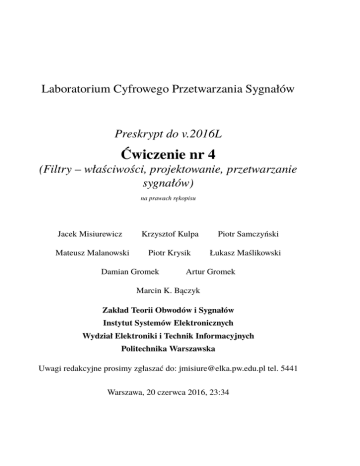 Laboratorium Cyfrowego Przetwarzania Sygnałów Preskrypt do v.2016L Ćwiczenie nr 4 (Filtry – właściwości, projektowanie, przetwarzanie sygnałów) na prawach rękopisu Jacek Misiurewicz Krzysztof Kulpa Mateusz Malanowski Piotr Krysik Damian Gromek Piotr Samczyński Łukasz Maślikowski Artur Gromek Marcin K. Bączyk Zakład Teorii Obwodów i Sygnałów Instytut Systemów Elektronicznych Wydział Elektroniki i Technik Informacyjnych Politechnika Warszawska Uwagi redakcyjne prosimy zgłaszać do: [email protected] tel. 5441 Warszawa, 20 czerwca 2016, 23:34 Spis treści 4 Filtry – właściwości, projektowanie, przetwarzanie sygnałów 4.1 Podstawy teoretyczne . . . . . . . . . . . . . . . . . . . . . . . . . . . . . . 4.1.1 Uśrednianie z wagami czyli filtry SOI (FIR) . . . . . . . . . . . . . . 4.1.2 Sprzężenie zwrotne czyli filtry NOI (IIR) . . . . . . . . . . . . . . . 4.1.3 Projektowanie filtrów . . . . . . . . . . . . . . . . . . . . . . . . . . 4.1.4 Triki implementacyjne . . . . . . . . . . . . . . . . . . . . . . . . . 4.1.5 Zadania do pracy własnej studenta . . . . . . . . . . . . . . . . . . . 4.2 Dostępny sprzęt i oprogramowanie . . . . . . . . . . . . . . . . . . . . . . . R 4.2.1 Standardowe funkcje MATLABa⃝ . . . . . . . . . . . . . . . . . . 4.3 Eksperymenty do wykonania w laboratorium – projektowanie i wykorzystanie filtrów cyfrowych . . . . . . . . . . . . . . . . . . . . . . . . . . . . . . . . 4.3.1 Filtr SOI i NOI, związek zer i biegunów z charakterystyką . . . . . . 4.3.2 Bezpośrednie projektowanie filtrów SOI – metoda obcięcia szeregu Fouriera . . . . . . . . . . . . . . . . . . . . . . . . . . . . . . . . . 4.3.3 Ekstra Projektowanie filtrów SOI metodą optymalizacyjną . . . . . . 4.3.4 Projektowanie filtrów NOI z prototypu analogowego . . . . . . . . . 4.3.5 Realizacja filtrów i zastosowania filtrów . . . . . . . . . . . . . . . . 2 3 3 3 5 7 12 16 16 16 17 17 19 22 22 23 Ćwiczenie 4 Filtry – właściwości, projektowanie, przetwarzanie sygnałów Opiekun ćwiczenia: PK i ŁM 4.1. Podstawy teoretyczne Najczęściej spotykane filtry cyfrowe są to układy liniowe i stacjonarne – a więc składają się z operacji liniowych wykonywanych na przetwarzanym sygnale: opóźnienia, mnożenia przez stałą, sumowania. W uzasadnionych przypadkach stosuje się inne filtry – nieliniowe albo niestacjonarne, ale ich analiza jest znacznie trudniejsza. W opisie filtrów liniowych i stacjonarnych można stosować takie bardzo przydatne pojęcia jak: – odpowiedź impulsowa h[n] – transmitancja H(z) albo H(ejθ ) – charakterystyki częstotliwościowe1 : – amplitudowa A(θ) = |H(ejθ )| – fazowa ϕ(θ) = arg H(ejθ ) . – opóźnienie grupowe τ (θ) = − dϕ(θ) dθ Należy zauważyć, że fizyczne realizacje filtrów cyfrowych są liniowe tylko w przybliżeniu – pracują na sygnałach skwantowanych, mnożenie wykonują ze skończoną precyzją, i mają ograniczony zakres przetwarzanych liczb. 4.1.1. Uśrednianie z wagami czyli filtry SOI (FIR) Najprostsze w realizacji i w analizie oraz projektowaniu są filtry, w których pewna liczba przeszłych próbek jest zapamiętywana a następnie sumowana z wagami (rys. 4.1). Zauważ, że na schematach filtrów z −1 oznacza opóźnienie sygnału o jedną próbkę. 1 Po angielsku najczęsciej używa się terminu “frequency response”, a więc “odpowiedź częstotliwościowa”; po polsku zamiast amplitudowa charakterystyka częstotliwościowa często pisze się się skrótowo “charakterystyka amplitudowa” albo “charakterystyka częstotliwościowa”. Oczywiście najbardziej poprawnie jest używać terminu dokładnego. 3 4 Filtry – właściwości, projektowanie, przetwarzanie sygnałów 2016-06-20 23:34 Rys. 4.1: Filtr SOI w strukturze transwersalnej Jak łatwo sobie wyobrazić, patrząc na rysunek, filtr taki realizuje bezpośrednio splot sygnału wejściowego z ciągiem b[k] = {b0 , b1 , b2 , b3 }. y(n) = K X x(n − k)b(k) (4.1) k=0 To oznacza, że ciąg współczynników b[k] jest po prostu odpowiedzią impulsową tego filtru, i jest to filtr o skończonej odpowiedzi impulsowej – SOI (a po angielsku: Finite Impulse Response – FIR). W tym wypadku długość odpowiedzi wynosi 4. Gdy przypomnimy sobie, że splot w dziedzinie czasu odpowiada mnożeniu w dziedzinie widma2 , zobaczymy w okamgnieniu, że charakterystyka częstotliwościowa filtru to transformata Fouriera jego odpowiedzi impulsowej – a w przypadku filtru SOI ciągu jego współczynników. Spróbujmy zapisać równanie (4.1) w dziedzinie przekształcenia Z. Przekształcenie Z jest liniowe – to znaczy, że sumowanie i skalowanie (sygnałów) w dziedzinie n można przenieść na takie same operacje (na transformatach tych sygnałów) w dziedzinie z. Natomiast opóżnieniu w dziedzinie czasu x(n − n0 ) odpowiada mnożenie X(z) przez z −n0 . Otrzymujemy więc Y (z) = K X X(z) · z −k b(k) (4.2) k=0 Ciągu współczynników bk na razie nie przekształcamy – z punktu widzenia sygnału to są stałe skalujące! Możemy jednak wyciągnąć X(z) przed sumę (to jest bardzo przydatna własność przekształcenia Z – możliwość rozdzielenia operatora opóżnienia od transformaty sygnału) Y (z) = X(z) K X z −k b(k) = X(z) · H(z) (4.3) k=0 −k W ten sposób zobaczyliśmy, że H(z) = K – czyli H(z) jest to transformata Z k=0 b(k)z odpowiedzi impulsowej filtru (a dla filtru SOI – ciągu jego współczynników). Gdyby więc b[n] = 1, − 3, 3, − 1, to H(z) = 1 − 3z −1 + 3z −2 − z −3 . Jest to wielomian rzędu 3 (liczy się najwyższa potęga z −1 ), czyli mamy do czynienia z filtrem rzędu 3. Zauważ, że filtr SOI rzędu 3 ma 3 bloki opóźnienia, ale 4 współczynniki. P 2 Uwaga, to jest proste dla sygnałów o ograniczonej energii (z widmem ciągłym – i o takich sygnałach tu mówimy) – jeśli widmo jest dyskretne, splot w dziedzinie czasu musi być splotem kołowym (okresowym). Fi