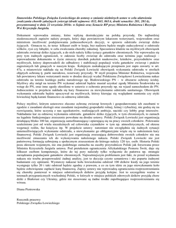 Stanowisko Polskiego Związku Łowieckiego do ustawy o zmianie niektórych ustaw w celu ułatwienia zwalczania chorób zakaźnych zwierząt (druki sejmowe: 832, 865, 865A, druki senackie: 281, 281A), prezentowanej w dniu 22 września 2016r. w Sejmie oraz Senacie RP przez Ministra Rolnictwa i Rozwoju Wsi Krzysztofa Jurgiela. Dokument wprowadza zmiany, które wpłyną destrukcyjnie na polską przyrodę. Do najbardziej niedorzecznych zapisów należy przepis, który daje powiatowym lekarzom weterynarii, wojewodom oraz ministrom możliwość podejmowania jednoosobowych decyzji, w sprawie odstrzału zwierząt dziko żyjących. Oznacza to, że teraz kilkaset osób w kraju, bez nadzoru będzie mogło zadecydować o odstrzale wilków, rysi czy łabędzi, w celu zwalczania choroby zakaźnej. Specustawa kładzie na myśliwych obowiązek odstrzału zwierząt dziko żyjących, a do nich należy kilka tysięcy gatunków chronionych. Nie wprowadza się przy tym żadnych ograniczeń, w zakresie liczby zwierząt do odstrzału oraz terminu jego realizacji – wprowadzenie dokumentu w życie zniszczy dorobek pokoleń naukowców, leśników, przyrodników oraz myśliwych, którzy doprowadzili do odbudowy i stabilizacji populacji wielu gatunków zwierząt i ptaków zagrożonych lub ginących w naszym kraju. Kolejnym zaskakującym przepisem jest zapis zawarty w art. 47a, a mianowicie nakłada się na Polski Związek Łowiecki obowiązek wykonania odstrzału w strefach objętych ochroną tj. parki narodowe, rezerwaty przyrody. W myśl przepisu Minister Rolnictwa, wojewoda lub powiatowy lekarz weterynarii może w drodze decyzji wydać Polskiemu Związkowi Łowieckiemu nakaz odstrzału na terenie każdego parku narodowego np. Białowieskiego PN - w obszarze ochrony ścisłej. Myśliwy aby mógł na terenie PN wykonać odstrzał będzie musiał uzyskać zgodę Ministra Środowiska na wstęp do PN, oraz inne zgody określone w ustawie o ochronie przyrody np. na wjazd samochodem do PN. Jednocześnie w projekcie nakłada się kary finansowe za niewykonanie odstrzału sanitarnego. Obowiązek wykonania odstrzału będzie spoczywał na myśliwych, którzy kierując się względami sumienia czy etyki łowieckiej będą karani finansowo za odmowę odstrzału. Polscy myśliwi, którym ustawowo zlecono ochronę zwierząt łownych i gospodarowanie ich zasobami w zgodzie z zasadami ekologii oraz zasadami racjonalnej gospodarki rolnej, leśnej i rybackiej, nie godzą się na rozwiązania, które uczynią z nas egzekutorów, realizujących ambicje, naciski czy lobby grup interesów. Nakładanie kar za odmowę wykonania odstrzału gatunków dziko żyjących, w tym chronionych, to zamach na legalnie funkcjonujące zrzeszenie powołane na drodze ustawy. Polski Związek Łowiecki jest organizacją działającą blisko 100 lat, organizacją samofinansującą i opierającą się na pracy swoich członków. Polowanie uzależnione jest od wielu niezależnych od człowieka czynników w tym np. atmosferycznych, od okresu wegetacji roślin, faz księżyca itp. W projekcie ustawy natomiast nie uwzględnia się żadnych sytuacji uniemożliwiających wykonanie odstrzału, a niewykonanie go obligatoryjnie wiąże się to nałożeniem kary finansowej. Polski Związek Łowiecki jest organizacją zrzeszającą dobrowolnie swoich członków nie ma możliwość zmuszania ich do wykonywania nałożonego nakazu. Polski Związek Łowiecki nie jest państwową formacją uzbrojoną a społecznym zrzeszeniem do którego należy 120 tys. osób. Historia Polski poza okresem wojennym, nie zna podobnego zamachu na zasoby przyrodnicze Polski jak forsowana przez Ministra Krzysztofa Jurgiela ustawa. Pod pretekstem ograniczenia Afrykańskiego Pomoru Świń, daje się kilkuset osobom kompetencje, które do tej pory należały tylko wyłącznie do państwa np. strategie zarządzania populacjami gatunków chronionych. Najważniejszym problemem jest fakt, że przed wydaniem nakazu nie trzeba przeprowadzić żadnej analizy, jest to decyzja czysto uznaniowa i nie poparta żadnymi badaniami czy opiniami. Wystarczy nakazać kołu łowieckiemu odstrzał 100 dzików kiedy na jego terenie występuje tylko 20 i taki odstrzał będzie zgodny z prawem, a co za tym idzie za jego niewykonanie koło będzie zobowiązane zapłacić karę finansową. Zapisy ustawy nie wprowadzą ograniczenia rozprzestrzeniania się choroby ponieważ w miejsce odstrzelonych dzików przyjdą kolejne. Jest to szczególnie ważne w terenach przygranicznych wschodniej Polski, w których w miejsce polskich zdrowych dzików przyjdą chore dziki z Białorusi czy Ukrainy, gdzie nie stosowane są żadne środki zapobiegające rozprzestrzenianiu się wirusa. Diana Piotrowska Rzecznik prasowy Polskiego Związku Łowieckiego