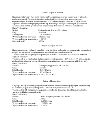 Taśma z klejem Hot-Melt Kauczuk syntetyczny (hot-melt) (termotopliwy) przeznaczony do stosowania w taśmach opakowaniowych. Taśmy te charakteryzują się niższą odpornością temperaturową, odpornością na działanie promieniowania UV i odpornością na starzenie. Klej Hot-Melt zapewnia bardzo dobre przyklejanie taśmy do różnego rodzaju kartonowych powierzchni. Taśma na folii BOPP (polipropylen orientowany dwuosiowo) odpornej na rozdarcia. Dane Techniczne: Nośnik: Folia polipropylenowa 28 –30 um Klej: Hot-Melt Siła klejenia: 12,5 N/25 mm Wytrzymałość na zerwanie: 100 N/25 mm Wytrzymałość na temperaturę: + 60° C Rozciągliwość: 120% Taśma z klejem Solvent Kauczuk naturalny (solvent) charakteryzuje się dobrą lepkością, przyczepnością, posiadając z drugiej strony ograniczoną odporność na działanie promieniowania UV. Taśma na folii PP polipropylen odpornej na rozdarcia. Doskonała do zaklejania lekkich i ciężkich kartonów. Taśma na kleju solvent dzięki dużemu zakresowi temperatur (-30° C do +110° C) nadaje się doskonale do użycia w przemyśle gdzie występują niskie temperatury (np. chłodnie, itp.). Dane Techniczne: Nośnik: Folia polipropylenowa 28 – 30 um Klej: solvent Siła klejenia: 5,0N/25 mm Wytrzymałość na zerwanie: 95 N/25 mm Wytrzymałość na temperaturę: - 30° C do + 110° C Taśma z klejem Akryl Klej tego rodzaju charakteryzuje się doskonałymi właściwościami spajającymi, odpornością na starzenie, nagłe zmiany temperatur i na działanie promieniowania UV. Taśma na folii PP polipropylen odporna na rozdarcia, doskonała do zaklejania kartonów, wymaga dokładnego przyklejania. Dane Techniczne: Nośnik: Folia polipropylenowa 28 – 30 um Klej: akryl Siła klejenia: 6,0 N/25 mm Wytrzymałość na zerwanie: 75 N/25 mm Wytrzymałość na temperaturę: + 60° C