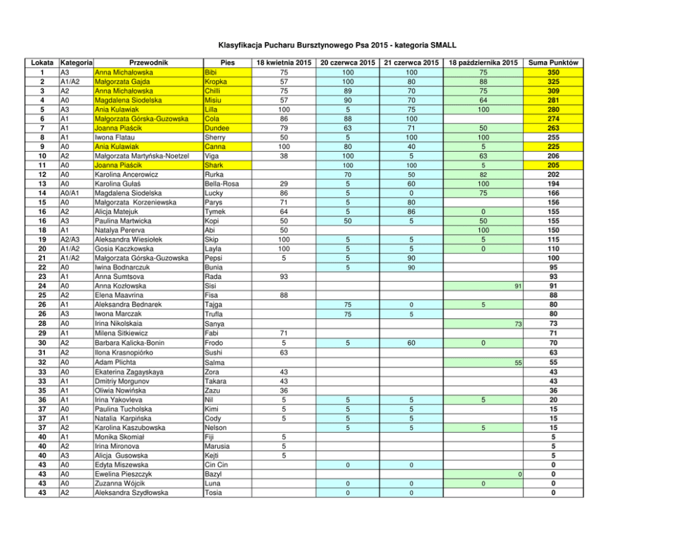 Klasyfikacja Pucharu Bursztynowego Psa 2015 - kategoria SMALL Lokata 1 2 3 4 5 6 7 8 9 10 11 12 13 14 15 16 16 18 19 20 21 22 23 24 25 26 26 28 29 30 31 32 33 33 35 36 37 37 37 40 40 40 43 43 43 43 Kategoria A3 A1/A2 A2 A0 A3 A1 A1 A1 A0 A2 A0 A0 A0 A0/A1 A0 A2 A3 A1 A2/A3 A1/A2 A1/A2 A0 A1 A0 A2 A1 A3 A0 A1 A2 A2 A0 A0 A1 A1 A1 A0 A1 A2 A1 A2 A3 A0 A0 A0 A2 Przewodnik Anna Michałowska Małgorzata Gajda Anna Michałowska Magdalena Siodelska Ania Kulawiak Małgorzata Górska-Guzowska Joanna Piaścik Iwona Flatau Ania Kulawiak Małgorzata Martyńska-Noetzel Joanna Piaścik Karolina Ancerowicz Karolina Gułaś Magdalena Siodelska Małgorzata Korzeniewska Alicja Matejuk Paulina Martwicka Natalya Pererva Aleksandra Wiesiołek Gosia Kaczkowska Małgorzata Górska-Guzowska Iwina Bodnarczuk Anna Sumtsova Anna Kozłowska Elena Maavrina Aleksandra Bednarek Iwona Marczak Irina Nikolskaia Milena Sitkiewicz Barbara Kalicka-Bonin Ilona Krasnopiórko Adam Plichta Ekaterina Zagayskaya Dmitriy Morgunov Oliwia Nowińska Irina Yakovleva Paulina Tucholska Natalia Karpińska Karolina Kaszubowska Monika Skomiał Irina Mironova Alicja Gusowska Edyta Miszewska Ewelina Pieszczyk Zuzanna Wójcik Aleksandra Szydłowska Pies Bibi Kropka Chilli Misiu Lilla Cola Dundee Sherry Canna Viga Shark Rurka Bella-Rosa Lucky Parys Tymek Kopi Abi Skip Layla Pepsi Bunia Rada Sisi Fisa Tajga Trufla Sanya Fabi Frodo Sushi Salma Zora Takara Zazu Nil Kimi Cody Nelson Fiji Marusia Kejti Cin Cin Bazyl Luna Tosia 18 kwietnia 2015 75 57 75 57 100 86 79 50 100 38 29 86 71 64 50 50 100 100 5 20 czerwca 2015 100 100 89 90 5 88 63 5 80 100 21 czerwca 2015 100 80 70 70 75 100 71 100 40 5 18 października 2015 75 88 75 64 100 100 70 100 50 5 82 5 5 5 5 50 60 0 80 86 5 100 75 5 5 5 5 5 90 5 90 50 100 5 63 0 50 100 5 0 93 91 88 75 0 75 5 5 73 71 5 63 5 60 0 55 43 43 36 5 5 5 5 5 5 5 5 5 5 5 5 5 0 0 0 0 0 0 5 5 5 0 0 Suma Punktów 350 325 309 281 280 274 263 255 225 206 205 202 194 166 156 155 155 150 115 110 100 95 93 91 88 80 80 73 71 70 63 55 43 43 36 20 15 15 15 5 5 5 0 0 0 0