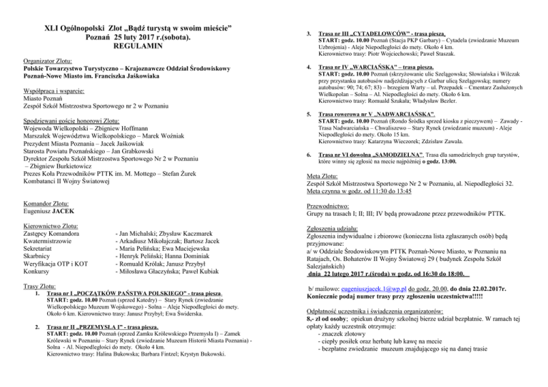 XLI Ogólnopolski Zlot „Bądź turystą w swoim mieście” Poznań 25 luty 2017 r.(sobota). REGULAMIN Organizator Zlotu: Polskie Towarzystwo Turystyczno – Krajoznawcze Oddział Środowiskowy Poznań-Nowe Miasto im. Franciszka Jaśkowiaka 3. Trasa nr III „CYTADELOWCÓW” - trasa piesza. START: godz. 10.00 Poznań (Stacja PKP Garbary) – Cytadela (zwiedzanie Muzeum Uzbrojenia) - Aleje Niepodległości do mety. Około 4 km. Kierownictwo trasy: Piotr Wojciechowski; Paweł Staszak. 4. Trasa nr IV „WARCIAŃSKA” – trasa piesza. START: godz. 10.00 Poznań (skrzyżowanie ulic Szelągowska; Słowiańska i Wilczak przy przystanku autobusów nadjeżdżających z Garbar ulicą Szelągowską; numery autobusów: 90; 74; 67; 83) – brzegiem Warty – ul. Przepadek – Cmentarz Zasłużonych Wielkopolan – Solna – Al. Niepodległości do mety. Około 6 km. Kierownictwo trasy: Romuald Szukała; Władysław Bezler. 5. Trasa rowerowa nr V „NADWARCIAŃSKA”. START: godz. 10.00 Poznań (Rondo Śródka sprzed kiosku z pieczywem) – Zawady Trasa Nadwarciańska – Chwaliszewo – Stary Rynek (zwiedzanie muzeum) - Aleje Niepodległości do mety. Około 15 km. Kierownictwo trasy: Katarzyna Wieczorek; Zdzisław Zawala. 6. Trasa nr VI dowolna „SAMODZIELNA” . Trasa dla samodzielnych grup turystów, które winny się zgłosić na mecie najpóźniej o godz. 13:00. Współpraca i wsparcie: Miasto Poznań Zespół Szkół Mistrzostwa Sportowego nr 2 w Poznaniu Spodziewani goście honorowi Zlotu: Wojewoda Wielkopolski – Zbigniew Hoffmann Marszałek Województwa Wielkopolskiego – Marek Woźniak Prezydent Miasta Poznania – Jacek Jaśkowiak Starosta Powiatu Poznańskiego – Jan Grabkowski Dyrektor Zespołu Szkół Mistrzostwa Sportowego Nr 2 w Poznaniu – Zbigniew Burkietowicz Prezes Koła Przewodników PTTK im. M. Mottego – Stefan Żurek Kombatanci II Wojny Światowej Komandor Zlotu: Eugeniusz JACEK Kierownictwo Zlotu: Zastępcy Komandora Kwatermistrzowie Sekretariat Skarbnicy Weryfikacja OTP i KOT Konkursy Przewodnictwo: Grupy na trasach I; II; III; IV będą prowadzone przez przewodników PTTK. - Jan Michalski; Zbysław Kaczmarek - Arkadiusz Mikołajczak; Bartosz Jacek - Maria Pelińska; Ewa Maciejewska - Henryk Peliński; Hanna Dominiak - Romuald Królak; Janusz Przybył - Miłosława Głaczyńska; Paweł Kubiak Trasy Zlotu: 1. 2. Meta Zlotu: Zespół Szkół Mistrzostwa Sportowego Nr 2 w Poznaniu, al. Niepodległości 32. Meta czynna w godz. od 11:30 do 13:45 Trasa nr I „POCZĄTKÓW PAŃSTWA POLSKIEGO” - trasa piesza. START: godz. 10.00 Poznań (sprzed Katedry) – Stary Rynek (zwiedzanie Wielkopolskiego Muzeum Wojskowego) - Solna – Aleje Niepodległości do mety. Około 6 km. Kierownictwo trasy: Janusz Przybył; Ewa Świderska. Trasa nr II „PRZEMYSŁA I” - trasa piesza. START: godz. 10.00 Poznań (sprzed Zamku Królewskiego Przemysła I) – Zamek Królewski w Poznaniu – Stary Rynek (zwiedzanie Muzeum Historii Miasta Poznania) Solna - Al. Niepodległości do mety. Około 4 km. Kierownictwo trasy: Halina Bukowska; Barbara Fintzel; Krystyn Bukowski. Zgłoszenia udziału: Zgłoszenia indywidualne i zbiorowe (konieczna lista zgłaszanych osób) będą przyjmowane: a/ w Oddziale Środowiskowym PTTK Poznań-Nowe Miasto, w Poznaniu na Ratajach, Os. Bohaterów II Wojny Światowej 29 ( budynek Zespołu Szkół Salezjańskich) dnia 22 lutego 2017 r.(środa) w godz. od 16:30 do 18:00. b/ mailowo: [email protected] do godz. 20.00, do dnia 22.02.2017r. Koniecznie podaj numer trasy przy zgłoszeniu uczestnictwa!!!!! Odpłatność uczestnika i świadczenia organizatorów: 8,- zł od osoby; opiekun drużyny szkolnej bierze udział bezpłatnie. W ramach tej opłaty każdy uczestnik otrzymuje: - znaczek zlotowy - ciepły posiłek oraz herbatę lub kawę na mecie - bezpłatne zwiedzanie muzeum znajdującego się na danej trasie Przewidziane są puchary dla najliczniejszych drużyn, nagrody rzeczowe w konkursach sprawnościowych; konkursie wiedzy o Poznaniu. Konkurs wiedzy o Poznaniu w formie testu odbędzie się o godz. 13.00 w Sali nr 13. Uwaga! W przypadku zgłoszeń po podanym terminie, organizatorzy zastrzegają sobie prawo do nie zapewnienia pełnych świadczeń. Uczestnicy tras rowerowych muszą posiadać kaski; przestrzegać przepisy ruchu drogowego. Wszyscy muszą wykonywać polecenia kierowników tras i przewodników. Każda drużyna winna posiadać apteczkę. ŻYCZYMY SŁONECZNEJ POGODY! XLI OGÓNOPOLSKI ZLOT BĄDŹ TURYSTĄ W SWOIM MIEŚCIE Rajd dofinansowano z środków: Poznań 25.02.2017r (sobota)