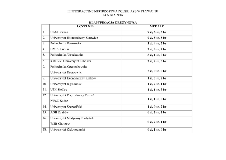 I INTEGRACYJNE MISTRZOSTWA POLSKI AZS W PŁYWANIU 14 MAJA 2016 KLASYFIKACJA DRUŻYNOWA UCZELNIA MEDALE 1. UAM Poznań 9 zł, 6 sr, 6 br 2. Uniwersytet Ekonomiczny Katowice 9 zł, 5 sr, 5 br 3. Politechnika Poznańska 3 zł, 4 sr, 2 br 4. UMCS Lublin 3 zł, 3 sr, 2 br 5. Politechnika Wrocławska 3 zł, 1 sr, 0 br 6. Katolicki Uniwersytet Lubelski 2 zł, 2 sr, 5 br 7. Politechnika Częstochowska Uniwersytet Rzeszowski 2 zł, 0 sr, 0 br 9. Uniwersytet Ekonomiczny Kraków 1 zł, 3 sr, 2 br 10. Uniwersytet Jagielloński 1 zł, 2 sr, 1 br 11. UPH Siedlce 1 zł, 1 sr, 3 br 12. Uniwersytet Przyrodniczy Poznań PWSZ Kalisz 1 zł, 1 sr, 0 br 14. Uniwersytet Szczeciński 1 zł, 0 sr, 2 br 15. AGH Kraków 0 zł, 5 sr, 3 br 16. Uniwersytet Medyczny Białystok WSB Chorzów 18. Uniwersytet Zielonogórski 0 zł, 2 sr, 1 br 0 zł, 1 sr, 0 br
