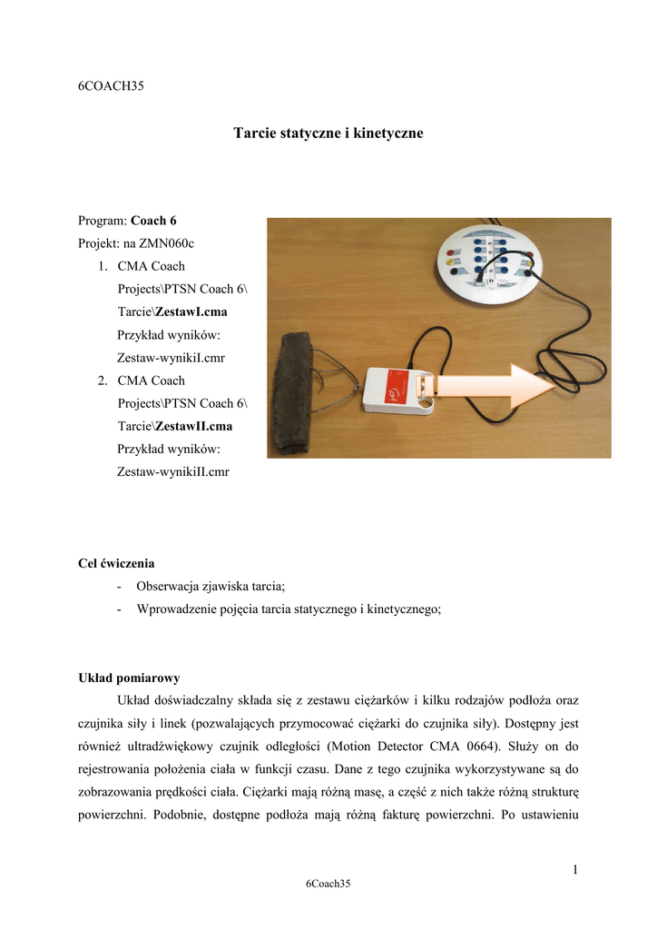 6COACH35 Tarcie statyczne i kinetyczne Program: Coach 6 Projekt: na ZMN060c 1. CMA Coach Projects\PTSN Coach 6\ Tarcie\ZestawI.cma Przykład wyników: Zestaw-wynikiI.cmr 2. CMA Coach Projects\PTSN Coach 6\ Tarcie\ZestawII.cma Przykład wyników: Zestaw-wynikiII.cmr Cel ćwiczenia - Obserwacja zjawiska tarcia; - Wprowadzenie pojęcia tarcia statycznego i kinetycznego; Układ pomiarowy Układ doświadczalny składa się z zestawu cięŜarków i kilku rodzajów podłoŜa oraz czujnika siły i linek (pozwalających przymocować cięŜarki do czujnika siły). Dostępny jest równieŜ ultradźwiękowy czujnik odległości (Motion Detector CMA 0664). SłuŜy on do rejestrowania połoŜenia ciała w funkcji czasu. Dane z tego czujnika wykorzystywane są do zobrazowania prędkości ciała. CięŜarki mają róŜną masę, a część z nich takŜe róŜną strukturę powierzchni. Podobnie, dostępne podłoŜa mają róŜną fakturę powierzchni. Po ustawieniu 1 6Coach35 cięŜarka na podłoŜu i przymocowaniu go do czujnika, moŜna rejestrować siłę działającą na cięŜarek. Dodatkowo, moŜna rejestrować prędkość ruchu ciała, w przypadku, gdy realizowany jest wariant z czujnikiem odległości. Czujnik ten naleŜy ustawić na gumowej nóŜce lub przymocować do jednego z dostępnych statywów. Do cięŜarka naleŜy wtedy, za pomocą taśmy lub spinaczy, przymocować kartkę papieru (element, od którego odbijają się fale ultradźwiękowe). ZłoŜoną na pół kartę papieru moŜna usztywnić dodatkowo, wkładając do środka metalowy pręt. Dla przejrzystości pokazu naleŜy starać się, aby po wprawieniu w ruch, poruszać ciało ruchem jednostajnym prostoliniowym. Do pierwszego gniazda analogowego konsoli pomiarowej CoachLabII+, wtykiem BT podłączony jest czujnik siły (CMA Force sensor (Dual range) 0663i -50N…50N). W programie ustawiono sterownik, który pozwala mierzyć siłę w zakresie do 50N. Do poprawnego przeprowadzenia pomiarów, naleŜy ustawić czujnik na zakres „-50N … 50N” (przełącznik na bocznej ściance czujnika). Ultradźwiękowy czujnik ruchu (Ultrasonic Motion Detector (0664) (CMA) (0…12m)) podłączony jest wtykiem BT do piątego wejścia cyfrowego konsoli pomiarowej. Uwaga: 1. NaleŜy bezwzględnie uwaŜać by na czujnik siły nie działać siłą większą nić 80 N, gdyŜ moŜe to doprowadzić do jego zniszczenia. W praktyce naleŜy zwracać uwagę, by wskazania na wykresach nie wykraczały poza przyjętą skalę. 2. Przed przystąpieniem do prezentacji doświadczenia naleŜy przeprowadzić kilka prób, co pozwoli na wyczucie, jak w sposób płynny, przeprowadzać doświadczenie. 2 6Coach35 Wariant 1: Demonstracja róŜnicy pomiędzy siłą tarcia statycznego i kinetycznego • MoŜliwy jest tylko pomiar działającej na ciało siły; • W czasie jednego pomiaru moŜna dokonać rejestracji kilku przebiegów, a następnie porównać je. Ustawienia parametrów pomiaru: Method: Type: Measuring time: Frequency: Time based 100 seconds 80 per second Pomiar - Ustawić cięŜarek na odpowiednim podłoŜu; - Za pomocą linek połączyć cięŜarek z czujnikiem siły; - Uruchomić pomiar – przycisk start (F9) - Ciągnąc za czujnik siły poruszać cięŜarek (ruch jednostajny prostoliniowy ułatwia ; obserwację zjawiska); - Pomiary moŜna powtórzyć kilkukrotnie, zmieniając rodzaj podłoŜa i stosowane cięŜarki, a takŜe ich ułoŜenie w trakcie doświadczenia; Ogólny widok okna pomiarowego wariantu 1 6Coach35 3 Wariant 2: Demonstracja siły tarcia, jako dodatkowej siły występującej w układzie Wprowadzenie do układu ultradźwiękowego czujnika odległości • MoŜliwy jest pomiar działającej na ciało siły oraz połoŜenia i prędkości ruchu ciała; • W czasie jednego pomiaru moŜna dokonać rejestracji jednego przebiegu; • Doświadczenie umoŜliwia wprowadzenie pojęcia tarcia. Ustawienia parametrów pomiaru: Method: Type: Measuring time: Frequency: Time based 6 seconds 12 per second Pomiar - Ustawić cięŜarek na odpowiednim podłoŜu; - Za pomocą linek połączyć cięŜarek z czujnikiem siły; - Czujnik odległości ustawić na gumowej nóŜce lub przymocować do jednego z dostępnych statywów; - Do badanego ciała, przy uŜyciu taśmy lub spinaczy, przymocować kartę papieru i usztywnić ją (np. za pomocą metalowego pręta); - Uruchomić pomiar – przycisk start (F9) - Ciągnąc za czujnik siły poruszać cięŜarek tak, by jego ruch był ruchem jednostajnym ; prostoliniowym; 4 6Coach35 Ogólny widok okna pomiarowego wariantu 2 Informacje odnoście całego doświadczenia Obserwacje: MoŜna zaobserwować, Ŝe działająca na spoczywające ciało siła rośnie do momentu, gdy zaczyna się ono poruszać. W momencie, gdy ciało zaczyna się poruszać, działająca na nie siła maleje i w ciągu trwania ruchu stabilizuje się na określonym poziomie. Pomimo, iŜ w trakcie doświadczenia, na ciało działa stała siła, porusza się ono ruchem jednostajnym prostoliniowym, co świadczy o występowaniu dodatkowej siły, równowaŜącej tą, którą działa eksperymentator. Dla danego ciała, poruszającego się z tą samą prędkością, ale po róŜnych powierzchniach, rejestruje się róŜne wartości działającej siły. Na danej powierzchni, wartości rejestrowanej siły są niezaleŜne od tego, czy cięŜarki ułoŜone są jeden na drugim, czy ślizgają się jeden za drugim, tworząc połączony układ. 5 6Coach35 Wnioski PoniewaŜ, przed rozpoczęciem ruchu, na ciało naleŜy zadziałać odpowiednią siłą, by mogło ono przejść ze spoczynku do ruchu, moŜna wnioskować o istnieniu pewnej siły, która „przytrzymuje” to ciało w spoczynku. Podobnie, w czasie ruchu, musi istnieć dodatkowa siła, która hamuje ruch ciała, skoro działając na nie stałą siłą, porusza się ono ruchem jednostajnym, prostoliniowym. Jest to wniosek wynikający z pierwszej zasady dynamiki Newtona, która mówi, Ŝe ciało porusza się ruc