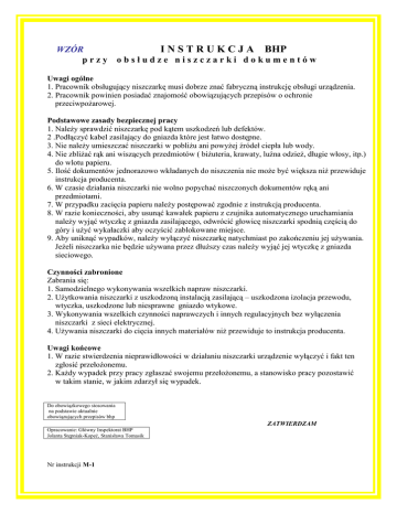 WZÓR I N S T R U K C J A BHP przy obsłudze niszczarki dokumentów Uwagi ogólne 1. Pracownik obsługujący niszczarkę musi dobrze znać fabryczną instrukcję obsługi urządzenia. 2. Pracownik powinien posiadać znajomość obowiązujących przepisów o ochronie przeciwpoŜarowej. Podstawowe zasady bezpiecznej pracy 1. NaleŜy sprawdzić niszczarkę pod kątem uszkodzeń lub defektów. 2 .Podłączyć kabel zasilający do gniazda które jest łatwo dostępne. 3. Nie naleŜy umieszczać niszczarki w pobliŜu ani powyŜej źródeł ciepła lub wody. 4. Nie zbliŜać rąk ani wiszących przedmiotów ( biŜuteria, krawaty, luźna odzieŜ, długie włosy, itp.) do wlotu papieru. 5. Ilość dokumentów jednorazowo wkładanych do niszczenia nie moŜe być większa niŜ przewiduje instrukcja producenta. 6. W czasie działania niszczarki nie wolno popychać niszczonych dokumentów ręką ani przedmiotami. 7. W przypadku zacięcia papieru naleŜy postępować zgodnie z instrukcją producenta. 8. W razie konieczności, aby usunąć kawałek papieru z czujnika automatycznego uruchamiania naleŜy wyjąć wtyczkę z gniazda zasilającego, odwrócić głowicę niszczarki spodnią częścią do góry i uŜyć wykałaczki aby oczyścić zablokowane miejsce. 9. Aby uniknąć wypadków, naleŜy wyłączyć niszczarkę natychmiast po zakończeniu jej uŜywania. JeŜeli niszczarka nie będzie uŜywana przez dłuŜszy czas naleŜy wyjąć jej wtyczkę z gniazda sieciowego. Czynności zabronione Zabrania się: 1. Samodzielnego wykonywania wszelkich napraw niszczarki. 2. UŜytkowania niszczarki z uszkodzoną instalacją zasilającą – uszkodzona izolacja przewodu, wtyczka, uszkodzone lub niesprawne gniazdo wtykowe. 3. Wykonywania wszelkich czynności naprawczych i innych regulacyjnych bez wyłączenia niszczarki z sieci elektrycznej. 4. UŜywania niszczarki do cięcia innych materiałów niŜ przewiduje to instrukcja producenta. Uwagi końcowe 1. W razie stwierdzenia nieprawidłowości w działaniu niszczarki urządzenie wyłączyć i fakt ten zgłosić przełoŜonemu. 2. KaŜdy wypadek przy pracy zgłaszać swojemu przełoŜonemu, a stanowisko pracy pozostawić w takim stanie, w jakim zdarzył się wypadek. Do obowiązkowego stosowania na podstawie aktualnie obowiązujących przepisów bhp ZATWIERDZAM Opracowanie: Główny Inspektorat BHP Jolanta Stępniak-Kopeć, Stanisława Tomasik Nr instrukcji M-1