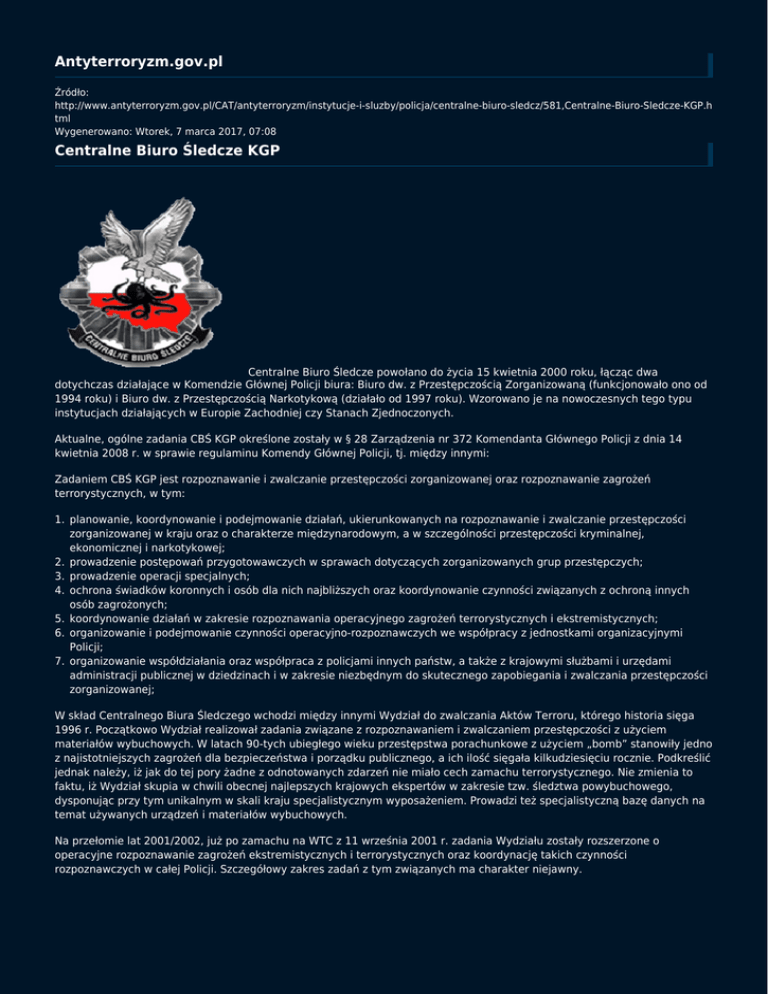 Antyterroryzm.gov.pl Źródło: http://www.antyterroryzm.gov.pl/CAT/antyterroryzm/instytucje-i-sluzby/policja/centralne-biuro-sledcz/581,Centralne-Biuro-Sledcze-KGP.h tml Wygenerowano: Wtorek, 7 marca 2017, 07:08 Centralne Biuro Śledcze KGP Centralne Biuro Śledcze powołano do życia 15 kwietnia 2000 roku, łącząc dwa dotychczas działające w Komendzie Głównej Policji biura: Biuro dw. z Przestępczością Zorganizowaną (funkcjonowało ono od 1994 roku) i Biuro dw. z Przestępczością Narkotykową (działało od 1997 roku). Wzorowano je na nowoczesnych tego typu instytucjach działających w Europie Zachodniej czy Stanach Zjednoczonych. Aktualne, ogólne zadania CBŚ KGP określone zostały w § 28 Zarządzenia nr 372 Komendanta Głównego Policji z dnia 14 kwietnia 2008 r. w sprawie regulaminu Komendy Głównej Policji, tj. między innymi: Zadaniem CBŚ KGP jest rozpoznawanie i zwalczanie przestępczości zorganizowanej oraz rozpoznawanie zagrożeń terrorystycznych, w tym: 1. planowanie, koordynowanie i podejmowanie działań, ukierunkowanych na rozpoznawanie i zwalczanie przestępczości zorganizowanej w kraju oraz o charakterze międzynarodowym, a w szczególności przestępczości kryminalnej, ekonomicznej i narkotykowej; 2. prowadzenie postępowań przygotowawczych w sprawach dotyczących zorganizowanych grup przestępczych; 3. prowadzenie operacji specjalnych; 4. ochrona świadków koronnych i osób dla nich najbliższych oraz koordynowanie czynności związanych z ochroną innych osób zagrożonych; 5. koordynowanie działań w zakresie rozpoznawania operacyjnego zagrożeń terrorystycznych i ekstremistycznych; 6. organizowanie i podejmowanie czynności operacyjno-rozpoznawczych we współpracy z jednostkami organizacyjnymi Policji; 7. organizowanie współdziałania oraz współpraca z policjami innych państw, a także z krajowymi służbami i urzędami administracji publicznej w dziedzinach i w zakresie niezbędnym do skutecznego zapobiegania i zwalczania przestępczości zorganizowanej; W skład Centralnego Biura Śledczego wchodzi między innymi Wydział do zwalczania Aktów Terroru, którego historia sięga 1996 r. Początkowo Wydział realizował zadania związane z rozpoznawaniem i zwalczaniem przestępczości z użyciem materiałów wybuchowych. W latach 90-tych ubiegłego wieku przestępstwa porachunkowe z użyciem „bomb” stanowiły jedno z najistotniejszych zagrożeń dla bezpieczeństwa i porządku publicznego, a ich ilość sięgała kilkudziesięciu rocznie. Podkreślić jednak należy, iż jak do tej pory żadne z odnotowanych zdarzeń nie miało cech zamachu terrorystycznego. Nie zmienia to faktu, iż Wydział skupia w chwili obecnej najlepszych krajowych ekspertów w zakresie tzw. śledztwa powybuchowego, dysponując przy tym unikalnym w skali kraju specjalistycznym wyposażeniem. Prowadzi też specjalistyczną bazę danych na temat używanych urządzeń i materiałów wybuchowych. Na przełomie lat 2001/2002, już po zamachu na WTC z 11 września 2001 r. zadania Wydziału zostały rozszerzone o operacyjne rozpoznawanie zagrożeń ekstremistycznych i terrorystycznych oraz koordynację takich czynności rozpoznawczych w całej Policji. Szczegółowy zakres zadań z tym związanych ma charakter niejawny. Zdjęcie pobrano ze strony http://cbs.policja.pl/portal/cbs/965/54039/CBS Zdjęcie pobrano ze strony http://cbs.policja.pl/portal/cbs/965/54039/CBS