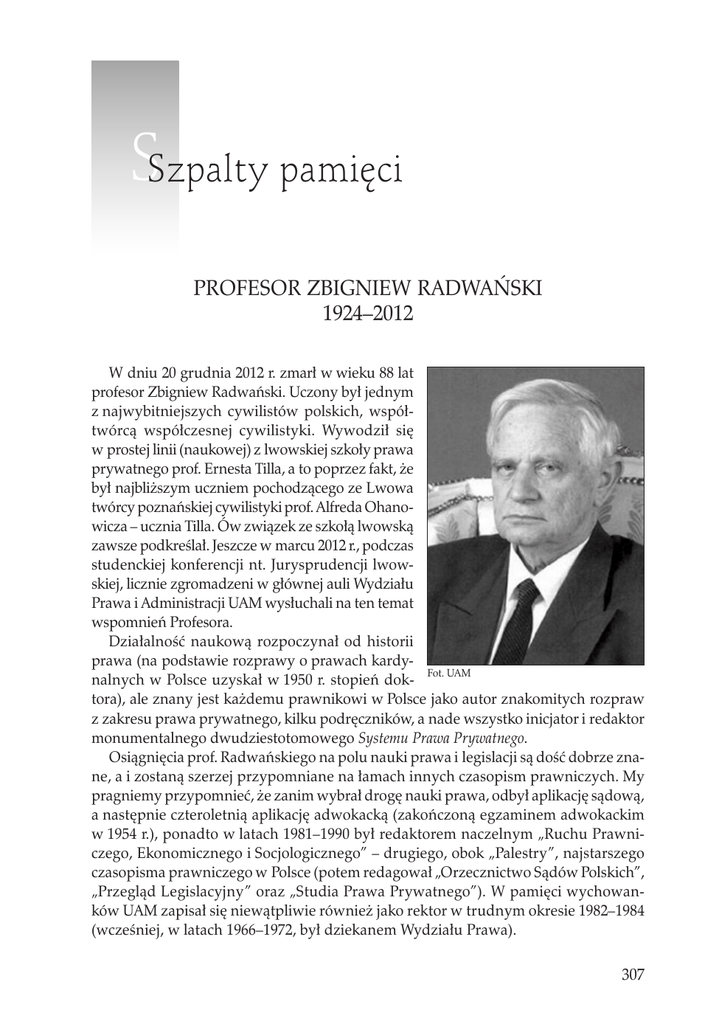 SSzpalty pamięci Profesor Zbigniew Radwański 1924–2012 W dniu 20 grudnia 2012 r. zmarł w wieku 88 lat profesor Zbigniew Radwański. Uczony był jednym z najwybitniejszych cywilistów polskich, współtwórcą współczesnej cywilistyki. Wywodził się w prostej linii (naukowej) z lwowskiej szkoły prawa prywatnego prof. Ernesta Tilla, a to poprzez fakt, że był najbliższym uczniem pochodzącego ze Lwowa twórcy poznańskiej cywilistyki prof. Alfreda Ohanowicza – ucznia Tilla. Ów związek ze szkołą lwowską zawsze podkreślał. Jeszcze w marcu 2012 r., podczas studenckiej konferencji nt. Jurysprudencji lwowskiej, licznie zgromadzeni w głównej auli Wydziału Prawa i Administracji UAM wysłuchali na ten temat wspomnień Profesora. Działalność naukową rozpoczynał od historii prawa (na podstawie rozprawy o prawach kardyFot. UAM nalnych w Polsce uzyskał w 1950 r. stopień doktora), ale znany jest każdemu prawnikowi w Polsce jako autor znakomitych rozpraw z zakresu prawa prywatnego, kilku podręczników, a nade wszystko inicjator i redaktor monumentalnego dwudziestotomowego Systemu Prawa Prywatnego. Osiągnięcia prof. Radwańskiego na polu nauki prawa i legislacji są dość dobrze znane, a i zostaną szerzej przypomniane na łamach innych czasopism prawniczych. My pragniemy przypomnieć, że zanim wybrał drogę nauki prawa, odbył aplikację sądową, a następnie czteroletnią aplikację adwokacką (zakończoną egzaminem adwokackim w 1954 r.), ponadto w latach 1981–1990 był redaktorem naczelnym „Ruchu Prawniczego, Ekonomicznego i Socjologicznego” – drugiego, obok „Palestry”, najstarszego czasopisma prawniczego w Polsce (potem redagował „Orzecznictwo Sądów Polskich”, „Przegląd Legislacyjny” oraz „Studia Prawa Prywatnego”). W pamięci wychowanków UAM zapisał się niewątpliwie również jako rektor w trudnym okresie 1982–1984 (wcześniej, w latach 1966–1972, był dziekanem Wydziału Prawa). 307 Szpalty pamięci PALESTRA Niemal do końca życia był aktywny naukowo. Tym, którzy się z Nim zetknęli, pozostał w pamięci jako znamienita osobowość, człowiek skromny, nadzwyczaj pracowity, o ogromnej wiedzy, którą z przyjemnością się dzielił. Promieniował entuzjazmem, objawiającym się szczególnie w pracach Komisji Kodyfikacyjnej Prawa Cywilnego, której w latach 1997–2010 był przewodniczącym, znanym jako gorący zwolennik przygotowania nowej pełnej kodyfikacji prawa prywatnego w Polsce. Na koniec dodajmy, że „w uznaniu znamienitych zasług dla rozwoju współczesnej polskiej cywilistyki, za wybitne osiągnięcia w pracy naukowej i znaczący wkład do praktyki stanowienia i stosowania prawa oraz istotny udział w dostosowywaniu polskiego systemu prawnego do prawa Unii Europejskiej” 3 maja 2011 r. profesor Radwański został odznaczony Orderem Orła Białego. AJR Adwokat ANDRZEJ SARAPATA 1945–2013 W dniu 1 stycznia 2013 r. zmarł nagle adwokat Andrzej Sarapata, wykonujący zawód w Żywcu. Jego odejście stanowi wielką, niepowetowaną stratę dla całej Adwokatury, szczególnie izby bielskiej, był bowiem nie tylko wybitnym adwokatem, ale też człowiekiem ze wszech miar niezwykłym. Urodził się 3 grudnia 1945 r. w Żywcu, studia prawnicze ukończył na Uniwersytecie Jagiellońskim w 1968 r. Od września 1968 r. do kwietnia 1975 r. pracował jako prokurator Prokuratury w Katowicach. Następnie przez dwa lata wykonywał obowiązki radcy prawnego, a 25 stycznia 1977 r. został wpisany na listę adwokatów izby bielskiej, w której ślubowanie złożył 5 kwietnia 1977 r. Z początkiem maja 1977 r. rozpoczął pracę adwokata w ówczesnym Zespole Adwokackim nr 2 w Wadowicach, a w październiku 1979 r. zmienił siedzibę wykonywania zawodu i przeniósł się do Zespołu Adwokackiego w Żywcu, gdzie od 1990 r. aż do chwili śmierci prowadził indywidualną kancelarię adwokacką. Dopóki pozwalało mu na to zdrowie, przez pięć kadencji działał w samorządzie adwokackim izby bielskiej, w latach 1990– 1992 był wicedziekanem, a w roku 1998 r. został wybrany na stanowisko dziekana ORA w Bielsku Białej i funkcję tę sprawował do 2001 r. W 2001 r. odznaczony został odznaką „Adwokatura Zasłużonym”. Był nie tylko znakomitym prawnikiem, ale także człowiekiem o wysokiej kulturze osobistej, erudytą, miłośnikiem sztuki przez duże S, w tym literatury, filmu, teatru, czego niejednokrotnie dawał dowody, np. przygotowując na egzaminach adwokackich, w których uczestniczył, pytania z zakresu wiedzy ogólnej. 308 1–2/2013 Szpalty pamięci Zawsze imponował spokojem, opanowaniem, mądrością, kulturą osobistą i wspaniałym poczuciem humoru. Pogoda ducha, radość życia i poczucie humoru zawsze mu towarzyszyły, mimo zmagań z losem, który okrutnie go doświadczył. Kilkanaście lat temu zdiagnozowano u Niego nieuleczalną chorobę oczu, która około 10 lat temu spowodowała całkowitą utratę wzroku. Mimo to bez żadnych przerw wykonywał zawód, prowadząc dużą i cieszącą się wielkim wzięciem kancelarię adwokacką. Mógł tego dokonać dzięki ofiarnej, codziennej pomocy swoich najbliższych, którzy towarzyszyli mu w wykonywaniu wszystkich obowiązków zawodowych, zastępując Jego oczy. Ale było to możliwe także dzięki hartowi ducha, niezwykłej pamięci, inteligencji i wiedzy prawniczej. Byłem osobiście w sposób szczególny związany z Andrzejem od momentu, gdy w maju 1977 r. rozpoczął pracę jako adwokat w Zespole Adwokackim nr 2 w Wadowicach, w którym wówczas pracowałem. Wtedy poznaliśmy się i od tego czasu łączyła nas nie tylko znajomość zawodowa, ale i wielka przyjaźń. Dlatego żegnając Go dzisiaj, przeżywam to pożegnanie w sposób szczególnie trudny, bo żegnam Andrzeja nie tylko jako dziekan Izby, ale także jako jego przyjaciel. Jerzy Stworzewicz 309