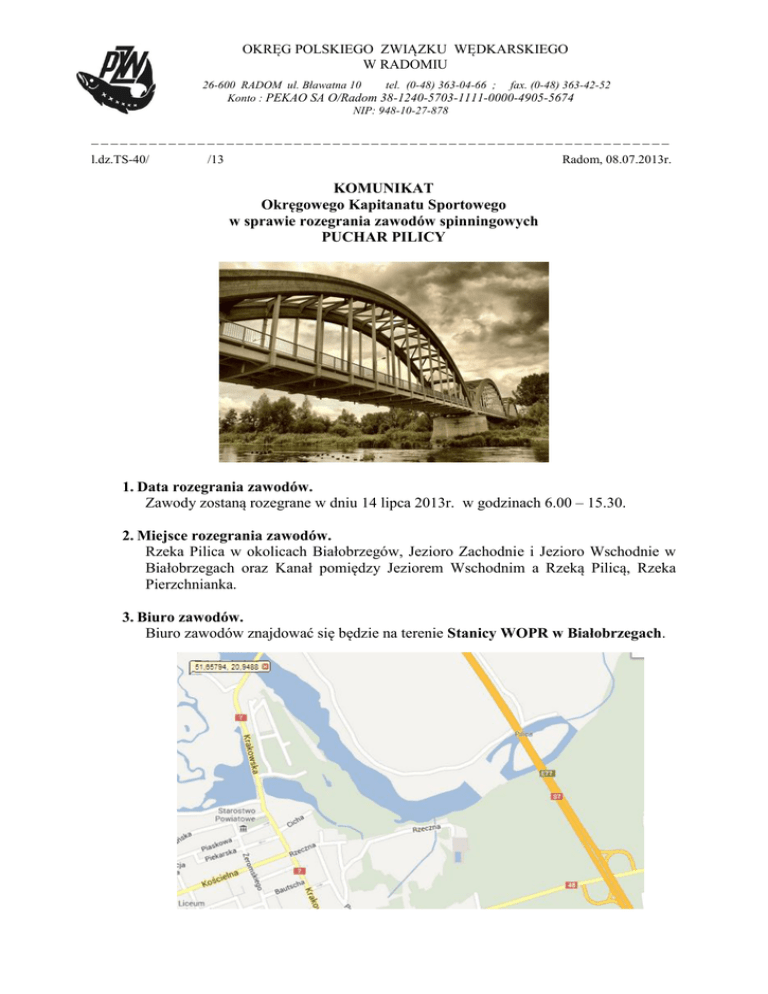 OKRĘG POLSKIEGO ZWIĄZKU WĘDKARSKIEGO W RADOMIU 26-600 RADOM ul. Bławatna 10 tel. (0-48) 363-04-66 ; fax. (0-48) 363-42-52 Konto : PEKAO SA O/Radom 38-1240-5703-1111-0000-4905-5674 NIP: 948-10-27-878 ____________________________________________________________ l.dz.TS-40/ /13 Radom, 08.07.2013r. KOMUNIKAT Okręgowego Kapitanatu Sportowego w sprawie rozegrania zawodów spinningowych PUCHAR PILICY 1. Data rozegrania zawodów. Zawody zostaną rozegrane w dniu 14 lipca 2013r. w godzinach 6.00 – 15.30. 2. Miejsce rozegrania zawodów. Rzeka Pilica w okolicach Białobrzegów, Jezioro Zachodnie i Jezioro Wschodnie w Białobrzegach oraz Kanał pomiędzy Jeziorem Wschodnim a Rzeką Pilicą, Rzeka Pierzchnianka. 3. Biuro zawodów. Biuro zawodów znajdować się będzie na terenie Stanicy WOPR w Białobrzegach. 4. Zgłoszenie i prawo startu. Prawo Startu mają członkowie Okręgu PZW w Radomiu, którzy zostali zgłoszeni przez macierzyste Koła i Kluby oraz zawodnicy, którzy zgłosili się indywidualnie (w przypadku zapewnienia odpowiedniej ilości miejsc przez organizatora. Warunkiem startu w zawodach jest pisemne zgłoszenie udziału do dnia 12.07.2013r. (piatek) do godz. 15.00 w formie listowej na adres Biuro Zarządu Okręgu Radomskiego PZW, ul. Bławatna 10, 26-600 Radom, lub drogą e-mailową na adres [email protected], bądź drogą faksową na nr 48 363 42 52. 5. Zasady finansowania. Opłata startowa wynosi 20 zł. za zawodnika i pokrywane są przez macierzyste Koła i Kluby. Zawodnicy, który nie zostali zgłoszenie przez macierzyste Koła i Kluby zobowiązani są do wniesienia opłaty startowej indywidualnie, przed rozpoczęciem zawodów, pod rygorem niedopuszczenia do startu. 6. Formuła zawodów. Zawody zostaną rozegrane w jednej turze i prowadzona będzie wyłącznie klasyfikacja indywidualna bez podziału na kategorie wiekowe oraz klasyfikacja na najdłuższą rybę. Zawody rozegrane zostaną metodą klasyczną na martwej rybie. 7. Organizator zawodów. Organizatorem Zawodów jest Okręgowy Kapitanat Sportowy działający przy wsparciu pracowników Biura ZO i działaczy Koła PZW nr 19 Syrenka-Białobrzegi. Organizator zapewnia opiekę medyczną w czasie zawodów, posiłek przed i po zawodach, napoje oraz sprawną organizację zawodów. 8. Komisja sędziowska zawodów. W skład Komisji Sędziowskiej zawodów wchodzą: Kol. Beata Olejarz – Sędzia Główny, Kol. Jarosław Pawlak – Zastępca Sędziego Głównego, Kol. Daniel Kowalski – Sędzia Sekretarz. 9. Szczegółowy program zawodów. Niedziela 14.07.2013r. 6.00 – sprawdzenie obecności zgłoszonych zawodników, 6.30 – otwarcie zawodów, uroczysta odprawa, 7.00 – I sygnał – wyjście zawodników, początek łowienia. 14.00 – II sygnał – koniec zawodów – po tym sygnale obowiązuje czas 30 min. na dojście do Biura Zawodów, 15.00 – Ogłoszenie wyników, rozdanie nagród. 15.30 – Koniec zawodów. 10. Regulamin zawodów. Zawody zostaną rozegrane z poszanowaniem zasad Regulaminu Amatorskiego Połowu Ryb w oparciu o Regulamin Zawodów Spinningowych Metodą Klasyczną opracowany przez Okręgowy Kapitanat Sportowy, który stanowi załącznik do niniejszego Komunikatu. 11. Nagrody w zawodach. W zawodach przewidziane są następujące nagrody: - dla zwycięzcy przewidziany jest okazały Puchar Pilicy, - dla zawodników zajmujących 2 i 3 miejsce przewidziane są puchary okolicznościowe, - zawodnicy sklasyfikowanych na miejscach 1-6 otrzymują dyplomy pamiątkowe, - zwycięzca w klasyfikacji na najdłuższą rybę otrzyma pamiątkową statuetkę ufundowaną przez Kol. Daniela Bednarskiego, - wśród startujących rozlosowana zostanie nagroda, którą będzie markowy kołowrotek ufundowany przez Sklep Wędkarski w Białobrzegach należący do Kol. Stanisława Pękackiego, - dla wszystkich uczestników zawodów przewidziane są pamiątkowe gadżety wędkarskie. 12. Uwagi końcowe. - Obowiązuje zakaz spożywania napojów alkoholowy w trakcie zawodów. - Organizator zapewnia dla uczestników prowiant oraz gorący posiłek po zawodach i napoje. - Przypominamy, że osoby niepełnoletnie uczestniczące w zawodach muszą znajdować się pod opieką osoby dorosłej, biorącej za nią odpowiedzialność. - Ryby łowione w zawodach przynoszone są do wagi na zasadach zgodnych z R.A.P.R i są zabezpieczenie przez Komisję Sędziowską. - Ze względów bezpieczeństwa obowiązuje całkowity zakaz brodzenia. Umożliwia się jedynie przejście przez wodę w obuwiu do kolan. - Wg zasad etycznych startujący zawodnicy powinni opuścić zawody po uroczystej odprawie kończącej zawody wędkarskie. Z wędkarskim pozdrowieniem, Włodzimierz Przybylski Kapitan Sportowy Okręgu PZW w Radomiu REGULAMIN OKRĘGOWYCH ZAWODÓW SPINNINGOWYCH PUCHAR PILICY 1. TEREN ZAWODÓW - Zawody będą odbywać na wodach bieżących lub stojących wskazanych przez organizatora. Łowienie przewidziane jest w wodach Rzeki Pilica w okolicach Białobrzegów, Jezioro Zachodnie i Jezioro Wschodnie w Białobrzegach oraz Kanał pomiędzy Jeziorem Wschodnim a Rzeką Pilicą, Rzeka Pierzchnianka. 2. SPRZĘT I PRZYNĘTY STOSOWANE W ZAWODACH - Używane w zawodach wędki i przynęty sztuczne muszą spełniać warunki określone w R.A.P.R. Ze sprzętu pomocniczego zabrania się używania osęki. - Zabrania się używania żywej lub martwej rybki oraz używania przynęty sztucznej wraz z jakąkolwiek przynętą naturalną. Zabrania się nęcenia łowiska. 3. ORGANIZACJA I PRZEBIEG ZAWODÓW - Zawody zostaną rozegrane w jednej turze i prowadzona będzie wyłącznie klasyfikacja indywidualna bez podziału na kategorie wiekowe oraz klasyfikacja na najdłuższą rybę. - Zawody rozegrane zostaną metodą klasyczną na martwej rybie. - Zabrania się udzielania pomocy: - w podbieraniu złowionej ryby, - w holowaniu ryby. - Czas trwania tury będzie wynosić 7 godzin. - Obowiązują następujące sygnały: - pierwszy sygnał - oznacza rozpoczęcie zawodów. Nie przewiduj
