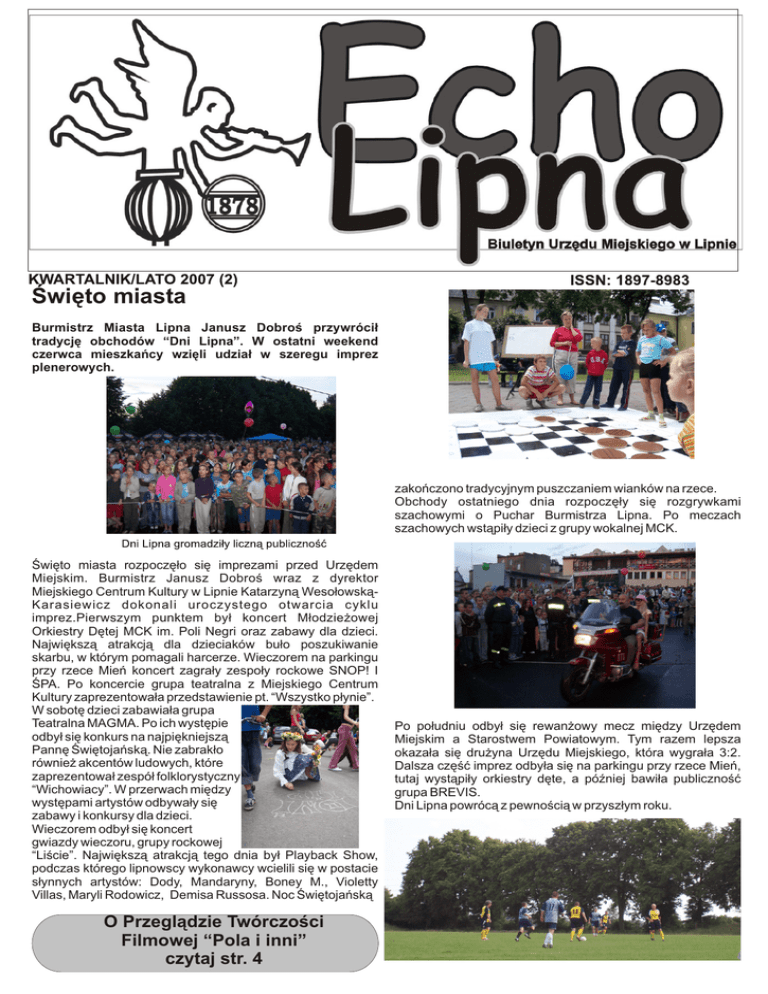 Święto miasta Burmistrz Miasta Lipna Janusz Dobroś przywrócił tradycję obchodów “Dni Lipna”. W ostatni weekend czerwca mieszkańcy wzięli udział w szeregu imprez plenerowych. zakończono tradycyjnym puszczaniem wianków na rzece. Obchody ostatniego dnia rozpoczęły się rozgrywkami szachowymi o Puchar Burmistrza Lipna. Po meczach szachowych wstąpiły dzieci z grupy wokalnej MCK. Święto miasta rozpoczęło się imprezami przed Urzędem Miejskim. Burmistrz Janusz Dobroś wraz z dyrektor Miejskiego Centrum Kultury w Lipnie Katarzyną WesołowskąKarasiewicz dokonali uroczystego otwarcia cyklu imprez.Pierwszym punktem był koncert Młodzieżowej Orkiestry Dętej MCK im. Poli Negri oraz zabawy dla dzieci. Największą atrakcją dla dzieciaków buło poszukiwanie skarbu, w którym pomagali harcerze. Wieczorem na parkingu przy rzece Mień koncert zagrały zespoły rockowe SNOP! I ŚPA. Po koncercie grupa teatralna z Miejskiego Centrum Kultury zaprezentowała przedstawienie pt. “Wszystko płynie”. W sobotę dzieci zabawiała grupa Teatralna MAGMA. Po ich występie odbył się konkurs na najpiękniejszą Pannę Świętojańską. Nie zabrakło również akcentów ludowych, które zaprezentował zespół folklorystyczny “Wichowiacy”. W przerwach między występami artystów odbywały się zabawy i konkursy dla dzieci. Wieczorem odbył się koncert gwiazdy wieczoru, grupy rockowej “Liście”. Największą atrakcją tego dnia był Playback Show, podczas którego lipnowscy wykonawcy wcielili się w postacie słynnych artystów: Dody, Mandaryny, Boney M., Violetty Villas, Maryli Rodowicz, Demisa Russosa. Noc Świętojańską O Przeglądzie Twórczości Filmowej “Pola i inni” czytaj str. 4 Po południu odbył się rewanżowy mecz między Urzędem Miejskim a Starostwem Powiatowym. Tym razem lepsza okazała się drużyna Urzędu Miejskiego, która wygrała 3:2. Dalsza część imprez odbyła się na parkingu przy rzece Mień, tutaj wystąpiły orkiestry dęte, a później bawiła publiczność grupa BREVIS. Dni Lipna powrócą z pewnością w przyszłym roku.