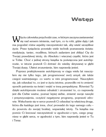 Wstęp W życiu człowieka przychodzi czas, w którym zaczyna zastanawiać się nad sensem istnienia, nad tym, co tu robi, gdzie dąży i jak ma pogodzić różne aspekty rzeczywistości tak, aby wieść szczęśliwe życie. Przez tysiąclecia powstało wiele technik poznawania świata: medytacja, taniec, modlitwa, których zadaniem jest zbliżyć Cię do Twojej prawdziwej istoty, do Absolutu i wiecznej cząstki, która jest w Tobie. Choć z jednej strony książka ta poświęcona jest autohipnozie, w istocie pozwoli Ci dotrzeć do wiedzy skrywanej w głębi Twojej duszy. Ułatwi zrozumienie, kim naprawdę jesteś. Poprzez praktykowanie autohipnozy w ciągu wielu lat nauczyłem się nie tylko tego, jak programować swój umysł, ale także czegoś ważniejszego: co warto w nim programować. Nauczyłem się, jak odszukać to, co jest w życiu istotne, pozwoliło mi to zmienić sposób patrzenia na świat i wejść w inną perspektywę. Również Ty dzięki autohipnozie możesz odnaleźć i zrozumieć to, co naprawdę jest dla Ciebie ważne, poznać lepiej siebie, zmienić swoje nawyki i przyzwyczajenia, oczyścić negatywne programy, poprawić zdrowie. Wsłuchanie się w serce pozwoli Ci odszukać tę właściwą drogę, która dla każdego jest inna, choć prowadzi do tego samego celu – do powrotu do swojej boskiej, wspaniałej istoty. Ta książka ma pomóc Ci kreować rzeczywistość w zgodności z tym, czego pragniesz w głębi serca, w zgodności z tym, kim naprawdę jesteś w Tu i Teraz. 7 Od dziecka wiedziałem, że otacza nas niesamowity świat, interesowałem się niesamowitymi możliwościami umysłu. Zawsze tliła się we mnie iskierka chęci samopoznania, która sprawiała, że po przeróżnych doświadczeniach życiowych w końcu zdecydowałem się rozwinąć w kierunku, który wydał mi się bardzo interesujący – podjąłem naukę w London Institute of Clinical Hypnosis, jak mi się wtedy wydawało czysto hobbistycznie, w dodatku jak to zwykle w życiu bywa, stało się to za sprawą tak zwanego przypadku. Mniej więcej w tym samym okresie jakaś wewnętrzna siła sprawiła, że bez żadnych wcześniejszych doświadczeń tego typu postanowiłem udać się na dłuższą wyprawę, myśląc początkowo o Indiach. Czułem, że czegoś w moim życiu brakuje i odsunięcie się od spraw codziennych pozwoli mi zyskać inną perspektywę. W głębi duszy czułem bardzo mocno, nie wiadomo dlaczego, że interesuje mnie bardzo temat szamanizmu i w zasadzie nie wiem, dlaczego Ameryka Południowa zaczęła się wydawać lepszym celem podróży. Nigdy wcześniej nawet nie przeszło mi przez myśl, żeby tam się udać, nie byłem tą częścią świata w ogóle zainteresowany. Potem dopiero zrozumiałem, że tak naprawdę po prostu zrobiłem to, co każdy z nas może robić na co dzień – podążyłem za głosem serca. Tam, gdzieś na końcu świata, w zapomnianej boliwijskiej wiosce, miałem okazję spotkać się z wiedzą, która na zawsze odmieniła moje życie. W trakcie rytuału przeprowadzonego przez starego, chyba stuletniego szamana, żyjącego w zbitej z desek chacie tuż przy ścianie dżungli, nagle zyskałem dostęp do wiedzy, dzięki której zobaczyłem świat jako bardzo misterną konstrukcję stworzoną przez siłę, która umyka pojęciu rozumu. Prawo przyczyny i skutku, nieprzypadkowe występowanie zdarzeń w życiu, znaczenie ludzi, sytuacji objawiło się przede mną w całej okazałości. Można by powiedzieć, o ile da się to przekazać słowami, że 8 dotknąłem Absolutu, Źródła nieskończonej wiedzy. W tej książce staram się przybliżyć Cię do wiedzy, której doświadczenie jest możliwe również dla Ciebie. Gdyby było inaczej, nie sięgnąłbyś po nią. Skutkiem mojego doświadczenia była kompletna zmiana w postrzeganiu świata, co pociągnęło za sobą zmiany zarówno na płaszczyźnie osobistej, jak i zawodowej. Potem, jadąc starym, rozlatującym się autobusem z Boliwii do Peru, rozmyślając na temat rzeczywistości, o tym że nie ma przypadków, chcąc nie chcąc zasłyszałem rozmowę podróżnych siedzących tuż za mną. Dziewczyna, także jak ja turystka, próbowała dowiedzieć się od swojego współpasażera, czym tenże się zajmuje. Z jego dość powściągliwych wypowiedzi zrozumiałem, że ma coś wspólnego z przeprowadzaniem szamańskich rytuałów, leczeniem ludzi, tworzeniem i eksploracją rzeczywistości i życiem w zgodzie z naturą. Przyspieszone bicie serca nie pozwoliło mi na kontynuowanie dalszej jazdy w spokoju i na najbliższym postoju wdałem się z owym osobnikiem w rozmowę. Tak rozpoczęła się moja wieloletnia i trwająca nadal współpraca z jednym z potężnych uzdrowicieli. Umożliwił mi on kolejne podróże w nieznane mi dotychczas rejony rzeczywistości i dalsze zgłębianie wiedzy. Poprzez lata praktyki terapeutycznej nauczyłem się, że tylko holistyczne podejście do człowieka, uwzględnienie różnych warstw funkcjonowania w rzeczywistości przynosi trwałe uzdrowienie, a dzięki poznawaniu samego siebie zaczyna się iść drogą pełną radości i szczęścia. Jest to cały proces i nie ma on konkretnego początku ani też końca. Dzięki wsłuchiwaniu się w siebie możesz kroczyć drogą niezależnej, wolnej istoty, dla której każdy dzień jest spełnieniem, ponieważ istota ta jest świadoma swoich potrzeb, celów, korzysta ze swej wewnętrznej mądrości i każdego dnia kro9 czy ścieżką swojego przeznaczenia, które kreuje na wyższym poziomie świadomości. Często spotykam w swoim gabinecie terapeutycznym osoby, które pomimo afirmowania, podawania sobie sugestii czy podejmowania innych, zewnętrznych prób zmiany rzeczywistości, nie odnoszą sukcesu. Jeśli problem nie jest zakorzeniony głęboko, to oczywiście można poradzić sobie z nim dzięki afirmacjom. Jeśli jednak przyczyna tkwi głębiej, trzeba rozpoznać i uleczyć to, co się za nią kryje. Tutaj właśnie z pomocą prz
