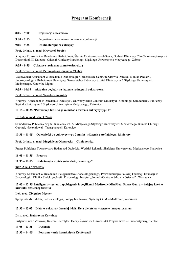 Program Konferencji 8:15 – 9:00 Rejestracja uczestników 9:00 – 9:15 Przywitanie uczestników i otwarcie Konferencji 9:15 – 9:35 Insulinoterapia w cukrzycy Prof. dr hab. n. med. Krzysztof Strojek Krajowy Konsultant w Dziedzinie Diabetologii, Śląskie Centrum Chorób Serca, Oddział Kliniczny Chorób Wewnętrznych i Diabetologii III Katedra i Oddział Kliniczny Kardiologii Śląskiego Uniwersytetu Medycznego, Zabrze 9:35 – 9:55 Cukrzyca związana z mukowiscydozą Prof. dr hab. n. med. Przemysława Jarosz – Chobot Wojewódzki Konsultant w Dziedzinie Diabetologii, Górnośląskie Centrum Zdrowia Dziecka, Klinika Pediatrii, Endokrynologii i Diabetologii Dziecięcej, Samodzielny Publiczny Szpital Kliniczny nr 6 Śląskiego Uniwersytetu Medycznego, Katowice-Ligota 9:55 – 10:15 Aktualne poglądy na leczenie retinopatii cukrzycowej Prof. dr hab. n. med. Wanda Romaniuk Krajowy Konsultant w Dziedzinie Okulistyki, Uniwersyteckie Centrum Okulistyki i Onkologii, Samodzielny Publiczny Szpital Kliniczny nr 5 Śląskiego Uniwersytetu Medycznego, Katowice 10:15 – 10:35 "Przeszczep trzustki jako metoda leczenia cukrzycy typu I" Dr hab. n. med. Jacek Ziaja Samodzielny Publiczny Szpital Kliniczny im. A. Mielęckiego Śląskiego Uniwersytetu Medycznego, Klinika Chirurgii Ogólnej, Naczyniowej i Transplantacji, Katowice 10:35 – 11:05 Od otyłości do cukrzycy typu 2 punkt widzenia patofizjologa i klinicysty Prof. dr hab. n. med. Magdalena Olszanecka – Glinianowicz Prezes Polskiego Towarzystwa Badań nad Otyłością, Wydział Lekarski Śląskiego Uniwersytetu Medycznego, Katowice 11:05 – 11:35 Przerwa 11;35 – 12:05 Diabetologia w pielęgniarstwie, co nowego? mgr Alicja Szewczyk, Krajowy Konsultant w Dziedzinie Pielęgniarstwa Diabetologicznego, Przewodnicząca Polskiej Federacji Edukacji w Diabetologii, Klinika Endokrynologii i Diabetologii Instytut „Pomnik-Centrum Zdrowia Dziecka” , Warszawa 12:05 – 12:35 Inteligentny system zapobiegania hipoglikemii Medtronic MiniMed. Smart Guard – kolejny krok w kierunku sztucznej trzustki Lek. med. Zbigniew Męcner Specjalista ds. Edukacji – Diabetologia, Pompy Insulinowe, Systemy CGM – Medtronic, Warszawa 12:35 – 13.05 Dieta w cukrzycy dawniej i dziś. Rola dietetyka w zespole terapeutycznym Dr n. med. Katarzyna Kowalcze Instytut Nauk o Zdrowiu, Katedra Dietetyki i Oceny Żywności, Uniwersytet Przyrodniczo – Humanistyczny, Siedlce 13:05 – 13:35 Dyskusja 13:35 – 14:05 Podsumowanie i zamknięcie Konferencji