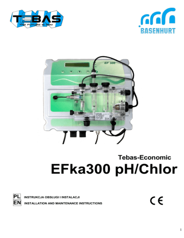 Tebas-Economic EFka300 pH/Chlor PL EN INSTRUKCJA OBSŁUGI I INSTALACJI INSTALLATION AND MAINTENANCE INSTRUCTIONS 1 OSTRZEŻENIA Niniejsza instrukcja przeznaczona jest dla personelu technicznego odpowiedzialnego za instalację, zarządzanie i utrzymanie urządzenia. Producent nie ponosi żadnej odpowiedzialności za uszkodzenia i usterki, które wystąpiły po interwencji przez osoby nieuprawnione lub przez zachowania niezgodne z instrukcją. Przed wykonaniem jakichkolwiek czynności konserwacyjnych i naprawczych, należy upewnić się, że system jest izolowany elektrycznie i hydraulicznie. Z materiałem odpadowym i materiałem eksploatacyjnym należy postępować zgodnie z lokalnymi przepisami. OGÓLNE WSKAZÓWKI BEZPIECZEŃSTWA UWAGA! Przed wykonaniem jakichkolwiek operacji na urządzeniu, należy je odłączyć od zasilania. Nigdy nie wykonuj żadnych operacji na pracującej pompie. Podczas prac konserwacyjnych i naprawy części, które zazwyczaj są w kontakcie z substancjami chemicznymi, zawsze należy nosić odzież ochronną (rękawice, odzież, okulary, itp.). Urządzenie musi być obsługiwane tylko przez wykwalifikowany personel. Zawsze należy używać oryginalnych części zamiennych. Niezastosowanie się do instrukcji może spowodować uszkodzenie sprzętu, a w skrajnych przypadkach obrażenia ludzi. Producent może zmodyfikować urządzenie, instrukcję lub dane techniczne bez wcześniejszego powiadomienia. GWARANCJA Urządzenie posiada 24-miesięczną gwarancję od daty dostawy. Gwarancja jest nieważna, gdy instrukcje instalacji, konserwacji i użytkowania, nie są ściśle przestrzegane przez użytkownika. Lokalne przepisy i odpowiednie normy również muszą być przestrzegane. Gwarancja będzie uznana tylko wtedy, gdy spełnione zostaną następujące warunki: o Instalacja, okablowanie, regulacja, konserwacja i naprawy są wykonywane wyłącznie przez wykwalifikowany personel o Pompa dozująca była użytkowana zgodnie z jej przeznaczeniem opisanym w niniejszej instrukcji o Tylko oryginalne części zamienne były używane podczas napraw Z gwarancji wyłączone są wszystkie elementy eksploatacyjne (wężyki, uszczelki ,elektrody itp.). Uszkodzenia mechaniczne nie podlegają gwarancji. 2 Spis treści LISTA ELEMENTÓW..................................................................................................................................... 4 WSTĘP .......................................................................................................................................................... 4 INSTALACJA ................................................................................................................................................ 4 DANE TECHNICZNE ..................................................................................................................................... 4 OPIS DZIAŁANIA SYSTEMU ........................................................................................................................ 5 PODŁĄCZENIE ELEKTRYCZNE .................................................................................................................. 6 Podłączenie pomp dozujących ...................................................................................................... 6 Kontrola przepływu ........................................................................................................................ 7 Podłączenie wewnętrzne (tylko dla wykwalifikowanego personelu)........................................... 7 URUCHOMIENIE ........................................................................................................................................... 8 PODGLĄD POMIARÓW ................................................................................................................................ 8 DZIAŁANIE URZĄDZENIA ............................................................................................................................ 8 Standardowa konfiguracja ............................................................................................................. 8 Zaawansowana konfiguracja ......................................................................................................... 9 Lista parametrów konfiguracyjnych .............................................................................................. 9 Kalibracja elektrochemiczna .......................................................................................................... 11 Tryb ręczny ..................................................................................................................................... 12 TYPOWE USTAWIENIA ................................................................................................................................ 12 KOMORA AMPEROMETRYCZNA CLE12 .................................................................................................... 13 Dane techniczne ............................................................................................................................. 13 Instalacja i podłączenie hydrauliczne ........................................................................................... 13 Kondycjonowanie elektrody .......................................................................................................... 14 Ostrzeżenia ..................................................................................................................................... 14 BŁĘDY/ALARMY ........................................................................................................................................... 14 UTRZYMANIE ................................................................................................................................................ 15 DODATKI I CZĘŚCI ZAMIENNE ..............................................................................................