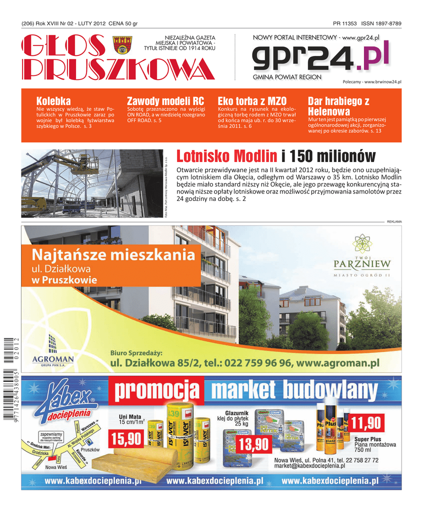 (206) Rok XVIII Nr 02 - LUTY 2012 CENA 50 gr PR 11353 ISSN 1897-8789 GŁOS PRUSZKOWA NIEZALEŻNA GAZETA MIEJSKA I POWIATOWA TYTUŁ ISTNIEJE OD 1914 ROKU Zawody modeli RC Sobotę przeznaczono na wyścigi ON ROAD, a w niedzielę rozegrano OFF ROAD. s. 5 Foto: Maz. Port Lotniczy Warszawa-Modlin Sp. z o.o. Kolebka Nie wszyscy wiedzą, że staw Potulickich w Pruszkowie zaraz po wojnie był kolebką łyżwiarstwa szybkiego w Polsce. s. 3 NOWY PORTAL INTERNETOWY - www.gpr24.pl GMINA POWIAT REGION Eko torba z MZO Konkurs na rysunek na ekologiczną torbę rodem z MZO trwał od końca maja ub. r. do 30 września 2011. s. 6 Polecamy - www.brwinow24.pl Dar hrabiego z Helenowa Mur ten jest pamiątką po pierwszej ogólnonarodowej akcji, zorganizowanej po okresie zaborów. s. 13 Lotnisko Modlin i 150 milionów Otwarcie przewidywane jest na II kwartał 2012 roku, będzie ono uzupełniającym lotniskiem dla Okęcia, odległym od Warszawy o 35 km. Lotnisko Modlin będzie miało standard niższy niż Okęcie, ale jego przewagę konkurencyjną stanowią niższe opłaty lotniskowe oraz możliwość przyjmowania samolotów przez 24 godziny na dobę. s. 2 REKLAMA 2 www.gpr24.pl www.gazeta.pruszkow.pl GŁOS PRUSZKOWA NR 02/2012 Reportaż budowa lotniska dobiega końca Lotnisko Modlin i 150 milionów Dokończenie budowy lotniska na Euro 2012. Jerzy W. Ryll D la tego lotniska emisja obligacji oznacza domknięcie finansowania inwestycji. Na mocy zmienionej wcześniej umowy spółki, województwo zobowiązało się do podnoszenia kapitału zakładowwego spółki poprzez objęcie nowych udziałów, gdy spółka nie będzie w stanie samodzielnie zgromadzić odpowiednich środków na wykup obligacji. Otwarcie przewidywane jest na II kwartał 2012 roku, kiedy będąc uzupełniającym lotniskiem dla Okęcia, odległym od Warszawy o 35 km, Modlin obsługiwać będzie część ruchu lotniczego na EURO 2012. Walorem Mazowieckiego Portu Lotniczego Warszawa-Modlin jest jego potencjał rozwojowy w sprzyjającym środowisku społecznym i wpisanie w rozbudowywaną, unowocześnianą infrastrukturę komunikacyjną - oczko w głowie samorządów współpracujących i unikających konfliktów. Wicemarszałek Krzysztof Grzegorz Strzałkowski podkreślił, iż „do tej pory województwo objęło udziały w podwyższonym kapitale zakładowym spółki na kwotę blisko 100 milionów złotych, a teraz zabezpieczyło na ten cel kolejne 200 milionów”. Lotnisko Modlin będzie miało standard niższy niż Okęcie, ale jego przewagę konkurencyjną stanowią niższe opłaty lotniskowe oraz możliwość przyjmowania samolotów przez 24 godziny na dobę. Na usytuowanym w obrębie nieformalnej aglomeracji warszawskiej Okęciu lądowanie w nocy jest zakazane za względu na hałas dotyczący okolicznych dzielnic Warszawy oraz okolicznych miast z Piasecznem i Pruszkowem włącznie. Jest to sytuacja podobna do wcześniejszego losu stolicy Norwegii Oslo - tam nowoczesne lotnisko Gardermoen zlokalizowano 60 km od miasta, zapewniając połączenie szybkim pociągiem Flytoget w czasie 20 minut oraz autobusem w czasie 40 minut. Oczywiście musiało się to wiązać z powstaniem hotelu przylotniskowego. Podobnie musi się stać docelowo z Mazowieckim Portem Lotniczym Warszawa-Modlin - konieczne jest tam w Modlinie zaistnienie hotelu przylotniskowego wraz z doprowadzeniem bocznicy kolejowej (częściowo w tunelu) do dworca krańcowego przy terminalu. Tymczasem dopiero teraz otwierana jest procedura pozyskania decyzji środowiskowej dla tej łącznicy kolejowej. Warszawska łącznica kolejowa wraz z podziemnym dworcem na lotnisku imienia Fryderyka Chopina na Okęciu ma być gotowa na wiosnę 2012. Będzie to wtedy, gdy w Modlinie ruszy eksploatacja alternatywnego, uzupełniającego portu lotniczego. Jego patron jest dotychczas nieznany, choć ze względu na historię powinien nim być Pierwszy Marszałek Polski Józef Piłsudski, przedwojenny patron lotniska Okęcie. A propos przypomnijmy, iż lotnisko Monachium ma za patrona Franza Josefa Straussa, a inne porty lotnicze w Polsce przyjęły za patrona Jana Pawła II w Krakowie oraz Lecha Wałęsę w Gdańsku. Tymczasem Modlin obsługiwać będą autobusy wahadłowe do stacji kolejowej Nowy Dwór Mazowiecki lub przystanku Modlin, którego zabytkowy budynek stacyjny jest w stadiun rewaloryzacji. Podczas EURO 2012 Modlin dostanie tzw. general aviation, czyli maszyny biznesowe (business jets) np. moskiewskich i/lub petersburskich oligarchów z podstawieniem limuzyn bezpośrednio na płytę lotniska oraz odprawą paszportowo-wizową i celną jeszcze na pokładzie samolotów. Gdyby nowy terminal Modlina Mazowiecki Port Lotniczy Warszawa-Modlin Sp. z o.o. ląduje na ostatniej prostej swej budowy, pozyskując 150 milionów złotych na finansowanie inwestycji poprzez emisję obligacji. 10. stycznia 2012 roku w urzędzie marszałkowskim Województwa Mazowieckiego wspólnicy spółki, członkowie zarządu oraz przedstawiciele Banku Pekao S.A. podpisali umowę wsparcia realizacji projektu o nazwie „Uruchomienie lotniska komunikacyjnego poprzez modernizację Portu Lotniczego Warszawa-Modlin”. Jego budowa ruszyła z martwego punktu 8. października 2010 roku jako wielka inicjatywa samorządowa. Jest to kluczowa inwestycja infrastrukturalna Mazowsza, czyli alternatywne lotnisko regionalne wspomagające obsługę aglomeracji warszawskiej oraz aktywizujące północne Mazowsze. nie został jeszcze ukończony na czas EURO 2012, skoro jego zaawansowanie wynosi obecnie 70%, ruch przyjmie zakupiony na wszelki wypadek terminal kontenerowy, przypominający niesławnej pamięci Terminal Etiuda na Okęciu, czyli obecny terminal autobusowy. Po EURO 2012 do Modlina latać będą chartery i tanie linie, np. irlandzki Ryanair. W sytuacjach awaryjnych - gdy Okęcie będzie z jakiegoś powodu unieruchomione, Modlin przejmie ruch przeznaczany normalnie dla Okęcia. Sytuacje specjalne mogą się zdarzyć w każdej niespodziewnej c