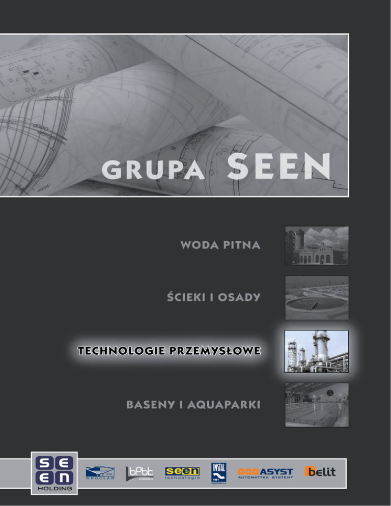 WODA PITNA ŚCIEKI I OSADY TECHNOLOGIE PRZEMYSŁOWE BASENY I AQUAPARKI Szanowni Państwo, Rafał Lipiński Prezes Zarządu Helene Zaleski Wiceprezes Zarządu Gianni Mancini Wiceprezes Zarządu Tomasz Przyłuski Wiceprezes Zarządu Jacek Tokarczyk Wiceprezes Zarządu Nasze firmy już ponad 55 lat pracują dla przemysłu. Wykonujemy instalacje wodne, mechaniczne, elektryczne, automatyki i specjalistyczne. Kompleksowo realizujemy inwestycje w zakresie ochrony środowiska, jako jedna z nielicznych firm posiadamy: strukturę składającą się z 6 specjalistycznych firm, wykwalifikowaną kadrę ponad 100 inżynierów i blisko 150 montażystów, własne zaplecze projektowe i technologiczne, referencje i doświadczenie ponad 600 realizacji przemysłowych, finanse, kapitał zakładowy holdingu wynosi ponad 50 mln zł. Zdobyte doświadczenie prac y w zakładach przemysłowych nauczyło nas, że wobec wykonawców stawiane są wysokie wymagania. Dla Państwa liczy się nie tylko koszt inwestycji, ale również ważne jest ograniczenie przestojów produkcji. Bardzo często przeprowadzamy modernizację obiektów technologicznych, nie przerywając produkcji. Nierzadko musimy spełniać wymagania higieniczne wymagane przy produkcji spożywczej. Te trudne warunki nauczyły nas odpowiedzialności, dlatego często podejmujemy się również wykonywania instalacji niebezpiecznych (toksycznych, czy zagrażających wybuchem). Obecnie dzięki przystąpieniu do naszego holdingu inwestora finansowego z grupy Carlo Tassara oraz naszemu wieloletniemu doświadczeniu zagranicznemu, jesteśmy firma międzynarodową: jesteśmy od lat przedstawicielem i partnerem handlowym największych firm technologicznych świata z USA, Niemiec, Francji, Japonii, Wielkiej Brytanii i Włoch, uruchomiliśmy oddziały i firmy zagraniczne we Francji, Niemczech, na Węgrzech, Ukrainie, Białorusi i Rosji, uczestniczymy w realizacji kilkuset inwestycji na obszarze 18 krajów, potrafimy współpracować z międzynarodowymi koncernami i znamy światowe standardy jakości. Mamy ambicje być firmą nowoczesną. Posiadamy własne rozwiązania technologiczne i patenty. Wśród naszych stałych partnerów są światowi liderzy w produkcji urządzeń i dostawie technologii przemysłowych. Jesteśmy dobrze przygotowani, aby realizować dla Państwa kolejne również i te najciekawsze zadania inwestycyjne. Naszym Przesłaniem jest, aby realizując inwestycje przemysłowe, być inżynierami dla Środowiska. Pragniemy być inżynierami dla Państwa. Z poważaniem Rafał Lipiński Prezes SEEN Holding 2 STRUKTURA MOŻLIWOŚĆ KOMPLEKSOWEJ REALIZACJI INWESTYCJI GRUPY SEEN STRUKTURA ORGANIZACYJNA HOLDINGU: Technologie i zarządzanie kontraktami Firma Seen Technologie powstała w 1990 roku. Zajmuje się realizacją inwestycji ochrony środowiska. Posiada: biura w Warszawie i Gliwicach oraz 2 oddziały w Polsce. Reprezentuje w Polsce renomowanych światowych producentów i dostawców technologii i urządzeń. Zatrudnia ponad 50 inżynierów i techników w zespołach zarządzających kompleksową realizacją projektów ochrony środowiska, zespołach technologów, serwisie i grupie uruchomieniowej. Instalacje mechaniczne Instal jest jedną z największych i najdłużej istniejących firm instalacyjnych w Polsce. W 1951 roku powstało Państwowe Przedsiębiorstwo Instalacji Przemysłowych Instal Warszawa, które w 1993 roku zostało przekształcone w spółkę INSTAL WARSZAWA S. A. Zatrudnia około 150 osób. Wykonuje instalacje sanitarne, technologiczne, przemysłowe oraz konstrukcje stalowe. Posiada możliwości produkcyjne zarówno z różnych gatunków stali i tworzyw sztucznych. Grupa projektowa BPBK Wrocław powstało w 1951 roku. Skupiło inżynierów z wieloletnim, bogatym doświadczeniem w branży wodno-kanalizacyjnej. Dysponuje zespołem blisko 50 projektantów. Wykonało dziesiątki projektów obiektów komunalnych: stacji uzdatniania wody, oczyszczalni ścieków, sieci wodno-kanalizacyjnych, oraz ochrony środowiska, jak również wiele projektów instalacji przemysłowych, pompowni, spalarni i suszarni oraz obiektów basenowych. BPBK w Bydgoszczy to wielobranżowe biuro projektowe z pracowniami (oprócz pracowni konstrukcyjnej): technologiczno-sanitarną, drogową i tramwajową – w których zakresie uzupełnia ofertę Biura we Wrocławiu. Nowa spółka Holdingu istnieje od 1953 roku i zatrudnia 50 projektantów. Automatyka Asyst jest firmą, której trzon stanowią inżynierowie i technicy z dużym doświadczeniem w dziedzinach takich jak: uzdatnianie wody, oczyszczanie ścieków, obróbka cieplna metali, transport i paletyzacja produktów w przemyśle spożywczym, samochodowym. Kadrę inzynierską stanowią absolwenci renomowanych uczelni. Pracownicy spółki Asyst zdobywali doświadczenie na rynku polskim jak i poza granicami kraju. Instalacje elektryczne Belit oferuje kompleksowe rozwiązania w zakresie budowy instalacji elektrycznych. Mający wieloletnie doświadczenie oraz kompetencje zespół oferuje rozwiązania i realizuje usług w zakresie: instalacji elektrycznych, systemów ochrony osób i mienia w formie zabezpieczenia technicznego, systemów telekomunikacyjnych oraz sieci komputerowych. Spółka Belit współpracuje od lat z największymi firmami budowlanymi działającymi na terenie kraju. Nasz inwestor – firma Socamil należy do fundacji Zygmunta Zaleskiego, która poprzez Carlo Tassara posiada udziały w przedsiębiorstwach sektora hutniczego (Arcelor-Mittal), energetyki (EDF Energy), bankowości (Intesa San Paolo, Alior Bank) i ubezpieczeń. Spółka ta została założona w 1938 r. Jej siedziba mieści się w Breno we Włoszech. 3 TECHNOLOGIE Technologiami przemysłowymi zajmujemy się od wielu lat, realizując projekty w wielu branżach przemysłu. Współpracujemy tam, gdzie w procesie przemysłowym niezbędna jest woda. Dekarbonizacja wody – instalacja akceleratorów, układy sedymentacji, lamelle. Koagulacja – syst