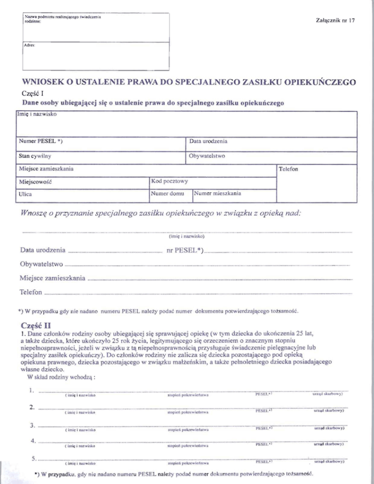 W przypadku, gdy prawo do specjalnego zasitku opiekunczego ustala si~ na oso~ znajduj /tc/t s i~ pod opiekll opiekuna prawnego lub umieszczonf\, w rodzinie zastC(pczej spokrewnionej w rozumieniu ustawy z dnia 9 czerwca 2011 r. 0 wspieraniu rodziny i systemie pieczy zastC(pczej (Oz. U. Nr 149 poz. 887 i Nr 288, poz. )690 oraz z 2012 r. poz. 579 i 1519) ustalaj/tc prawo do specjalnego zasilku opiekunczego nalety wskazac dane czlonk6w rodziny sprawujl\,cej opiekC( oraz dane 0 oby wymagajltcej opieki. • ) W przypadku, gdy nie nadano numeru PESEL nalety podac numer dokumentu potwier<izajll.cego toZsam osc.