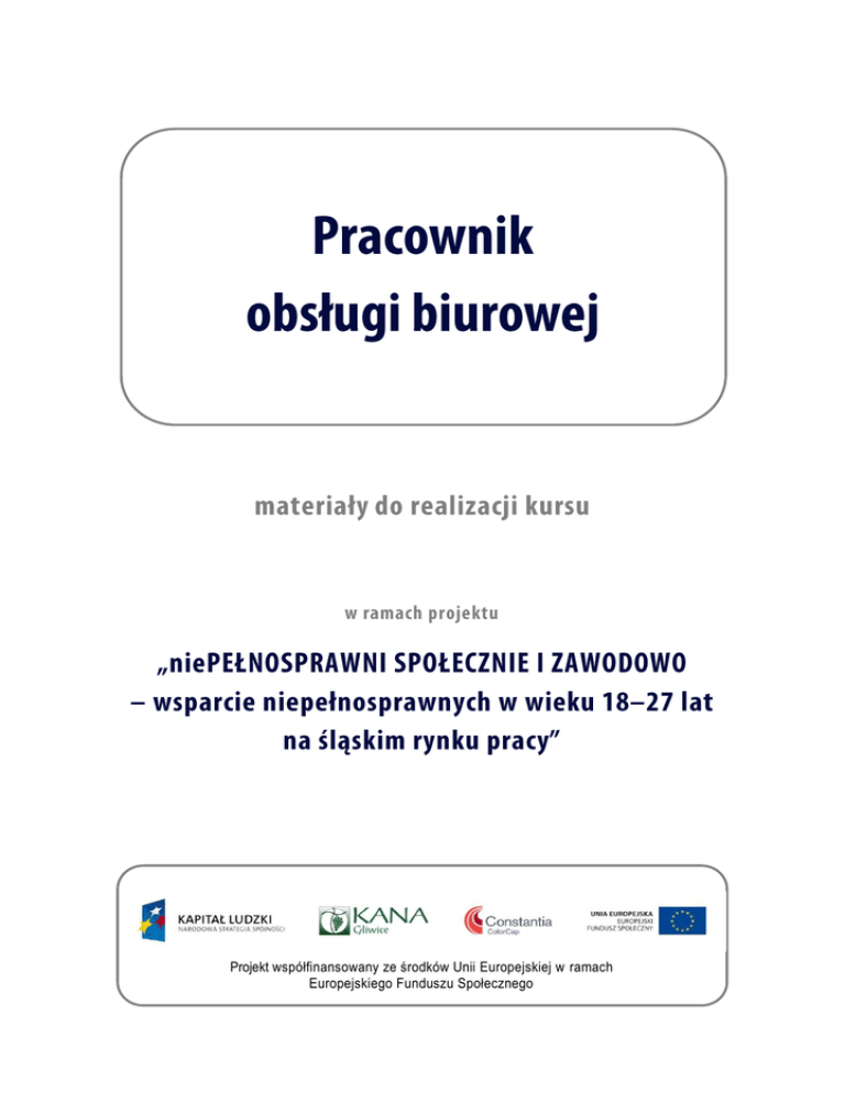 Projekt współfinansowany ze środków Unii Europejskiej w ramach Europejskiego Funduszu Społecznego Materiały współfinansowane ze środków Unii Europejskiej w ramach Europejskiego Funduszu Społecznego (Priorytet VII – Promocja integracji społecznej, Działanie 7.4. Niepełnosprawni na rynku pracy). PUBLIKACJA DYSTRYBUOWANA BEZPŁATNIE Redakcja: Marta Wysocka Recenzja i konsultacja merytoryczna: dr Katarzyna Skierska-Pięta Korekta: Magdalena Torczyńska Skład: Joanna Skrońska Projekt okładki: Joanna Skrońska Wydawca: Instytut Nauk Społeczno-Ekonomicznych sp. z o.o. – sp. k. ul. Polskiej Organizacji Wojskowej 17 90–248 Łódź tel. 42 633 17 19 www.inse.org.pl Łódź 2013 ISBN 978-83-7834-205-2 Druk: PIKTOR Szlaski i Sobczak Spółka Jawna ul. Tomaszowska 27 93–231 Łódź www.piktor.pl Pracownik obsługi biurowej Wstęp .............................................................................................................. 5 1. Specyfika obowiązków pracownika biurowego oraz predyspozycje do wykonywania tego zawodu ..................................................................... 7 1.1. Pytania kontrolne...............................................................................11 2. Bezpieczeństwo i higiena pracy biurowej ............................................. 13 2.1. Pytania i ćwiczenia kontrolne ......................................................... 21 3. Redagowanie pism – podstawowe zasady ...........................................23 3.1. Rodzaje pism: protokół, sprawozdanie, notatka służbowa ........ 30 3.1.1. Ćwiczenia kontrolne ....................................................... 35 3.2. Rodzaje pism: pismo przewodnie, zaproszenie, zaświadczenie, upoważnienie oraz akty ogólne..............................................................36 3.2.1. Pytania i ćwiczenia kontrolne ........................................ 44 4. Pisma związane ze stosunkiem pracy ...................................................47 4.1. Pytania i ćwiczenia kontrolne .........................................................54 4.2. Pisma dotyczące rozwiązania stosunku pracy ..............................54 4.2.1. Pytania i ćwiczenia kontrolne ........................................ 63 5. Korespondencja handlowa ....................................................................65 5.1. Pytania i ćwiczenia kontrolne..........................................................70 6. Zagadnienia obiegu pism. Systemy kancelaryjne ............................... 71 6.1. Pytania kontrolne .............................................................................76 Zakończenie ................................................................................................. 77 Bibliografia...................................................................................................79 Spis rysunków, tabel i wzorów .................................................................. 81 I 3 Niniejsze materiały są wsparciem merytorycznym dla osób, które będą uczestniczyły w kursie pozwalającym zdobyć kwalifikacje pracownika biurowego. Materiały do realizacji kursu powstały w ramach projektu Niepełnosprawni społecznie i zawodowo – wsparcie niepełnosprawnych w wieku 18–27 lat na śląskim rynku pracy. Projekt współfinansowany jest przez Europejski Fundusz Społeczny (Priorytet VII – Promocja integracji społecznej, Działanie 7.4. Niepełnosprawni na rynku pracy) i realizowany przez Katolickie Centrum Edukacji Młodzieży Kana. Publikacja stanowi materiał pomocniczy, przydatny zarówno w toku zajęć, jak i po ich zakończeniu, ponieważ z powodzeniem może pełnić funkcję repetytorium zawierającego ważne wiadomości. Opracowanie pozwala poznać podstawowe zagadnienia istotne w pracy biurowej. W pierwszej kolejności wyjaśnia, jaka jest specyfika zadań osoby wykonującej ten zawód, a także, jakimi cechami powinna się ona odznaczać. Następnie opisano wymogi bezpieczeństwa i higieny pracy w zakresie czynności biurowych. Kolejne rozdziały publikacji to bezpośrednie wprowadzenie w zagadnienia zawodowe. Pozwalają one dowiedzieć się, w jaki spo- 6 I Materiały do realizacji kursu sób redagować pisma, jak napisać protokół, sprawozdanie, pismo przewodnie i wiele innych. Dotknięto w nich kwestii związanych z nawiązywaniem oraz rozwiązywaniem stosunku pracy, a także obowiązkami pracownika obsługi biurowej w zakresie tworzenia związanych z tym dokumentów. Publikacja umożliwia również zdobycie wiedzy w zakresie korespondencji handlowej oraz zasad, na podstawie których w firmach czy instytucjach funkcjonuje obieg pism zewnętrznych i wewnętrznych. Przyjęcie takiej struktury materiałów pozwoliło zagwarantować ich kompleksowość i przejrzystość oraz stopniowe wprowadzanie uczestników warsztatów w coraz bardziej skomplikowane obszary związane z obowiązkami pracownika biurowego. Obsługa biura obejmuje wiele typów działań. W zakres obowiązków na stanowiskach biurowych wchodzą zarówno aktywności umysłowe o dużym stopniu skomplikowania, wymagające twórczego podejścia, jak i te proste, rutynowe, szablonowe1. Szerokie rozumienie terminu „praca biurowa” pozwala wymienić wśród instytucji, w których ten typ aktywności zawodowej dominuje, takie placówki jak banki, giełdy, firmy ubezpieczeniowe, prawnicze, notarialne, podatkowe, doradcze, informatyczne, administrację państwową oraz inne tego typu. Głównym zadaniem pracowników tych placówek jest gromadzenie i przetwarzanie informacji o różnym stopniu skomplikowania. W wyniku takich działań mogą powstawać rozmaite teksty, bazy danych, decyzje, prognozy, raporty i inne tego rodzaju wytwory. Pracownicy biurowi przede wszystkim czuwają nad porządkiem wśród danych, które trafiają do firmy lub instytucji z zeM. Konarska, Praca biurowa - organizacja stanowiska pracy, www.ciop.pl/ 11742.html, [data dostępu: 16.07.2