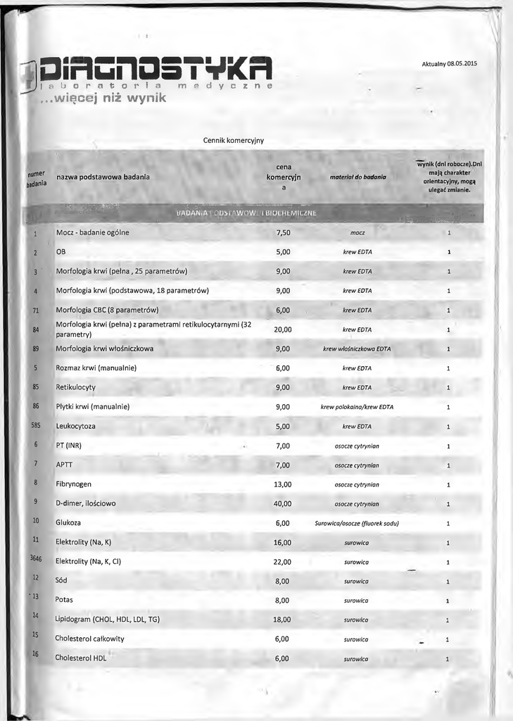 " 0 ir t= n a 5 7 ¥Xrl f j l p b o p a - t o r l a m M Aktualny 08.05.2015 y c z n e .„.więcej niż wynik Cennik komercyjny wynik (dni roboczeJ.Dni mają charakter orientacyjny, mogą ulegać zmianie. cen a numer badania n a z w a p o d s ta w o w a b a d a n ia k o m e rc y jn : ■ m E B h h 9 S |H K H ||H M materia! do badania a J f J f J Ilw J ; : 5 = ■ - ■" ' / i’ W & BMmmmk-: Mocz - badanie ogólne 7,50 mocz i OB 5,00 krew EDTA i Morfologia krwi (petna, 25 parametrów) 9,00 krew EDTA i 4 Morfologia krwi (podstawowa, 18 parametrów) 9,00 krew EDTA i 71 Morfologia CBC (8 parametrów) 6,00 krew EDTA i 84 Morfologia krwi (petna) z parametrami retikulocytarnymi (32 parametry) 20,00 krew EDTA i 89 Morfologia krwi wtośniczkowa 9,00 krew wtośniczkowa EDTA i 5 Rozmaz krwi (manualnie) 6,00 krew EDTA i 85 Retikulocyty 9,00 krew EDTA i 86 Płytki krwi (manualnie) 9,00 krew polokaina/krew EDTA i 585 Leukocytoza 5,00 krew EDTA i 6 PT(INR) 7,00 osocze cytrynian i 7 APTT 7,00 osocze cytrynian i 8 Fibrynogen 13,00 osocze cytrynian i 9 D-dimer, ilościowo 40,00 osocze cytrynian i 10 Glukoza 6,00 Surowica/osocze (fluorek sodu) i 11 Elektrolity (Na, K) 16,00 surowica i Elektrolity (Na, K, Cl) 22,00 surowica i 12 Sód 8,00 surowica i 13 Potas 8,00 surowica i Lipidogram (CHOL, HDL, LDL, TG) 18,00 surowica i Cholesterol całkowity 6,00 surowico i Cholesterol HDL 6,00 surowica i ■1 2 3 3646 ‘ 14 15 16 ' •:/ 3606 Usług 3608 Dostć 10003 Pobr- 10004 Pobr 17 Cholesterol LDL met. bezpośrednią 7,00 surowica 18 Trójglicerydy (TG) 6,00 surowica 19 Próby wątrobowe (ALT, AST. ALP, BIL, GGTP) 23,00 surowica al t 6,00 surowica 21 AST 6,00 surowica 22 Fosfataza zasadowa (ALP) 6,00 surowica 23 Bilirubina całkowita 6,00 surowica 24 : Bilirubina związana (bezpośrednia) 6,00 surowico 25 Bilirubina wolna (pośrednia) 11,00 surowica 26 GGTP 6,00 surowica 27 Cholinoesteraza 10,00 surowica 28 Dehydrogenaza mleczanowa (LDH) 8,00 surowica Dehydrogenaza mleczanowa (LDH) w płynie z jam ciała 8,00 płyn z jam ciaia 30 Lipaza 10,00 surowica 31 Amylaza 7,00 surowica Amylaza w płynie z jam ciała 7,00 ptyn z jam ciała Mocznik 6,00 surowica Kreatynina 6,00 surowica 34 Klirens kreatyniny 10,00 surowica + mocz DZM 35 Cystatyna C 100,00 surowica lub osocze heparynowe 36 Kwas moczowy 6,00 surowica 37 Białko całkowite 6,00 surowica 942 Białko w PMR 13,00 PMR 38 Albumina 6,00 surowica Albumina w płynie z jam ciała 20,00 płyn z jam ciała Albumina w PMR 30,00 PMR 39 Proteinogram 16,00 surowica 40 Żelazo 6,00 surowica 41 Ferrytyna 30,00 surowica 42 Wapń całkowity 6,00 surowica 43 Wapń zjonizowany 6,00 surowica Wapń zjonizowany met. ISE 10,00 surowica 20 Do badćiń o kod: : 3582 3581 32 33 928 3571 3412 \ ’; 0 . 44 Chlorki 10,00 surowica 1 45 Fosfor nieorganiczny 6,00 surowica 1 46 Magnez 6,00 surowica 1 244 Mukoproteiny 15,00 surowica 565 Hemoglobina wolna we krwi 15,00 surowica 950 Test obciążenia glukozą (2pkt, 50g, lh) 14,00 surowica/osocze (fluorek sodu) 951 Test obciążenia glukozą (3pkt, 75g, 1 i 2h) 20,00 surowica/osocze (fluorek sodu) 952 Test tolerancji glukozy ciężarnych (lpkt, 50g, lh) 7,00 surowica/osocze (fluorek sodu) 953 Test obciążenia glukozą (2pkt, 75g, 2h) 14,00 surowica/osocze (fluorek sodu) 1 954 Test obciążenia glukozą (2pkt, 50g, 2h) 14,00 surowica/osocze (fluorek sodu) 1i 955 Test obciążenia glukozą (3pkt, 50g, 1 i 2h) 20,00 surowica/osocze (fluorek sodu) . 1 956 Test obciążenia glukozą (2pkt, 75g, lh) 14,00 surowica/osocze (fluorek sodu) 966 Test obiążenia laktozą 25,00 osocze (fluorek sodu) 3702 Próba tymolowa 5,00 surowica 592 Mielogram 100,00 szpik kostny BADANIA KAŁU ^ 1 2 1 1 1 11181 48 Adenowirusy w kale 25,00 kat i 49 Rotawirusy w kale 25,00 kal i 50 Kai - badanie ogólne (barwa, konsystencja, woń, odczyn, krew w kale, krople tłuszczu, ziarna skrobi, komórki roślinne, kał 25,00 kat 3 Kał - badanie ogólne + ciała redukujące 25,00 kal do 5 58 Kał - rota i adenowirusy 45,00 kat 1 51 Kał - resztki pokarmowe 11,00 kal 1 52 Kał- pasożyty (1 ozn.) 10,00 kal 1 Kał pasożyty - Parasept SF (1 ozn.) - metoda dekantacji przy użyciu probówki o specjalnej budowie 20,00 kal pobrany z trzech miejsc 1 3756 3234 53 Owsiki (wymaz parazytologiczny) 6,00 celofan +szkielko/wymaz 54 Kał - G. lamblia met. ELISA 29,00 kal 1 55 Kał - krew utajona (bez diety) 22,00 kal 1 56 Kał - krew utajona (z zachowaniem diety) 22,00 kal 1 57 Kał - nosicielstwo Salmonella (3 ozn.) 115,00 kal +zlecenie, pon.-śr. 10 ( t y m d& o'*/Juj 10005 Kał - nosicielstwo SS (2 próbka do badania 57) 0,00 kal +zlecenie, pon.-śr. 0 10006 Kał - nosicielstwo SS ( 3bpróbka do badania 57) 0,00 kal +zlecenie, pon.-śr. 0 Kał norowirusy 80,00 kal 5 59 / 582 Elastaza trzustkowa w kale 160,00 kal 14 584 Kalprotektyna w kale met. ELISA 150,00 kal (pon-czw) max do 72 h od pobrania, 2-8 st-C 18 589 M2-PK w kale met. ELISA ( oznaczenie stężenia dimerycznej formy izoenzymu kinazy pirogronianowej) 195,00 kal (pon-śr) max do 24 h od pobrania 15 590 Laktoferyna w kale met. ELISA 160,00 kai (pon-śr) max do 24 h od pobrania 36 1101 Kał posiew (bad.bakter.) 30,00 kal do 7 2101 Kał posiew (bad. mykol.) 30,00 kat do 7 1252 Posiew kału w kierunku Salmonella/Shigella (bad. bakter.) 70,00 kol do 7 1254 Posiew kału w kierunku enteropatogennej Escherichia coli ( EPEC) 40,00 kal 7 1256 Posiew kału w kierunku Campylobacter 130,00 kat 5 1268 Clostridium difficile, toksyna A/B w kale 70,00 kat 1 1270 Clostridium difficile, antygen GDH i toksyna A/B w kale 120,00 kal 3 3235 Kał, hodowla w kierunku nicieni 30,00 kal 14 3236 Kał - pasożyty tropikalne 45,00 kal 14 3237 Rodzaj pasożyta w materiale biologicznym 90,00 plwocina, skóra, kal, mocz 14 3217 Kał w kierunku pasożytów rodzimych (WCMP) 40,00 kal (do 24 h w temp. 2-8'C) 0 3239 Kryptosporydioza (Cryptosporidium spp.) oocyty w kale 45,00 kat 14 370,00 kal 14 330,00 osocze heparyna litowa oraz PMR lmlpo pobraniu żwirować i zamrozić. 21
