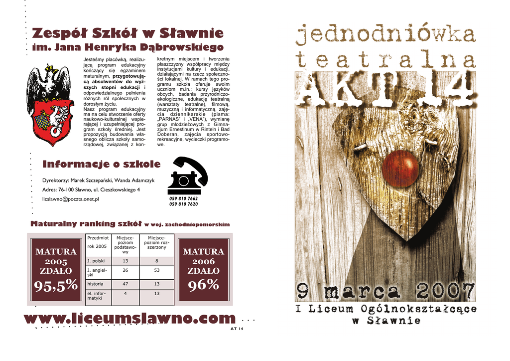 Zespół Szkół w Sławnie im. Jana Henryka Dąbrowskiego kretnym miejscem i tworzenia płaszczyzny współpracy między instytucjami kultury i edukacji, działającymi na rzecz społeczności lokalnej. W ramach tego programu szkoła oferuje swoim uczniom m.in.: kursy języków obcych, badania przyrodniczoekologiczne, edukację teatralną (warsztaty teatralne), filmową, muzyczną i informatyczną, zajęcia dziennikarskie (pisma: „PARNAS” i „VENA”), wymianę grup młodzieżowych z Gimnazjum Ernestinum w Rinteln i Bad Doberan, zajęcia sportoworekreacyjne, wycieczki programowe. Jesteśmy placówką, realizującą program edukacyjny kończący się egzaminem maturalnym, przygotowującą absolwentów do wyższych stopni edukacji i odpowiedzialnego pełnienia różnych ról społecznych w dorosłym życiu. Nasz program edukacyjny ma na celu stworzenie oferty naukowo-kulturalnej wspierającej i uzupełniającej program szkoły średniej. Jest propozycją budowania własnego oblicza szkoły samorządowej, związanej z kon- Informacje o szkole Dyrektorzy: Marek Szczepański, Wanda Adamczyk Adres: 76-100 Sławno, ul. Cieszkowskiego 4 [email protected] 059 810 7662 059 810 7620 Maturalny ranking szkół Przedmiot MATURA 2005 ZDAŁO 95,5% w woj. zachodniopomorskim rok 2005 Miejscepoziom podstawowy Miejscepoziom rozszerzony J. polski 13 8 J. angielski 26 53 historia 47 13 el. informatyki 4 13 MATURA 2006 ZDAŁO 96% www.liceumslawno.com AT 14 Klasa 2a h „Najdłuższa podróż” Stopka redakcyjna Akt14. Jednodniowa gazeta konkursowa redagowana przez pismo „VENA” działające w środowisku Zespołu Szkół w Sławnie im. Jana Henryka Dąbrowskiego. spektakl autorstwa Adama Łoniewskiego i Marzeny Lamch-Łoniewskiej Korekta: Natalia Marczuk. Lila Szokalska. Kolegium Redakcyjne: Urszula Bajtek, Daniel Czerniawski, Karolina Dolik, Hubert Franas, Martyna Gofryk, Monika Karpińska, Monika Łuczkowska, Małgorzata Nowakowska, Lila Szokalska, Jarosław Strześniewski (opiekun pisma, skład i łamanie). Reżyser Barbara Czarnuch Obsada Pasterz Danuta Gierczak Projekt i wykonanie okładki: Grzegorz Machłaj. Wróżka Iwona Wiktorowska Fotografie: Piotr Sielecki. Bankier Barbara Czarnuch Próżny Aneta Radzka Pijak Agnieszka Maciejewska Serce Paulina Wruszczak Wędkarz Agata Burchart Wiosła Iza Mickiewicz, Iza Bury, Robert Kasza, Justyna Jacyno, Magda Gunsz, Monika Tomczyk, Oktawia Olszewska, Monika Piaseczna, Paulina Jankowska Chór Str. 2 Adres redakcji: VENA-Akt13. Zespół Szkół w Sławnie, ul. Cieszkowskiego 4, 76-100 Sławno, tel./fax 0598107662, www.liceumslawno.com, [email protected]. OSOBY DZIAŁANIE Str. 23 NUMER 14 Światło Joanna Górska Dźwięk/muzyka Katarzyna Kowalska Scenografia Agata Szczepaniak Afisze, plakaty Klasa 2a Program teatralny Klasa 2a Sufler Zuzanna Rek Copyright by Zespół Szkół w Sławnie 2007 Numer zamknięto i oddano do druku 6 marca 2007 r. Szkolne wydawnictwa Szkolne publikacje znajdziesz w Centrum Informacyjnym Szkoły, na stronie internetowej LO w formacie PDF lub w siedzibie redakcji VENY. AT 14 ga, że to, co słabe i niepewne, pul- Koncepcja teatru Str. 3 NUMER 14 Klasa 2b h „Burza w Teatrze GOGO” 3 Reżyserowanie widowni widowisko według sztuki Andrzeja Maleszki 3 Pojmowanie sztuki jako umiejętności 3 Rozpatrywanie sztuki w kategoriach produktu 3 Rozumienie sztuki jako sposobu poznania suje ku swym narodzinom. Coś na swój sposób nowego między ludźmi (...)Owa rzecz (...) to odmienna wrażliwość. Jest taki wyłom, takie przekrocze- 3 Uznanie roli wyobraźni 3 Rozpoznanie terapeutycznego wymiaru sztuki 3 Przyznanie emocjom walorów poznawczych DZIAŁANIE Reżyser OSOBY Natalia Kluszczyńska Obsada Dziewczyna Anna Dziecinna Panna MłodaMatka-Królowa Pan Młody-TataKról Gogo Dagna Jończyk Lalka Emilia Dziecinna 3 Dbałość o organizację układu zdarzeń scenicz- nie granicy intensywności i lęku, są spotkania związane z wiatrem, z drzewem, z ziemią, z wodą, z ogniem, z trawą, ze zwierzęciem. I doświadczenie lotu. Człowiek, który wyrzeka się wszelkiej opowiastki na cudzy lub własny temat i wszelkiego osłonięcia, przywrócony jest obcowaniu. 3 Interpretowanie dzieła sztuki kategoriach żywego organizmu 3 Brak subiektywnej idei czasu Romek/Książe Kamil Krystjańczuk P 3 Koncepcja etosu jako sposobu reakcji Goście Angelika Lewandowska, Błażej Kochanowski, Natalia Kluszczyńska, Piotr Wojtun, Emila Polechońska, Paweł Kowalewski. Garderobiana Joanna Jaworska racując w dziedzinie teatru, krok po kroku przybliżaliśmy się do takiego pojęcia człowieka czynnego (aktora), w którym nie chodzi o to, aby przedstawić kogoś, ale być sobą, być z kimś. nych 3 Pojmowanie sztuki jako naśladowanie przyrody 3 Zakotwiczenie koncepcji czasu w fizyczności P Str. 22 rześladuje mnie problem ludzkiej samotności, nieuchronnego ludzkiego przemijania. Ale istota ludzka jest w stanie przeciwstawić się w swojej samotności i śmierci. Jeżeli człowiek angażuje się w problematykę wyrastającą ponad sferę ciasnych interesów jednostki (...) jeśli poznaje integralność istoty ludzkiej i przyrody; jeśli zatem świadomy jest nierozdzielnej jedności przyrody i w niej znajduje własne "ja", własne serce, wówczas w istotnej mierze wyzwala się. Światło, dźwięk, muzyka Scenografia, afisze, plakaty Jerzy Grotowski i Ryszard Cieślak podczas próby Księcia Niezłomnego wg Calderona-Słowackiego, Teatr Laboratorium 13 Rzędów, 1965 AT 14 Jędrzej Kądziołka Mateusz Broniszewski Program teatralny Michał Pietrasik, Bartosz Hadryś, Przemysław Zawada Filip Mazur, Ania Cibińska, Emila Polechońska, Barbara Cieślik, Monika Niewadził, Małgorzata Leśniewska Przemysław Zawada Suflerzy Emila Polechońska, Jarek Kempa, Jolanta Cieślik NUMER 14 Str. 21 Quazi monolog — strumień świadomości Jerzego Grotowskiego Klasa 2c h „KRAWIEC” Autor: Sławomir Mrożek DZIAŁANIE Str. 4 I nteresuje nas (...) powrót do tego okr