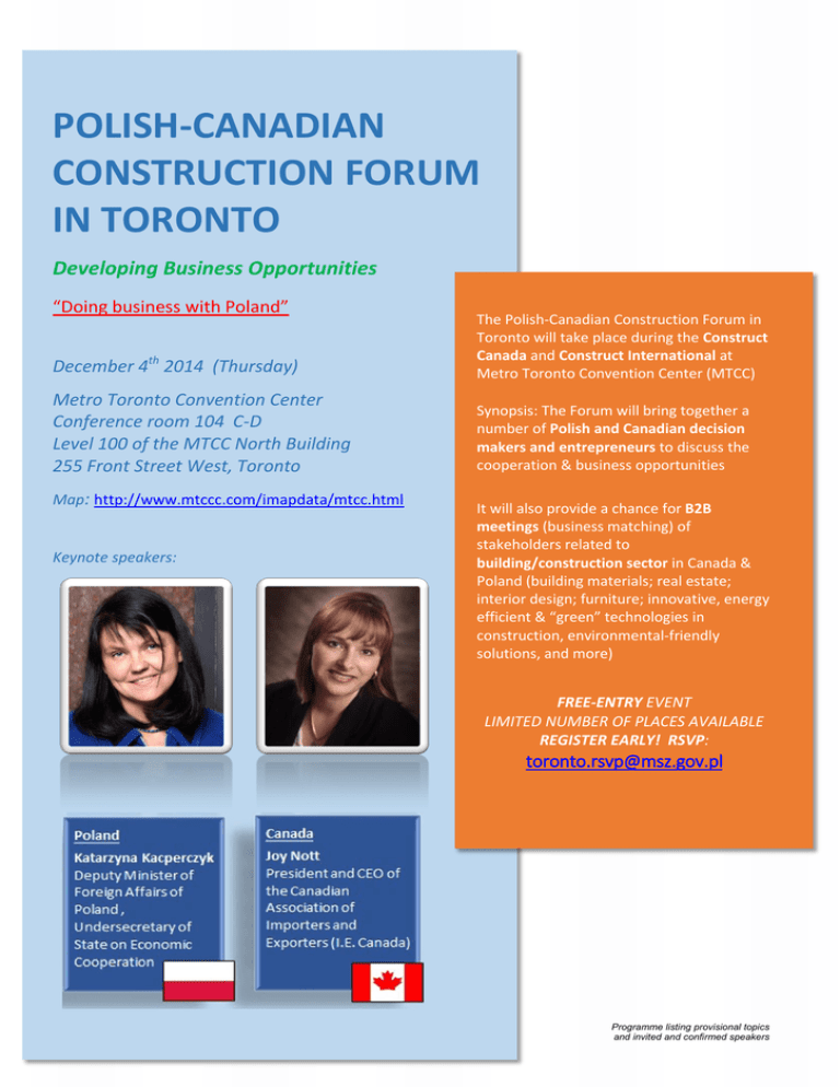 POLISH-CANADIAN CONSTRUCTION FORUM IN TORONTO Developing Business Opportunities “Doing business with Poland” December 4th 2014 (Thursday) The Polish-Canadian Construction Forum in Toronto will take place during the Construct Canada and Construct International at Metro Toronto Convention Center (MTCC) Metro Toronto Convention Center Conference room 104 C-D Level 100 of the MTCC North Building 255 Front Street West, Toronto Synopsis: The Forum will bring together a number of Polish and Canadian decision makers and entrepreneurs to discuss the cooperation & business opportunities Map: http://www.mtccc.com/imapdata/mtcc.html Keynote speakers: It will also provide a chance for B2B meetings (business matching) of stakeholders related to building/construction sector in Canada & Poland (building materials; real estate; interior design; furniture; innovative, energy efficient & “green” technologies in construction, environmental-friendly solutions, and more) FREE-ENTRY EVENT LIMITED NUMBER OF PLACES AVAILABLE REGISTER EARLY! RSVP: [email protected] Programme listing provisional topics and invited and confirmed speakers Program 08:20 Registration 09:00 Welcome Wojciech Śniegowski, Canada-Poland Chamber of Commerce of Toronto (Chair) 09:05 Keynote address (Poland) Katarzyna Kacperczyk, Deputy Minister of Foreign Affairs of Poland 09:20 Keynote address (Canada) Joy Nott, President and CEO, Canadian Association of Importers and Exporters 09:35 Potential of construction market in Ontario and Canada Tad Putyra, Chairman & Richard Lyall, President, Residential Construction Council of Ontario (RESCON) 09:45 Construction sector & CETA (Canada - EU free trade agreement) – what to expect Amela Trhulj, Trade Counsellor, EU Delegation to Canada 10:00 “Doing business with Poland” – presentations of Polish construction companies With a few words of introduction from Nicolas Lepage, Senior Trade Commissioner, Embassy of Canada in Poland 10:15 Coffee break Programme listing provisional topics and invited and confirmed speakers 10:30 Canadian Real Estate marketplace trends Sheila Botting, National Leader – Real Estate, Deloitte 10:50 Investment climate in Poland: focus on real estate Polish Information and Foreign Investment Agency 11:10 European Construction Outlook: Focus on the Trends and Opportunities in Poland Konrad Plochocki, General Director, Polish Association of Developers 11:30 Development of innovative, energy efficient & environmentally-friendly technologies in construction sector GreenEvo – the Green Technology Accelerator (Polish green technologies in construction) 11:45 Chair's summing up and conclusions Wojciech Śniegowski, Canada-Poland Chamber of Commerce of Toronto 12:00 Business networking – Part I Polish trade mission delegates and local stakeholders 12:45 Buffet lunch (for registered participants) 14:00 Business networking – Part II (Pre-arranged B2B meetings) Polish trade mission delegates and local stakeholders 17:00 End of B2B sessions POLISH-CANADIAN CONSTRUCTION FORUM IN TORONTO Organised by Supported by Programme listing provisional topics and invited and confirmed speakers