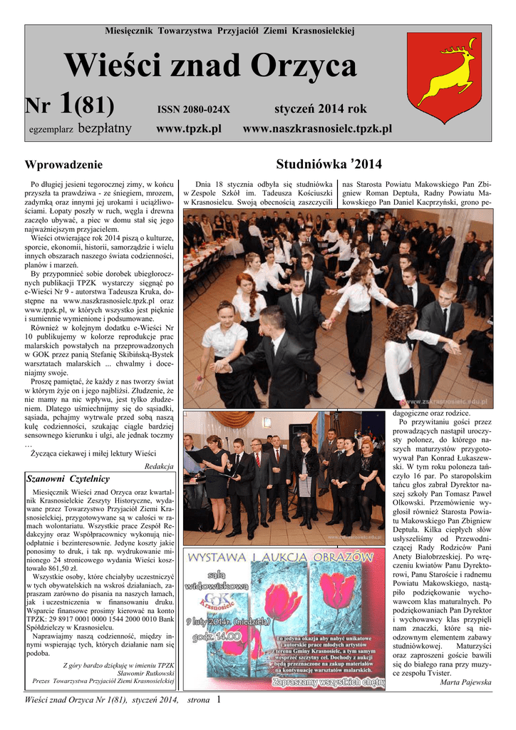 Miesięcznik Towarzystwa Przyjaciół Ziemi Krasnosielckiej Wieści znad Orzyca Nr 1(81) egzemplarz bezpłatny ISSN 2080-024X www.tpzk.pl styczeń 2014 rok www.naszkrasnosielc.tpzk.pl Studniówka ’2014 Wprowadzenie Po długiej jesieni tegorocznej zimy, w końcu przyszła ta prawdziwa - ze śniegiem, mrozem, zadymką oraz innymi jej urokami i uciążliwościami. Łopaty poszły w ruch, węgla i drewna zaczęło ubywać, a piec w domu stał się jego najważniejszym przyjacielem. Wieści otwierające rok 2014 piszą o kulturze, sporcie, ekonomii, historii, samorządzie i wielu innych obszarach naszego świata codzienności, planów i marzeń. By przypomnieć sobie dorobek ubiegłorocznych publikacji TPZK wystarczy sięgnąć po e-Wieści Nr 9 - autorstwa Tadeusza Kruka, dostępne na www.naszkrasnosielc.tpzk.pl oraz www.tpzk.pl, w których wszystko jest pięknie i sumiennie wymienione i podsumowane. Również w kolejnym dodatku e-Wieści Nr 10 publikujemy w kolorze reprodukcje prac malarskich powstałych na przeprowadzonych w GOK przez panią Stefanię Skibińską-Bystek warsztatach malarskich ... chwalmy i doceniajmy swoje. Proszę pamiętać, że każdy z nas tworzy świat w którym żyje on i jego najbliżsi. Złudzenie, że nie mamy na nic wpływu, jest tylko złudzeniem. Dlatego uśmiechnijmy się do sąsiadki, sąsiada, pchajmy wytrwale przed sobą naszą kulę codzienności, szukając ciągle bardziej sensownego kierunku i ulgi, ale jednak toczmy … Życząca ciekawej i miłej lektury Wieści Dnia 18 stycznia odbyła się studniówka w Zespole Szkół im. Tadeusza Kościuszki w Krasnosielcu. Swoją obecnością zaszczycili Redakcja Szanowni Czytelnicy Miesięcznik Wieści znad Orzyca oraz kwartalnik Krasnosielckie Zeszyty Historyczne, wydawane przez Towarzystwo Przyjaciół Ziemi Krasnosielckiej, przygotowywane są w całości w ramach wolontariatu. Wszystkie prace Zespół Redakcyjny oraz Współpracownicy wykonują nieodpłatnie i bezinteresownie. Jedyne koszty jakie ponosimy to druk, i tak np. wydrukowanie minionego 24 stronicowego wydania Wieści kosztowało 861,50 zł. Wszystkie osoby, które chciałyby uczestniczyć w tych obywatelskich na wskroś działaniach, zapraszam zarówno do pisania na naszych łamach, jak i uczestniczenia w finansowaniu druku. Wsparcie finansowe prosimy kierować na konto TPZK: 29 8917 0001 0000 1544 2000 0010 Bank Spółdzielczy w Krasnosielcu. Naprawiajmy naszą codzienność, między innymi wspierając tych, których działanie nam się podoba. Z góry bardzo dziękuję w imieniu TPZK Sławomir Rutkowski Prezes Towarzystwa Przyjaciół Ziemi Krasnosielckiej Wieści znad Orzyca Nr 1(81), styczeń 2014, strona 1 nas Starosta Powiatu Makowskiego Pan Zbigniew Roman Deptuła, Radny Powiatu Makowskiego Pan Daniel Kacprzyński, grono pe- dagogiczne oraz rodzice. Po przywitaniu gości przez prowadzących nastąpił uroczysty polonez, do którego naszych maturzystów przygotowywał Pan Konrad Łukaszewski. W tym roku poloneza tańczyło 16 par. Po staropolskim tańcu głos zabrał Dyrektor naszej szkoły Pan Tomasz Paweł Olkowski. Przemówienie wygłosił również Starosta Powiatu Makowskiego Pan Zbigniew Deptuła. Kilka ciepłych słów usłyszeliśmy od Przewodniczącej Rady Rodziców Pani Anety Białobrzeskiej. Po wręczeniu kwiatów Panu Dyrektorowi, Panu Staroście i radnemu Powiatu Makowskiego, nastąpiło podziękowanie wychowawcom klas maturalnych. Po podziękowaniach Pan Dyrektor i wychowawcy klas przypięli nam znaczki, które są nieodzownym elementem zabawy studniówkowej. Maturzyści oraz zaproszeni goście bawili się do białego rana przy muzyce zespołu Tvister. Marta Pajewska Świątecznie z Caritasem Zbliżają się święta Bożego Narodzenia. Dopinamy wszystko w każdym szczególe, każdym drobiazgu, by było w święta z rodziną syto, pięknie w domu i przyjemnie. A członkowie ze Szkolnego Koła Caritas i Parafialnego Zespołu Caritas w Drążdżewie również pracują, myślą i idą do dzieci w parafii, żyjących skromniej materialnie, pokrzywdzonych przez los, starszych, samotnych, na wózkach inwalidzkich, do tych, którzy nie wychodzą z domu, bo są chorzy. Idą, by dać choć trochę radości i nadziei. I tak 21 grudnia 2013 r. pojechaliśmy z Łukaszem i paczkami od św. Mikołaja do młodszych i starszych dzieci. Jest radość w domach z naszej obecności, ale i łza się kręci w oku, bo nie ma tej najważniejszej, która stworzy klimat ciepłych i miłych Świąt, gdyż zabrakło jej „mojej Mamy”. Tu jesteśmy bardzo poruszeni, ponieważ odczuwamy to samo. Jak tu życzyć radosnych Świąt? Jeszcze jest ktoś, kto może nie czekał na nasze odwiedziny. Pytano mamę, czy będą prezenty pod choinkę? Słyszę odpowiedź - w tym roku nie, bo trzeba rachunki opłacić i na jedzenie musi wystarczyć. A więc święta bez radości, tej ziemskiej i tradycyjnej. Wyjdźmy z własnego „Ja” i zauważymy, że może ktoś czeka na nas i na naszą pomoc. Z tej wędrówki wróciliśmy pokorniejsi. Róg Baśniowej i Wschodniej Powitanie Nowego Roku „pod chmurką” weszło już chyba na stałe do kalendarza imprez mieszkańców części Krasnosielca i Nowego Sielca. Bez zaproszeń, skrzykiwań czy sołtyskich kartek, kilkanaście minut przed dwunastą około trzydzieści osób przyszło na róg Baśniowej i Wschodniej, by wspólnie z sąsiadami wychylić lamkę szampana, złożyć noworoczne życzenia i obejrzeć sylwestrowe fajerwerki. Na koniec zrobiliśmy sobie pamiątkowe zdjęcia, które tradycyjnie musicie zobaczyć na łamach „Wieści”. Jeżeli macie ochotę być na takiej fotografii, przyjdźcie koniecznie 31 grudnia 2014 roku na nasz róg. Obiecuję, że będziemy na Was czekać! Tomasz Bielawski 5 stycznia 2014 r. odbyło się spotkanie opłatkowe PZC i SKC z miejscowymi kapłanami, ks. dyrektorem z Caritas Łomża i rodziną państwa Krawczyków, którzy towarzyszą nam od lat w różnych spotkaniach. Cieszym