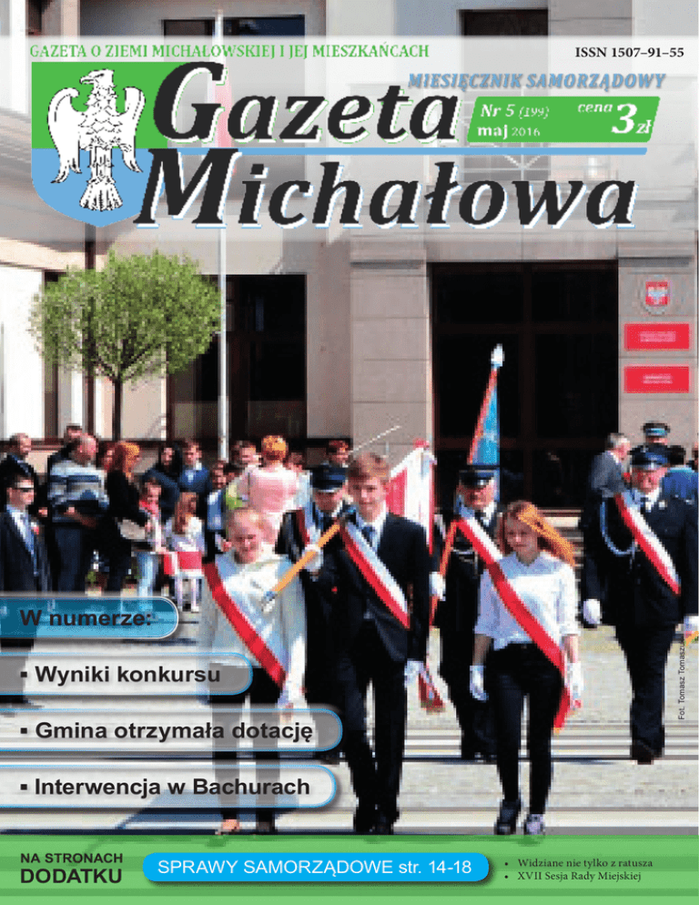 ISSN 1507–91–55 Fot. Tomasz Tomaszuk W numerze: ▪ Wyniki konkursu ▪ Gmina otrzymała dotację ▪ Interwencja w Bachurach NA STRONACH DODATKU SPRAWY SAMORZĄDOWE str. 14-18 • Widziane nie tylko z ratusza • XVII Sesja Rady Miejskiej nstytucji 3 Maja o K a i n 225. Rocznica Uchwale Autor fotoreportażu: Tomasz Tomaszuk, Adam Rusiłowicz, Dawid Konończuk, Piotr Rusiłowicz O L U D Z I A C H Witam serdecznie wszystkich czytelników Gazety Michałowa w te słoneczne, przeplatane wiosennym deszczem majowe dni. Muszę się Państwu przyznać, że co miesiąc mam ten sam problem przy składzie Gazety – zawsze muszę wszystko ściskać i upychać. Kilka tekstów ze względu na swoją objętość nie mogło ukazać się w tym miesiącu. Wszystkie zostaną opublikowane w czerwcowym numerze. Autorom nadesłanych tekstów serdecznie dziękuję za wsparcie i zaangażowanie. Nie mniej jednak zachęcam wszystkich do współpracy i nadsyłania wszelkiego rodzaju materiałów prasowych opatrzonych imieniem i nazwiskiem autora. W tym miesiącu polecam Państwu szczególnie tekst o zaniedbanej drodze w Bachurach. Jest to dla mnie bardzo istotny materiał, który zrealizowałam na prośbę mieszkańców wsi. Mam nadzieję, że przyniesie on oczekiwane efekty. Oprócz informacji z działu aktualności zachęcam Państwa do zapoznania się z publicystyką i pozostałymi tekstami. Już za miesiąc na prośbę czytelników opublikuję informacje na temat przeprowadzonego w Urzędzie audytu, dowiecie się Państwo czy pociąg do Sokola i Żedni powróci na tory oraz jak wygląda poród domowy. Z życzeniami przyjemnej lektury, Joanna Dąbrowska D L A L U D Z I Ławeczka pierwsza W Nałęczowie na wzniesieniu siedzi pisarz w głębokim zamyśleniu Jego myśli i Jego dzieła mym rodakom arcydzieła My je czytamy i o nich myślimy i nieraz na ławeczce z Nim posiedzimy Wielki Pisarzu i Dobrotliwy Człowieku dzieła Twe będą czytane do niekończącego się wieku Siedzi Pisarz przez 24 godziny O! To są kpiny Nie drodzy rodacy tak siedzą Wielcy Polacy Ławeczka druga I w Łomży stoi ławeczka a na niej siedzi Pani Haneczka Czym ona zasłużyła? Monologami publiczność bawiła Wszyscy chętnie Pani Hanki słuchali i jej kunszt aktorski podziwiali Dziś Pani Hanka siedzi spokojnie i nad wyraz dostojnie Drodzy rodacy tak siedzą Wielcy Polacy 4-9 Felieton 10 Publicystyka 11 Edukacja 12 Aktualności 13 Ciężka droga po wiarę Mikołaj Hajduk jako uczeń Liceum Ogólnokształcącego w Michałowie Z życia Gminnego Zespołu Szkół w Michałowie Wkładka urzędowa 14-18 19 Wywiad 20 Aktualności 21 Publicystyka 22 Uwaga konkurs! Aktualności Podaj imię i nazwisko wielkich rodaków siedzących na trzech tytułowych ławeczkach. Tel. 513 561 875 Nagroda: płyta z muzyką ludową. W szczególności wyrazy wdzięczności kierujemy do Kapelanów Straży Pożarnej ks. ihum Sergiusza (Matwiejczuka), ks. Piotra Borowika, duchownych z Michałowa i Topolan, kolegów strażaków z KM PSP w Białymstoku, pracowników szkoły, rodziny, przyjaciół, sąsiadów i znajomych. Pogrążony w smutku syn Jan Wieremiejuk z rodziną 2016 Aktualności 3 Publicystyka Śp. Włodzimierza Wieremiejuka Gazeta Michałowa maj Od redaktora Ławeczka trzecia I w Międzyzdrojach ławeczkę postawili Pana Gustawa na nią zaprosili Siedzi Mistrz nad Mistrzami w alei z odciśniętymi dłoniami Dłonie mówią same za siebie bo to są dłonie Mistrzów podobnych do Ciebie Wielbiciele Twój talent podziwiają i za to Cię kochają Drodzy rodacy tak siedzą Wielcy Polacy Elon „Nie żyjemy, aby umierać, ale umieramy, aby żyć wiecznie” Dziękujemy z całego serca wszystkim, którzy w tak bolesnych dla nas chwilach dzielili z nami smutek i żal, okazali wiele serca, duchowego wsparcia, współczucia i życzliwości towarzysząc w ostatniej drodze naszego ojca 3 Spis treści Skarby michałowskie Rozmowa z Mariuszem Chrużym Pięć lat MOSiR-u w Michałowie W Bołtrykach przy pomniku 23-25 Felieton 26 Listy od czytelników 27 Sport 28 Humor 29 Ogłoszenia 30 Prawdy, półprawdy... Różne lica trolli Kącik życzeń AKTUALNOŚCI Gmina otrzymała dotację na termomodernizację szkoły W iele osób z niecierpliwością czekało na efekty złożonego wniosku dotyczącego dofinansowania ze środków Regionalnego Programu Operacyjnego Województwa Podlaskiego zadania inwestycyjnego „Głęboka termomodernizacja kompleksu Gminnego Zespołu Szkół w Michałowie”. Już dziś wiadomo, że wniosek został zaakceptowany, a Gmina Michałowo otrzyma blisko 3 miliony złotych. Projekt termomodernizacyjny zakłada przystosowanie budynku szkoły do warunków, które przełożą się na pomniejszenie kosztów jego utrzymania oraz komfort nauczy- Rozwiązanie konkursu Dziękujemy za wszystkie wiersze nadesłane na konkurs Gazety Michałowa o wiośnie. Po długich naradach postanowiliśmy nagrodzić dwie osoby: Michała Ostrowieckiego (lat 7) za wiersz „Wiosna” oraz Pana Mieczysława Kosteckiego za wiersz „Michałowo wiosną”. Zwycięzcom gratulujemy i zapraszamy po odbiór nagród do GOK w Michałowie. li i przede wszystkim uczniów. Mimo iż szkoła była wybudowana stosunkowo niedawno, to ślady jej użytkowania są znaczne, a wszelkiego rodzaju wady wymagają naprawy. W ramach projektu w budynku szkoły zostanie wymienione pokrycie dachowe, drzwi oraz okna. Ściany zostaną ocieplone, a posadzki wyremontowane. Co istotne, założona zostanie również wentylacja, a panele fotowoltaiczne wpłyną na zmniejszenie kosztów utrzymania. - W tej chwili czekamy jeszcze na wydanie pozwolenia na budowę oraz podpisanie umowy na dofinansowanie prac z Urzędem Marszałkowskim. Jak je uzyskamy, przejdziemy do ogłoszenia przetargu na realizację tego przedsięwzięcia. Niewykluczone, że prace rozpoczną się jeszcze w tym roku – wyjaśnia Burmistrz Konończuk. W konkursie wystartowało 59 podmiotów, z czego dotację przyznano zaledwie jednej trzeci