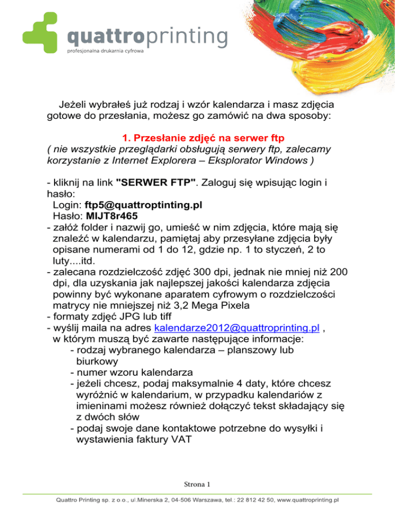 JeĪeli wybraáeĞ juĪ rodzaj i wzór kalendarza i masz zdjĊcia gotowe do przesáania, moĪesz go zamówiü na dwa sposoby: 1. Przesáanie zdjĊü na serwer ftp ( nie wszystkie przeglądarki obsáugują serwery ftp, zalecamy korzystanie z Internet Explorera – Eksplorator Windows ) - kliknij na link "SERWER FTP". Zaloguj siĊ wpisując login i hasáo: Login: [email protected] Hasáo: MIJT8r465 - zaáóĪ folder i nazwij go, umieĞü w nim zdjĊcia, które mają siĊ znaleĨü w kalendarzu, pamiĊtaj aby przesyáane zdjĊcia byáy opisane numerami od 1 do 12, gdzie np. 1 to styczeĔ, 2 to luty....itd. - zalecana rozdzielczoĞü zdjĊü 300 dpi, jednak nie mniej niĪ 200 dpi, dla uzyskania jak najlepszej jakoĞci kalendarza zdjĊcia powinny byü wykonane aparatem cyfrowym o rozdzielczoĞci matrycy nie mniejszej niĪ 3,2 Mega Pixela - formaty zdjĊü JPG lub tiff - wyĞlij maila na adres [email protected] , w którym muszą byü zawarte nastĊpujące informacje: - rodzaj wybranego kalendarza – planszowy lub biurkowy - numer wzoru kalendarza - jeĪeli chcesz, podaj maksymalnie 4 daty, które chcesz wyróĪniü w kalendarium, w przypadku kalendariów z imieninami moĪesz równieĪ doáączyü tekst skáadający siĊ z dwóch sáów - podaj swoje dane kontaktowe potrzebne do wysyáki i wystawienia faktury VAT Strona 1 - koniecznie napisz jaki sposób wysyáki/odbioru kalendarza wybierasz: - wysyáka firmą kurierską - 18,50 zá brutto - wysyáka firmą kurierską za pobraniem - 22,50 zá brutto - wysyáka pocztą - 10,00 zá brutto - odbiór wáasny - sposób páatnoĞci: - jeĪeli chcesz abyĞmy wysáali gotowy kalendarz firmą kurierską bez usáugi pobrania lub pocztą, dokonaj przedpáaty za wybrany kalendarz oraz koszty przesyáki na nasze konto: Quattro Printing sp. z o.o. 04-506 Warszawa ul.Minerska 2 Konto: 83 2490 0005 0000 4520 3279 8105 - jeĪeli chcesz odebraü kalendarz w siedzibie naszej drukarni, páatnoĞü gotówką przy odbiorze JeĞli pojawią siĊ jakiekolwiek wątpliwoĞci napisz do naszego konsultanta : [email protected] lub zadzwoĔ: tel.: 22 812 42 50 lub 668 292 767 (drukarnia Quattro Printing sp. z o.o. gwarantuje najwyĪszą jakoĞü wykonania kalendarza, jednoczeĞnie nie bierze odpowiedzialnoĞci za jakoĞü zdjĊü przesáanych przez Klientów ) Strona 2 2. Przesáanie zdjĊü mailem - kliknij na link „ E-MAIL” lub z programu pocztowego wyĞlij maila na adres [email protected] , w którym muszą byü zawarte nastĊpujące informacje: - rodzaj wybranego kalendarza – planszowy lub biurkowy - numer wzoru kalendarza - jeĪeli chcesz, podaj maksymalnie 4 daty, które chcesz wyróĪniü w kalendarium, w przypadku kalendariów z imieninami moĪesz równieĪ doáączyü tekst skáadający siĊ z dwóch sáów - podaj swoje dane kontaktowe potrzebne do wysyáki i wystawienia faktury VAT - jako zaáączniki przeĞlij zdjĊcia, które mają siĊ znaleĨü w kalendarzu, pamiĊtaj aby przesyáane zdjĊcia byáy opisane numerami od 1 do 12, gdzie np. 1 to styczeĔ, 2 to luty....itd. - zalecana rozdzielczoĞü zdjĊü 300 dpi, jednak nie mniej niĪ 200 dpi, dla uzyskania jak najlepszej jakoĞci kalendarza zdjĊcia powinny byü wykonane aparatem cyfrowym o rozdzielczoĞci matrycy nie mniejszej niĪ 3,2 Mega Pixela - formaty zdjĊü JPG lub tiff - koniecznie napisz jaki sposób wysyáki/odbioru kalendarza wybierasz: - wysyáka firmą kurierską - 18,50 zá brutto - wysyáka firmą kurierską za pobraniem - 22,50 zá brutto - wysyáka pocztą - 10,00 zá brutto - odbiór wáasny Strona 3 - sposób páatnoĞci: - jeĪeli chcesz abyĞmy wysáali gotowy kalendarz firmą kurierską bez usáugi pobrania lub pocztą, dokonaj przedpáaty za wybrany kalendarz oraz koszty przesyáki na nasze konto: Quattro Printing sp. z o.o. 04-506 Warszawa ul.Minerska 2 Konto: 83 2490 0005 0000 4520 3279 8105 - jeĪeli chcesz odebraü kalendarz w siedzibie naszej drukarni, páatnoĞü gotówką przy odbiorze JeĞli pojawią siĊ jakiekolwiek wątpliwoĞci napisz do naszego konsultanta : [email protected] lub zadzwoĔ: tel.: 22 812 42 50 lub 668 292 767 (drukarnia Quattro Printing sp. z o.o. gwarantuje najwyĪszą jakoĞü wykonania kalendarza, jednoczeĞnie nie bierze odpowiedzialnoĞci za jakoĞü zdjĊü przesáanych przez Klientów ) Strona 4