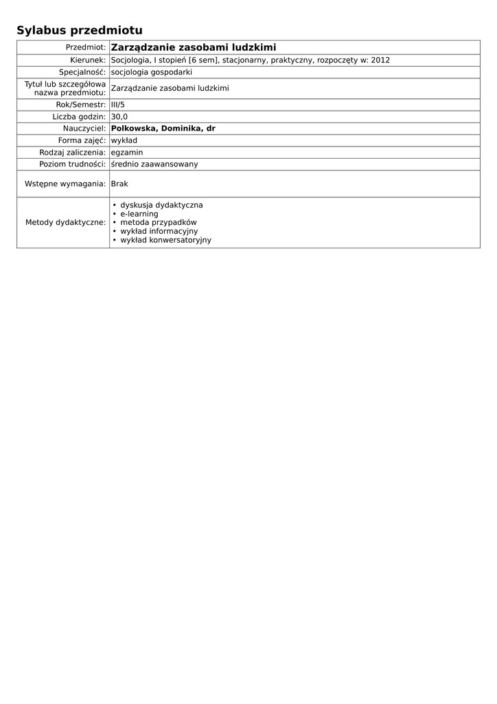 Sylabus przedmiotu Przedmiot: Zarządzanie zasobami ludzkimi Kierunek: Socjologia, I stopień [6 sem], stacjonarny, praktyczny, rozpoczęty w: 2012 Specjalność: socjologia gospodarki Tytuł lub szczegółowa Zarządzanie zasobami ludzkimi nazwa przedmiotu: Rok/Semestr: III/5 Liczba godzin: 30,0 Nauczyciel: Polkowska, Dominika, dr Forma zajęć: wykład Rodzaj zaliczenia: egzamin Poziom trudności: średnio zaawansowany Wstępne wymagania: Brak • • Metody dydaktyczne: • • • dyskusja dydaktyczna e-learning metoda przypadków wykład informacyjny wykład konwersatoryjny 1. Wykład wprowadzający I. Ewolucja funkcji personalnej 1. Istota funkcji personalnej 2. Modele funkcji personalnej 3. Teoria kapitału ludzkiego 2. Istota i rodzaje zarządzania zasobami ludzkimi I. Istota zarządzania zasobami ludzkimi 1. Istota i znaczenie pojęcia zasoby ludzkie organizacji 2. Co rozumie się przez zarządzanie zasobami ludzkimi? II. Rodzaje zarządzania zasobami ludzkimi 1. Modelowe ujęcia ZZL 2. Podejście twarde i miękkie w ZZL 3. Zastrzeżenia wobec koncepcji ZZL 4. Istota, zasady i modele polityki personalnej 5. Specyficzne podejścia w ZZL 3. Kapitał ludzki organizacji i uwarunkowania zarządzania zasobami ludzkimi I. Kapitał ludzki 1. Istota i pomiar kapitału intelektualnego organizacji 2. Indywidualny i zespołowy kapitał ludzki II. Uwarunkowania zarządzania zasobami ludzkimi 1. Wewnętrzne uwarunkowania ZZL 2. Zewnętrzne uwarunkowania ZZL 4. Analiza pracy i planowanie zatrudnienia 1. Istota i rodzaje analizy pracy 2. Proces analizy pracy 3. Opis stanowiska pracy i jego wykorzystanie 4. Istota planowania i rodzaje planów zasobów ludzkich 5. Metody planowania zatrudnienia i jego wykorzystanie 6. Budowa społecznego planu restrukturyzacji 5. Alokacja zasobów ludzkich organizacji I. Istota i determinanty alokacji zasobów ludzkich II. Pozyskiwanie pracowników 1. Rekrutacja 2. Selekcja 3. Adaptacja III. Alokacja pracowników wewnątrz organizacji IV. Odejścia pracowników (OUTPLACEMENT) 6. Ocenianie pracowników 1. Istota i rodzaje oceny pracowników 2. Projektowanie okresowych ocen pracowniczych 3. Wdrażanie ocen pracowniczych Forma oceniania: • egzamin pisemny Warunki zaliczenia: Uzyskanie co najmniej 60% pozytywnych odpowiedzi z egzaminu pisemnego. 1. Adamiec Marek, Kożusznik Barbara: Zarządzanie zasobami ludzkimi, Katowice: Wyd. Arkade 2000. 2. Armstrong Michael: Zarządzanie zasobami ludzkimi, Kraków: Oficyna Ekonomiczna 2002. 3. Bańka Włodzimierz: Zarządzanie personelem. Teoria i praktyka, Toruń: Wyd. A. Marszałek 2001. 4. Czubasiewicz Henryk, Zarządzanie zasobami ludzkimi, Warszawa: Wyd. Akademickie 2001. 5. Dubois Daniel, Rothwell William, Zarządzanie Zasobami Ludzkimi oparte na kompetencjach. Od tradycyjnego działu kadr do współczesnego HR , Kraków: Wyd. Helion 2008. 6. Król Henryk, Ludwiczyński Andrzej (red. naukowa), Zarządzanie Zasobami Ludzkimi. Tworzenie kapitału ludzkiego organizacji, Warszawa: PWN 2006. 7. Król Henryk, Ludwiczyński Andrzej (red. naukowa), Zarządzanie Zasobami Ludzkimi. Literatura: Tworzenie kapitału ludzkiego organizacji, Materiały do ćwiczeń , Warszawa: PWN 2006. 8. Lundy Olive, Cowling Alan: Strategiczne zarządzanie zasobami ludzkimi, Kraków: Wyd. Oficyna Ekonomiczna 2001. 9. McKenna Eugene, Beech Nic: Zarządzanie zasobami ludzkimi. Warszawa: Wyd. Gebethner i Ska 1997. 10. Najlepsze praktyki zarządzania zasobami ludzkimi , red. Pocztowski Aleksy, Kraków: Oficyna Ekonomiczna 2003. 11. Niedzielski Eugeniusz, Walkowiak Ryszard, Zarządzanie potencjałem społecznym w przedsiębiorstwie, Olsztyn: Wyd. UW-M 2000. 12. Zarządzanie kadrami, red. Listwan Tadeusz, Warszawa: Wydawnictwo C.H. Beck 2002. 13. Zarządzanie zasobami ludzkimi, red. nauk. Gomółka Zdzisław, Szczecin: Wyd. US 2005. Dodatkowe informacje: -