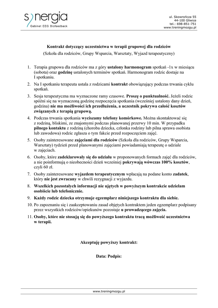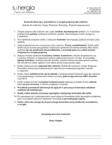 ul. Skowrończa 55 44-100 Gliwice tel.: 698-851-751 www:treningmozgu.pl Kontrakt dotyczący uczestnictwa w terapii grupowej dla rodziców (Szkoła dla rodziców, Grupy Wsparcia, Warsztaty, Wyjazd terapeutyczny) 1. Terapia grupowa dla rodziców ma z góry ustalony harmonogram spotkań -1x w miesiącu (sobota) oraz godzinę ustalonych terminów spotkań. Harmonogram rodzic dostaje na I spotkaniu. 2. Na I spotkaniu terapeuta ustala z rodzicami kontrakt obowiązujący podczas trwania cyklu spotkań. 3. Sesja terapeutyczna ma wyznaczone ramy czasowe. Proszę o punktualność. Jeżeli rodzic spóźni się na wyznaczoną godzinę rozpoczęcia spotkania (wcześniej ustalony dany dzień, godzina) nie ma możliwości ich przedłużenia, a uczestnik pokrywa całość kosztów związanych z terapią grupową. 4. Podczas trwania spotkania wyciszamy telefony komórkowe. Można skontaktować się z rodziną, bliskimi, ze znajomymi podczas planowanej przerwy 10 min. W przypadku pilnego kontaktu z rodziną (choroba dziecka, członka rodziny lub pilna sprawa osobista lub zawodowa) rodzic zgłasza o tym fakcie przed rozpoczęciem zajęć. 5. Osoby zainteresowane zajęciami dla rodziców (Szkoła dla rodziców, Grupy Wsparcia, Warsztaty) tydzień przed planowanymi zajęciami powiadamiają terapeutę o udziale w zajęciach. 6. Osoby, które zadeklarowały się do udziału w proponowanych formach zajęć dla rodziców, a nie poinformują o nieobecności dzień wcześniej pokrywają wówczas 100% kosztów, czyli 60 zł. 7. Osoby zainteresowane wyjazdem terapeutycznym wpłacają na podane konto zadatek, który nie jest zwracany w chwili rezygnacji z wyjazdu. 8. Wszelkich pozostałych informacji nie ujętych w powyższym kontrakcie udzielam osobiście lub telefonicznie. 9. Każdy rodzic dziecka otrzymuje egzemplarz niniejszego kontraktu dla siebie. 10. Po zapoznaniu się i zaakceptowaniu zasad objętych kontraktem jeden egzemplarz podpisany przez wszystkich rodziców/opiekunów pozostaje u prowadzącego zajęcia. 11. Osoby, które nie stosują się do powyższego kontraktu tracą możliwość uczestnictwa w terapii. Akceptuję powyższy kontrakt: Data: Podpis: www.treningmozgu.pl