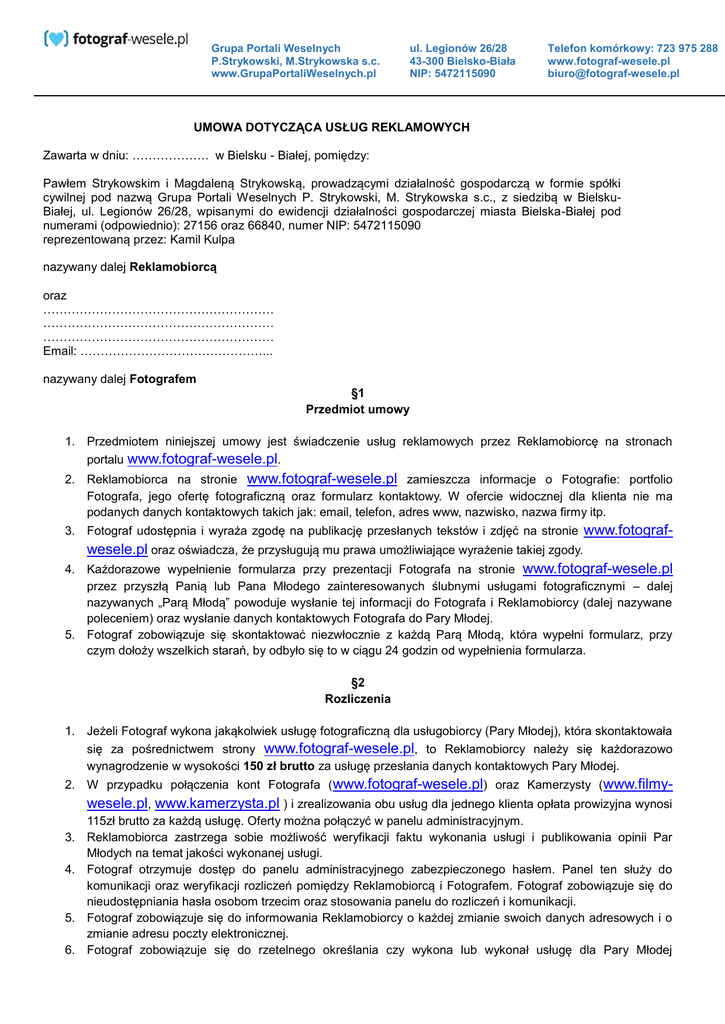 Grupa Portali Weselnych P.Strykowski, M.Strykowska s.c. www.GrupaPortaliWeselnych.pl ul. Legionów 26/28 43-300 Bielsko-Biała NIP: 5472115090 Telefon komórkowy: 723 975 288 www.fotograf-wesele.pl [email protected] UMOWA DOTYCZĄCA USŁUG REKLAMOWYCH Zawarta w dniu: ………………. w Bielsku - Białej, pomiędzy: Pawłem Strykowskim i Magdaleną Strykowską, prowadzącymi działalność gospodarczą w formie spółki cywilnej pod nazwą Grupa Portali Weselnych P. Strykowski, M. Strykowska s.c., z siedzibą w BielskuBiałej, ul. Legionów 26/28, wpisanymi do ewidencji działalności gospodarczej miasta Bielska-Białej pod numerami (odpowiednio): 27156 oraz 66840, numer NIP: 5472115090 reprezentowaną przez: Kamil Kulpa nazywany dalej Reklamobiorcą oraz ………………………………………………… ………………………………………………… ………………………………………………… Email: ………………………………………... nazywany dalej Fotografem §1 Przedmiot umowy 1. Przedmiotem niniejszej umowy jest świadczenie usług reklamowych przez Reklamobiorcę na stronach portalu www.fotograf-wesele.pl. 2. Reklamobiorca na stronie www.fotograf-wesele.pl zamieszcza informacje o Fotografie: portfolio Fotografa, jego ofertę fotograficzną oraz formularz kontaktowy. W ofercie widocznej dla klienta nie ma podanych danych kontaktowych takich jak: email, telefon, adres www, nazwisko, nazwa firmy itp. 3. Fotograf udostępnia i wyraża zgodę na publikację przesłanych tekstów i zdjęć na stronie www.fotograf- wesele.pl oraz oświadcza, że przysługują mu prawa umożliwiające wyrażenie takiej zgody. 4. Każdorazowe wypełnienie formularza przy prezentacji Fotografa na stronie www.fotograf-wesele.pl przez przyszłą Panią lub Pana Młodego zainteresowanych ślubnymi usługami fotograficznymi – dalej nazywanych „Parą Młodą” powoduje wysłanie tej informacji do Fotografa i Reklamobiorcy (dalej nazywane poleceniem) oraz wysłanie danych kontaktowych Fotografa do Pary Młodej. 5. Fotograf zobowiązuje się skontaktować niezwłocznie z każdą Parą Młodą, która wypełni formularz, przy czym dołoży wszelkich starań, by odbyło się to w ciągu 24 godzin od wypełnienia formularza. §2 Rozliczenia 1. Jeżeli Fotograf wykona jakąkolwiek usługę fotograficzną dla usługobiorcy (Pary Młodej), która skontaktowała się za pośrednictwem strony www.fotograf-wesele.pl, to Reklamobiorcy należy się każdorazowo wynagrodzenie w wysokości 150 zł brutto za usługę przesłania danych kontaktowych Pary Młodej. 2. W przypadku połączenia kont Fotografa ( www.fotograf-wesele.pl) oraz Kamerzysty (www.filmy- wesele.pl, www.kamerzysta.pl ) i zrealizowania obu usług dla jednego klienta opłata prowizyjna wynosi 115zł brutto za każdą usługę. Oferty można połączyć w panelu administracyjnym. 3. Reklamobiorca zastrzega sobie możliwość weryfikacji faktu wykonania usługi i publikowania opinii Par Młodych na temat jakości wykonanej usługi. 4. Fotograf otrzymuje dostęp do panelu administracyjnego zabezpieczonego hasłem. Panel ten służy do komunikacji oraz weryfikacji rozliczeń pomiędzy Reklamobiorcą i Fotografem. Fotograf zobowiązuje się do nieudostępniania hasła osobom trzecim oraz stosowania panelu do rozliczeń i komunikacji. 5. Fotograf zobowiązuje się do informowania Reklamobiorcy o każdej zmianie swoich danych adresowych i o zmianie adresu poczty elektronicznej. 6. Fotograf zobowiązuje się do rzetelnego określania czy wykona lub wykonał usługę dla Pary Młodej Grupa Portali Weselnych P.Strykowski, M.Strykowska s.c. www.GrupaPortaliWeselnych.pl ul. Legionów 26/28 43-300 Bielsko-Biała NIP: 5472115090 Telefon komórkowy: 723 975 288 www.fotograf-wesele.pl [email protected] najpóźniej w terminie do 7 dni od daty ślubu / wesela Pary Młodej. 7. W przypadku potwierdzenia wykonania usługi Fotograf otrzymuje fakturę w formie elektronicznej na podane elektroniczne konto pocztowe. 8. Fotograf zobowiązuje się do zapłaty faktury do 7 dni od dnia jej otrzymania / wystawienia. Płatność ta następuje przelewem na konto: Grupa Portali Weselnych P. Strykowski, M. Strykowska s.c. numer konta: 62 1240 1170 1111 0010 2951 9348. 9. W przypadku nieterminowego lub nierzetelnego potwierdzania wykonania usługi dla Pary Młodej przez Fotografa: Reklamobiorca ma prawo usunąć dane Fotografa ze strony www.fotograf-wesele.pl. 10. W przypadku nieterminowej płatności zgodnie z przesłaną fakturą, albo innego naruszenia umowy lub regulaminu: Reklamobiorca ma prawo usunąć dane Fotografa ze strony www.fotograf-wesele.pl. Reklamobiorca ma prawo do naliczenia odsetek, o których mowa w art. 359 § 21 Kodeksu cywilnego. Naliczenie kar umownych nie wyłącza dochodzenia odszkodowania na zasadach ogólnych. Reklamobiorca ma prawo zastosowania jednej lub kilku sankcji równocześnie, w tym sankcji przewidzianych regulaminem, o którym mowa w §3. §3 Regulamin 1. Reklamobiorca w panelu administracyjnym Fotografa udostępnia „Regulamin współpracy z serwisem www.fotograf-wesele.pl” 2. Fotograf potwierdza, że zapoznał się z „Regulaminem współpracy z serwisem www.fotograf-wesele.pl”. 3. Fotograf zobowiązuje się do przestrzegania regulaminu, który stanowi integralną cześć umowy. 4. Reklamobiorca zobowiązuję się do informowania Fotografa o każdej zmianie regulaminu w formie elektronicznej poprzez przesłanie informacji na podany przez Fotografa adres poczty elektronicznej. 5. Regulamin nie może zmieniać ustaleń niniejszej umowy. Regulamin określa zasady przesyłania informacji pomiędzy Fotografem a Reklamobiorcą, zasady ustalania kolejności fotografów w oparciu o system punktów, zasady użytkowania panelu dla Fotografa i inne. 6. Regulamin nie może zmieniać opłaty za zrealizowane polecenie. §4 Inne ustalenia 1. Wszelkie zmiany niniejszej umowy wymagają formy pisemnej pod rygorem ni