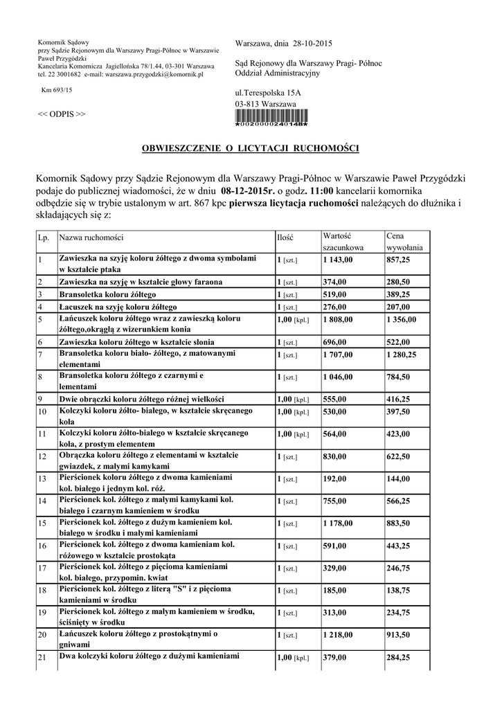 Komornik Sądowy przy Sądzie Rejonowym dla Warszawy Pragi-Północ w Warszawie Paweł Przygódzki Kancelaria Komornicza Jagiellońska 78/1.44, 03-301 Warszawa tel. 22 3001682 e-mail: [email protected] Km 693/15 << ODPIS >> Warszawa, dnia 28-10-2015 Sąd Rejonowy dla Warszawy Pragi- Północ Oddział Administracyjny ul.Terespolska 15A 03-813 Warszawa *0020000240148* OBWIESZCZENIE O LICYTACJI RUCHOMOŚCI Komornik Sądowy przy Sądzie Rejonowym dla Warszawy Pragi-Północ w Warszawie Paweł Przygódzki podaje do publicznej wiadomości, że w dniu 08-12-2015r. o godz. 11:00 kancelarii komornika odbędzie się w trybie ustalonym w art. 867 kpc pierwsza licytacja ruchomości należących do dłużnika i składających się z: 1 [szt.] Wartość szacunkowa 1 143,00 Cena wywołania 857,25 1 [szt.] 1 [szt.] 1 [szt.] 1,00 [kpl.] 374,00 519,00 276,00 1 808,00 280,50 389,25 207,00 1 356,00 1 [szt.] 1 [szt.] 696,00 1 707,00 522,00 1 280,25 1 [szt.] 1 046,00 784,50 1,00 [kpl.] 1,00 [kpl.] 555,00 530,00 416,25 397,50 1,00 [kpl.] 564,00 423,00 1 [szt.] 830,00 622,50 1 [szt.] 192,00 144,00 1 [szt.] 755,00 566,25 1 [szt.] 1 178,00 883,50 1 [szt.] 591,00 443,25 1 [szt.] 329,00 246,75 1 [szt.] 185,00 138,75 1 [szt.] 313,00 234,75 1 [szt.] 1 218,00 913,50 1,00 [kpl.] 379,00 284,25 Lp. Nazwa ruchomości Ilość 1 Zawieszka na szyję koloru żółtego z dwoma symbolami w kształcie ptaka Zawieszka na szyję w kształcie głowy faraona Bransoletka koloru żółtego Łacuszek na szyję koloru żółtego Łańcuszek koloru żółtego wraz z zawieszką koloru żółtego,okrągłą z wizerunkiem konia Zawieszka koloru żółtego w kształcie słonia Bransoletka koloru biało- żółtego, z matowanymi elementami Bransoletka koloru żółtego z czarnymi e lementami Dwie obrączki koloru żółtego różnej wielkości Kolczyki koloru żółto- białego, w kształcie skręcanego koła Kolczyki koloru żółto-białego w kształcie skręcanego koła, z prostym elementem Obrączka koloru żółtego z elementami w kształcie gwiazdek, z małymi kamykami Pierścionek koloru żółtego z dwoma kamieniami kol. białego i jednym kol. róż. Pierścionek kol. żółtego z małymi kamykami kol. białego i czarnym kamieniem w środku Pierścionek kol. żółtego z dużym kamieniem kol. białego w środku i małymi kamieniami Pierścionek kol. żółtego z dwoma kamieniam kol. różowego w kształcie prostokąta Pierścionek kol. żółtego z pięcioma kamieniami kol. białego, przypomin. kwiat Pierścionek kol. żółtego z literą "S" i z pięcioma kamieniami w środku Pierścionek kol. żółtego z małym kamieniem w środku, ściśnięty w środku Łańcuszek koloru żółtego z prostokątnymi o gniwami Dwa kolczyki koloru żółtego z dużymi kamieniami 2 3 4 5 6 7 8 9 10 11 12 13 14 15 16 17 18 19 20 21 22 23 24 w kolorze różowym Łańcuszek koloru żółtego z malutkich prostokątnych ogniw. Zawieszka koloru żółtego w kształcie małego kluczyka Kolczyk koloru żółtego, w kształcie oka z czarnym kamieniem w środku. 1 [szt.] 239,00 179,25 1 [szt.] 90,00 67,50 1 [szt.] 139,00 104,25 *) cena za sztukę Ruchomości można oglądać w dzień licytacji w miejscu i czasie oznaczonym wyżej. Suma wywołania wynosi 75% sumy oszacowania. Przystępujący do przetargu obowiązany jest złożyć rękojmię w wysokości jednej dziesiątej części sumy oszacowania. Rękojmię złożoną przez licytanta, któremu udzielono przybicia, zatrzymuje się; pozostałym licytantom rękojmię zwraca się niezwłocznie. Jeżeli nabywca nie wykonał w terminie warunków licytacji co do zapłaty ceny, traci rękojmię, a skutki przybicia wygasają. Z utraconej rękojmi pokrywa się koszty egzekucji związanej ze sprzedażą, a reszta wchodzi w skład sumy uzyskanej w egzekucji albo jeżeli egzekucja została umorzona jest przelewana na dochód Skarbu Państwa (art. 8671 kpc). W przetargu nie mogą uczestniczyć: dłużnik, komornik, ich małżonkowie, dzieci, rodzice i rodzeństwo, osoby obecne na licytacji w charakterze urzędowym oraz licytant, który nie wykonał warunków poprzedniej licytacji. Stawienie się jednego licytanta wystarcza do odbycia przetargu. Pełnomocnictwo do udziału w przetargu powinno być stwierdzone dokumentem z podpisem urzędowo poświadczonym, chyba że chodzi o pełnomocnictwo udzielone adwokatowi lub radcy prawnemu (art. 8672 kpc) UWAGA: Licytacja może się nie odbyć bez podania przyczyny. na zlecenie Komornika Sądowego Asesor Komorniczy Komornik Sądowy Łukasz Krystek Paweł Przygódzki