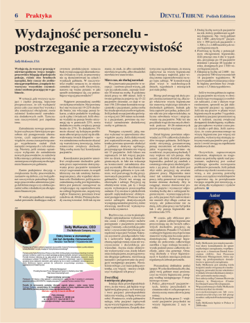 6 DENTAL TRIBUNE Praktyka Wydajność personelu postrzeganie a rzeczywistość Sally McKenzie, USA Wydaje się, że wszyscy pracują w niewiarygodnym wręcz tempie: pracownicy biegają od pokoju do pokoju, rośnie stos brudnych narzędzi, listy rzeczy do zrobienia są przepełnione, a napięcie towarzyszy wszystkim czynnościom i osobom pracującym w gabinecie. W sytuacji, gdy wszyscy są zajęci i ciężko pracują, logicznie przypuszczasz, że ich wydajność przez cały czas musi być wysoka i aby zmniejszyć obciążenie, może zaistnieć konieczność zatrudnienia dodatkowych osób. Tymczasem rzeczywistość jest zupełnie inna. Zatrudnienie nowego personelu jest szybszym i łatwiejszym sposobem niż postępowanie alternatywne, czyli usprawnianie obowiązków, ocena czasu poświęcanego wypełnianiu zadań i/lub narzędzi związanych z ich realizacją. Niestety, jeśli zmiany ograniczysz wyłącznie do zatrudnienia nowych pracowników, to zaledwie kilka miesięcy później niewiele się zmieni poza zwiększonym obciążeniem finansowym gabinetu. Zanim podejmiesz decyzję o zwiększeniu liczby pracowników, zastanów się dobrze, czy twój gabinet rzeczywiście potrzebuje kolejnego pracownika administracyjnego lub klinicznego i czy zdołasz poradzić sobie z dodatkowym obciążeniem finansowym. W wielu przypadkach mnogość zadań personelu skutkująca małym AD zwrotem produkcyjnym oznacza brak wystarczającego ukierunkowania i świadczy o tym, że pracownicy nie są skoncentrowani na celach i wynikach gabinetu. W rzeczywistości rzadko oznacza to, że musisz zatrudnić więcej osób. Oczywiście, nasuwa się ważne pytanie: w jaki sposób zorientujesz się, czy potrzebujesz więcej pracowników? Najpierw przeanalizuj zarobki swoich pracowników. Nie powinny być one wyższe niż 19-22% dochodu brutto, nie wliczając pensji lekarza, a także podatków wynikających z płac i świadczeń. Jeśli obecne wydatki na pensje brutto utrzymują się w granicach 22%, nowa dodatkowa osoba zwiększy pensje brutto do 27%. To dodatkowe 5% może okazać się kolejnym problemem albo też przyczynić się do zlikwidowania twoich kłopotów – nowo zatrudniona osoba może okazać się wartościową inwestycją, która ostatecznie zwiększy dochody. Taką osobą może być koordynator pacjentów. Koordynator pacjentów umożliwi zwiększenie dochodów gabinetu przez zapewnienie dotrzymywania przez pacjentów terminów wizyt i zagwarantowanie, że zespół kliniczny ma tak ustalony harmonogram pracy, aby wypełnić określone cele. Dodatkowo, jeśli tą nowo zatrudnioną osobą jest higienistka, która jest pomoże zareagować na zwiększające się zapotrzebowanie na zabiegi higieniczne, negatywny wpływ finansowy powinien trwać zaledwie ok. 60 dni. Później dochody zaczną wzrastać. Jeśli tak się nie stanie, to znak, że albo zatrudniłeś niewłaściwą osobę, albo obsadziłeś niewłaściwe stanowisko. Mierz czas, nie słuchaj narzekań Przyjmowanie pacjentów w recepcji – zarówno przed wizytą, jak i po jej zakończeniu, zajmuje średnio 10 minut na osobę. 8-godzinny dzień pracy to 480 minut. Jeśli w twoim gabinecie pojawia się 15-22 pacjentów dziennie, co daje w sumie 150-220 minut kontaktu recepcjonistki z pacjentami, jedna osoba bez trudu sprosta tym obowiązkom. Jeśli jednak recepcjonistka poświęca więcej niż 240 minut na kontakty z pacjentami, powinno się rozważyć zatrudnienie dodatkowej osoby w gabinecie. Następna czynność, jaką musisz wykonać to sprawdzenie obowiązków asysty. Jeśli efektywność jest zoptymalizowana, jedna asystentka powinna sprawnie obsłużyć 2 gabinety dentysty ogólnego, przyjmującego dziennie nie więcej niż 13 pacjentów. Jeśli lekarz ma zapisanych 14 lub więcej pacjentów na dzień, nie licząc badań higienicznych, to fakt ten wskazuje na konieczność zatrudnienia drugiej asystentki. Do określenia potrzeb twojego gabinetu w tym zakresie, weź pod uwagę liczbę przyjmowanych pacjentów, a nie liczbę gabinetów. Zwróć też uwagę na obowiązki i zabiegi. Przyjrzyj się obiektywnie temu, jak ty i twoja asysta wykonujecie poszczególne zadanie. Czy można w jakikolwiek sposób zoptymalizować efektywność postępowania? Podczas większości zabiegów dentystycznych występują naturalne przerwy, które stwarzają możliwość wykonywania wielu czynności. Ruch to czas, a czas to pieniądz. Dzięki optymalnemu wykorzystaniu czasu i efektywności ruchów pożegnanie z pacjentem powinno zająć 2 minuty, a dezynfekcja gabinetu i czyszczenie/sterylizacja narzędzi nie więcej niż 5 minut. Nakrycie asystorów, przełączników fotela i uchwytów lamp plastikową chustą zajmuje mniej czasu niż wyczyszczenie i dezynfekcja powierzchni. Asysta może efektywnie wykorzystać czas, kiedy lekarz znieczula pacjenta, na przygotowanie drugiego gabinetu, sterylizację narzędzi i przygotowanie na przyjęcie następnego pacjenta. Niezależnie od tego, czy masz jedną asystentkę, czy więcej - musisz zwiększyć wydajność ich pracy! Zweryfikuj 6-miesięczny plan pracy Istnieje duże prawdopodobieństwo, że nie wiesz, jak będzie wyglądał twój plan pracy za 6 miesięcy i twoi pacjenci prawdopodobnie także nie wiedzą, co będą wówczas robić. Pomimo to, wiele gabinetów nalega, żeby pacjenci zapisywali się na wizyty higieniczne z półrocznym wyprzedzeniem. Zespoły den- tystyczne są przekonane, że muszą zapisywać na wizyty higieniczne kilka miesięcy naprzód, gdyż widzą istotne zapotrzebowanie na tego typu zabiegi. W konsekwencji plan wizyt w nadchodzących dniach, tygodniach i miesiącach jest stale pełny. Biorąc pod uwagę tak duży popyt, można zastanawiać się, dlaczego właściwie wizyty higieniczne nie stanowią większego udziału w dochodach gabinetu. Jednak gdy lista zapisów jest pełna, jednocześnie nikt nie jest odpowiedzialny za liczne odwołania wizyt i niepojawianie się pacjentów. Nikt też nie przykł