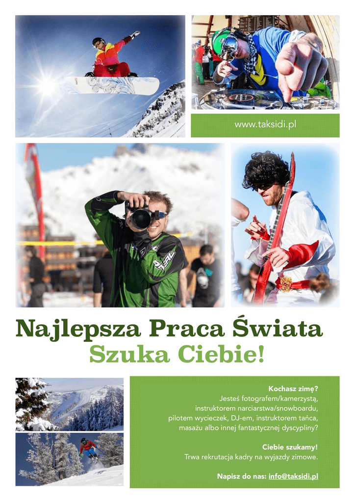 www.taksidi.pl Najlepsza Praca Świata Szuka Ciebie! Kochasz zimę? Jesteś fotografem/kamerzystą, instruktorem narciarstwa/snowboardu, pilotem wycieczek, DJ-em, instruktorem tańca, masażu albo innej fantastycznej dyscypliny? Ciebie szukamy! Trwa rekrutacja kadry na wyjazdy zimowe. Napisz do nas: [email protected]