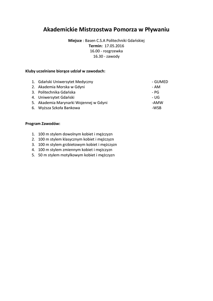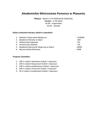 Akademickie Mistrzostwa Pomorza w Pływaniu Miejsce : Basen C.S.A Politechniki Gdańskiej Termin: 17.05.2016 16.00 - rozgrzewka 16.30 - zawody Kluby uczelniane biorące udział w zawodach: 1. 2. 3. 4. 5. 6. Gdański Uniwersytet Medyczny Akademia Morska w Gdyni Politechnika Gdańska Uniwersytet Gdański Akademia Marynarki Wojennej w Gdyni Wyższa Szkoła Bankowa Program Zawodów: 1. 2. 3. 4. 5. 100 m stylem dowolnym kobiet i mężczyzn 100 m stylem klasycznym kobiet i mężczyzn 100 m stylem grzbietowym kobiet i mężczyzn 100 m stylem zmiennym kobiet i mężczyzn 50 m stylem motylkowym kobiet i mężczyzn - GUMED - AM - PG - UG -AMW -WSB 100 m stylem dowolnym kobiet Miejsce 1 2 3 4 5 6 Nazwisko Pozorska Rybska Brunka Scholokova Burkowska Cichoma Imię Agata Agnieszka Zofia Yevhenia Ola Martyna Uczelnia WSB GUMED UG GUMED UG UG Czas 1:09,72 1:10,05 1:10,24 1:10,41 1:11,14 1:18,48 100 m stylem dowolnym mężczyzn Miejsce 1 2 3 4 5 6 7 8 9 10 11 12 13 15 Nazwisko Renusz Kukulski Pasieczny Kowlaski Reszetow Chrościelewski Brokowski Belucy Guz Karczewski Akman Domitrz Szram Sadoń Imię Piotr Karol Przemysław Szymon Łukasz Michał Piotr Radosław Jakub Maksymilian Jakub Piotr Krzysztof Grzegorz Uczelnia UG AMW GUMED PG PG PG PG PG UG GUMED GUMED GUMED GUMED GUMED Czas 0:53,50 0:55,87 0:56,32 0:57,77 1:00,11 1:02,28 1:02,48 1:02,86 1:03,18 1:07,45 1:08,11 1:09,30 1:14,25 1:16,63 100 m stylem klasycznym kobiet Miesjce 1 2 3 4 Nazwisko Stasiak Prządek Szczerbińska Piczajka Imię Aleksandra Paulina Martyna Agnieszka Uczelnia GUMED UG AMW GUMED Czas 1:26,91 1:31,41 1:32,04 1:57,66 100 m stylem klasycznym mężczyzn Miejsce 1 2 3 4 5 Nazwisko Renusz Szczepankiewicz Kryszczak Adamski Ordakowski Imię Piotr Mateusz Jędrzej Adrian Filip Uczlenia UG PG GUMED AMW PG Czas 1:10,23 1:12,59 1:17,91 1:19,08 1:22,95 100 m stylem grzbietowym kobiet Miejsce 1 2 3 4 Nazwisko Mańczak Szmit Pozorska Rybska Imię Agata Dominika Agata Agnieszka Uczelnia UG GUMED WSB GUMED Czas 1:16,39 1:16,73 1:18,59 1:24,45 100 m stylem grzbietowym mężczyzn Miejsce 1 2 3 Poza konkursem Nazwisko Szwaracki Kowalski Domitrz Suwara Imię Jędrzej Szymon Piotr Piotr Uczelnia PG PG GUMED PG Czas 1:09,24 1:11,50 1:29,92 1:12,30 100 m stylem zmiennym kobiet Miejsce 1 2 3 4 Nazwisko Mańczak Stasiak Scholokova Grubka Imię Agata Aleksandra Yevhenia Zofia Uczelnia UG GUMED GUMED UG Czas 1:21,60 1:21,75 1:23,18 1:23,24 100 m stylem zmiennym mężczyzn Miejsce 1 2 3 4 5 6 7 Nazwisko Szczepankiewicz Kornacki Pasieczny Adamski Panek Ordakowski Brokowski Imię Mateusz Robert Przemysław Adrian Mikołaj Filip Piotr Uczelnia PG PG GUMED AMW GUMED PG PG Czas 1:05,39 1:06,75 1:07,66 1:11,55 1:13,50 1:17,27 1:18,71 50 m stylem motylkowym kobiet Miejsce 1 2 3 4 5 6 Nazwisko Maciesza Jakóbczyk Rybska Szmit Wiśniewska Scholokova Imię Agata Hanna Agnieszka Dominika Karolina Yevhenia Uczelnia PG PG GUMED GUMED UG UG Czas 0:33,55 0:33,57 0:35,39 0:36,04 0:36,68 0:41,99 50 m stylem motylkowym mężczyzn Miejsce 1 2 3 4 5 6 7 8 9 10 Nazwisko Renusz Ślósarek Szołoch Wilczyński Kukulski Szczepankiewicz Słaby Szwaracki Knypczak Belucy Szram Sadoń Imię Piotr Filip Robert Mateusz Karol Mateusz Mikołaj Jędrzej Jędrzej Radosław Krzysztof Grzegorz Uczelnia UG PG PG AM AMW PG UG PG GUMED PG GUMED GUMED Czas 0:25,47 0:26,83 0:27,13 0:27,68 0:29,39 0:30,53 0:30,99 0:31,44 0:31,60 0:32,66 0:37,68 0:37,88
