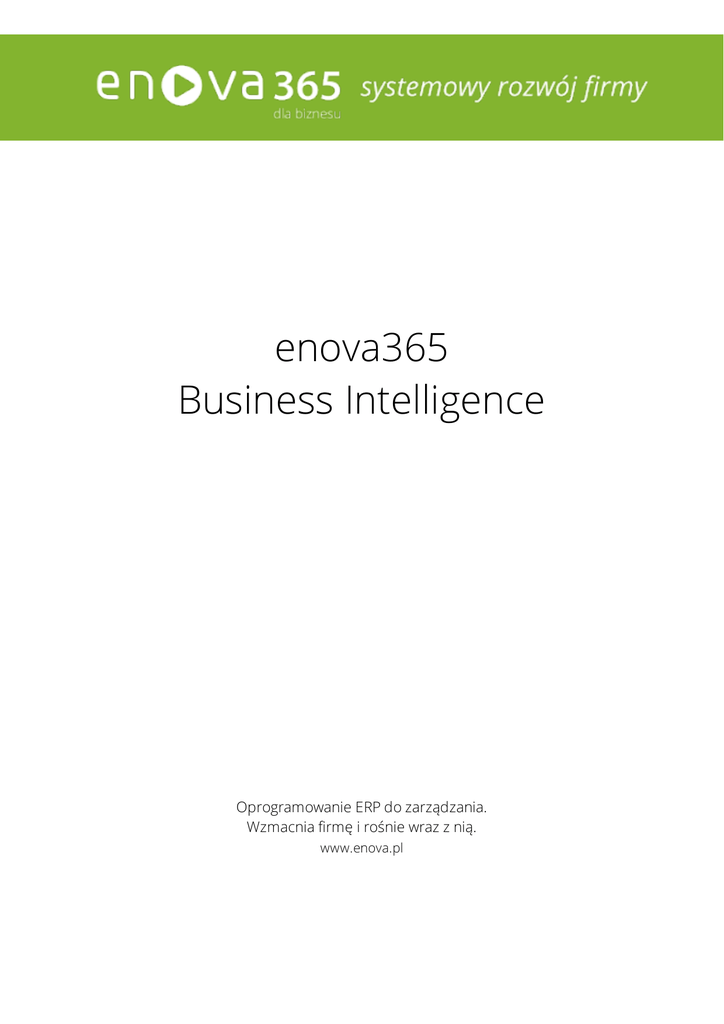 enova365 Business Intelligence Oprogramowanie ERP do zarządzania. Wzmacnia firmę i rośnie wraz z nią. www.enova.pl Spis treści Spis treści Business Intelligence (BI) Uruchamianie programu Okno główne programu Operatorzy i uprawnienia Słownik używanych terminów Nawigacja po systemie Skróty klawiaturowe Schemat modułu BI w enova365 Definicja domeny Dołączanie cech Definicja wskaźnika Definicja raportu Kopiowanie domen i wskaźników Przedziały czasu Definicja przedziałów czasu Zestawy przedziałów czasu Obszar Handel Obszar Kadrowo-Płacowy Obszar Finansowy Opis domen, raportów oraz wskaźników systemowych Obszar handlowy Domeny systemowe Wskaźniki systemowe Raporty systemowe Obszar kadry i płace Domeny systemowe Wskaźniki systemowe Obszar finansowy Domeny systemowe Wskaźniki systemowe Obszar CRM Domeny systemowe Wskaźniki systemowe Rozszerzanie domen systemowych Importowanie danych z innych baz danych Analiza kalendarza pracy Uruchamianie workerów Zasada działania Power BI Umiejscowienie wskaźników na liście Umiejscowienie wskaźników na formularzu Wizualizacja wskaźnika Wizualizacja raportu Dashboard formularza (panel BI obiektu) Filtry Zmiana wielkości wykresu/tabeli Zbiory danych systemu enova365 Technologia Zbiory danych Wykaz głównych modułów systemu Wykaz tabel składających się na poszczególne moduły Business Core CRM Deklaracje Ewidencja VAT Handel Zarządzanie zasobami ludzkimi Import Kadry Kalendarze Kasa i wyciągi bankowe Księgowość Magazyny Płace Środki trwałe Towary Waluty Windykacja 2 3 4 5 6 7 12 14 15 15 15 18 20 22 23 23 25 25 26 26 27 28 28 29 32 33 33 33 36 36 36 38 38 38 39 42 43 43 43 47 49 52 55 57 59 60 61 63 63 63 63 63 63 63 64 64 64 64 64 65 65 65 66 66 66 66 67 67 67 67 2/69 Business Intelligence (BI) Business Intelligence (BI) to nowy moduł enova365, odpowiedzialny za dostarczenie użytkownikom systemu wiedzy potrzebnej do skutecznego podejmowania decyzji w ramach realizowanych procesów biznesowych. Wiedza w postaci silnie zagregowanych wartości liczbowych, procentowych lub tekstowych – tzw. wskaźników, udostępniana jest w miejscach, w których operatorzy enova365 wykonują czynności w programie, czyli na listach, formularzach i kreatorach procesów workflow. Są to zarówno wskaźniki proste mierzące dynamikę sprzedaży, strukturę nieobecności pracowników, jak również bardziej złożone tj. pokrycie zobowiązań, średni czas regulowania należności czy stan nadgodzin wśród zatrudnionych pracowników w firmie. Każdy użytkownik programu posiadający uprawnienia może przygotować własny zestaw wskaźników tj. banner BI, który pomoże mu w podejmowaniu właściwych decyzji biznesowych. Moduł zawiera bogaty zestaw wbudowanych wskaźników oraz mechanizmy konfiguracyjne pozwalające rozbudować obszary analityczne o dodatkowe dane oraz własne wskaźniki. BI enova365 współpracuje z bazami danych na serwerze MS SQL. Silniki bazodanowe MySQL oraz Oracle w chwili obecnej nie są obsługiwane. 3/69 Uruchamianie programu Użytkownik uzyskuje dostęp do aplikacji poprzez przeglądarkę internetową. Do poprawnego działania aplikacji wymagana jest najnowsza wersja przeglądarki Internet Explorer lub Chrome. W przypadku usługi enova365.pl każdy klient posiada indywidualną bazę danych, do której uzyskuje dostęp poprzez wpisanie w przeglądarce adresu w postaci: https://nazwa_firmy.enova365.pl (gdzie nazwa_firmy jest indywidualną nazwą przydzieloną Klientowi). W przypadku instalacji enova365 na serwerze Klienta adres dostępu do aplikacji jest uzależniony od sposobu zainstalowania i skonfigurowania aplikacji. Instalację i konfigurację serwera enova365 należy powierzyć Autoryzowanemu Partnerowi Soneta. 4/69 Okno główne programu Po lewej stronie umieszczono okno Pasek nawigacji. Użytkownik może przełączać jego zawartość pomiędzy następującymi listami: Lista kartotek, Ostatnio używane, Ulubione lub Cechy. Lista kartotek odwzorowuje strukturę funkcjonalną programu, czyli pełny układ opcji menu. Po wybraniu elementu odpowiednia lista wyświetlana jest w głównej (prawej) części ekranu Ostatnio używane zawiera listę opcji ostatnio wybranych przez użytkownika. Ulubione zawiera listę skrótów do list i podmenu zdefiniowaną samodzielnie przez użytkownika. Można tam umieszczać skróty po przez zaznaczenie gwiazdki znajdującej się przy nazwie opcji w głównym oknie programu. Cechy zawiera wszystkie cechy grupujące zdefiniowane na danej liście, np cechy grupujące kartoteki towarowe wg producentów sprzętu sportowego. Okno główne programu 5/69 Operatorzy i uprawnienia Po wpisaniu adresu domeny w przeglądarkę internetową, należy się zalogować podając w polu użytkownik: Administrator oraz hasło ustalone i nadane przez Partnera. W systemie enova365 zawsze jest operator Administrator, a kody i uprawnienia innych użytkowników są nadawane przez osobę pełniącą rolę administratora. Program posiada rozbudowany mechanizm kontroli uprawnień użytkowników i rejestracji ich działań. Uprawnienia określane są poprzez przypisanie użytkownikowi odpowiednich ról. Każdy użytkownik może mieć przypisanych jednocześnie wiele ról, określających jego uprawnienia w różnych obszarach działania programu. System pozwala określić uprawnienia użytkownika zarówno do poszczególnych formularzy jak i do poszczególnych zbiorów danych (tabel). Oznacza to, że użytkownik np. który nie posiada uprawnień do danego magazynu, lub wzorca dokumentu nie będzie go widział, w żadnym z formularzy, gdzie taki obiekt może występować, nawet jeśli posiada dostęp do wszystkich formularzy w systemie. Wszelkie uprawnienia mogą być zastosowane indywidualnie dla danego użytkownika jako: pełny dostęp do danych wraz z możliwością modyfikacji, pełny dostęp do danych bez możliwości modyfikacji, brak dostępu do danych. Domyślnym użytkownikiem każdej 