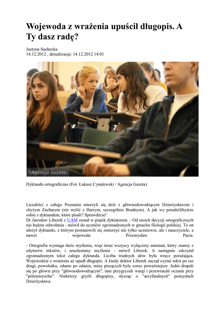Wojewoda z wrażenia upuścił długopis. A Ty dasz radę? Justyna Suchecka 14.12.2012 , aktualizacja: 14.12.2012 14:01 Dyktando ortograficzne (Fot. Łukasz Cynalewski / Agencja Gazeta) Licealiści z całego Poznania mierzyli się dziś z głównodowodzącym Dzierżysławem i chyżym Zacharym (nie mylić z Harrym, szczególnie Brudnym). A jak wy poradzilibyście sobie z dyktandem, które pisali? Sprawdźcie! Dr Jarosław Liberek z UAM został w piątek dyktatorem. - Od moich decyzji ortograficznych nie będzie odwołania - mówił do uczniów zgromadzonych w gmachu filologii polskiej. To on ułożył dyktando, z którym postanowili się zmierzyć nie tylko uczniowie, ale i nauczyciele, a nawet wojewoda Przemysław Pacia. - Ortografia wymaga dużo myślenia, więc teraz wszyscy wyłączmy automat, który znamy z edytorów tekstów, i uruchommy myślenie - mówił Liberek. A następnie odczytał zgromadzonym tekst całego dyktanda. Liczba trudnych słów była wręcz porażająca. Wojewodzie z wrażenia aż upadł długopis. A kiedy doktor Liberek zaczął czytać tekst po raz drugi, powolutku, zdanie po zdaniu, miny piszących były coraz poważniejsze. Jedni drapali się po głowie przy "głównodowodzącym", inni przygryzali wargi i przewracali oczami przy "półzmierzchu". Niektórzy gryźli długopisy, słysząc o "arcyfatalnych" pomysłach Dzierżysława. - Najwięcej trudności sprawiło mi słowo "rozgorzała". Najpierw napisałam je z błędem, ale na szczęście poprawiłam - mówiła Marita z VIII LO. - Wątpliwości miałam też przy "porsche", nie wiedziałam czy właściwa jest mała, czy duża litera. - Ja najbardziej martwiłam się słowami pisanymi przez myślnik, bo zawsze sprawiają mi najwięcej trudności - przyznawała Alina Chojnacka, dyrektorka I LO. To właśnie "Marcinek" razem z UAM zaprosił licealistów do ortograficznych zmagań. - Dyktando pisane 30 lat po ukończeniu szkoły to trudna sprawa, ale musiałem spróbować, w końcu jestem absolwentem "Marcinka" - mówił Pacia. A doktor Liberek pocieszał wszystkich, którym zrzedły miny: - To było trudne dyktando. Tylko dzięki takim można się czegoś nauczyć tłumaczył. Sprawdźcie się! Fot. Łukasz Cynalewski / Agencja Gazeta Fot. Łukasz Cynalewski / Agencja Gazeta Cały tekst: http://poznan.gazeta.pl/poznan/51,36037,13051607.html?i=10#ixzz2FIAh0bxg