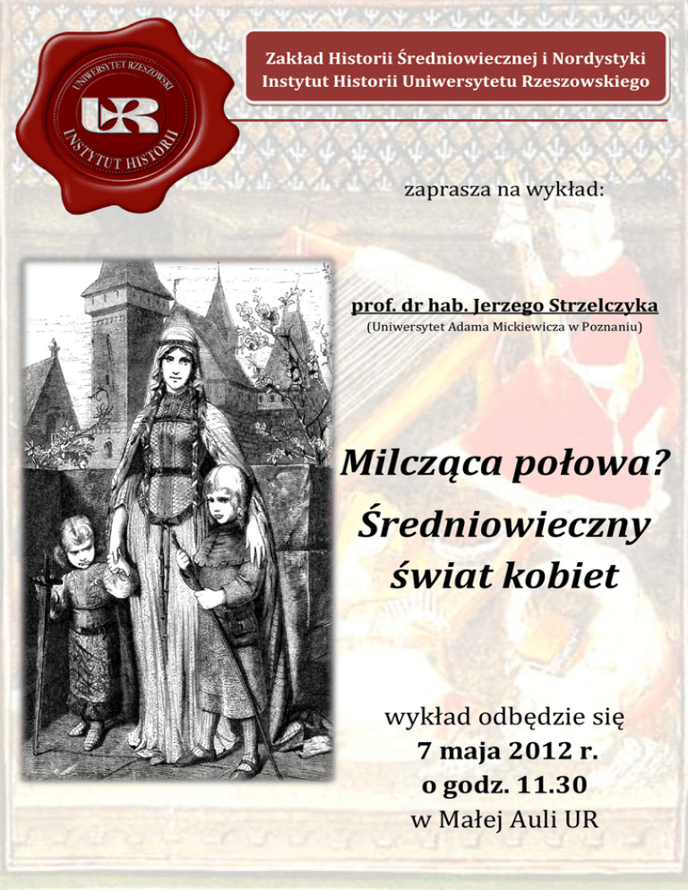 Zakład Historii Średniowiecznej i Nordystyki Instytut Historii Uniwersytetu Rzeszowskiego zaprasza na wykład: prof. dr hab. Jerzego Strzelczyka (Uniwersytet Adama Mickiewicza w Poznaniu) Milcząca połowa? Średniowieczny świat kobiet wykład odbędzie się 7 maja 2012 r. o godz. 11.30 w Małej Auli UR