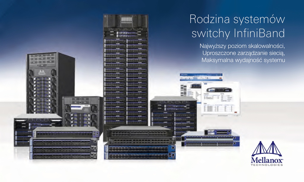 Rodzina systemów switchy InfiniBand Najwyższy poziom skalowalności, Uproszczone zarządzanie siecią, Maksymalna wydajność systemu Mellanox Systemy Switchy InfiniBand – najbardziej wydajne rozwiązanie połączenia Web 2.0, Big Data, przetwarzania w chmurze i EDC (Enterprise Data Center) oraz HPC (High-Performance Computing). WARTOŚCIOWE PROPOZYCJE Switche Mellanox są dostępne z konfiguracjami od 8 do 648 portów o prędkości do 100 Gb/s na port z możliwością budowania klastrów, które można skalować się do dziesięciu tysięcy węzłów. Mellanox Unified Fabric Manager™ (UFM™) zapewnia optymalną wydajność klastrów i centrów danych o wysokiej dostępności i niezawodności. Switche Mellanox obsługują protokół VPI (Virtual Protocol Interconnect®), co umożliwia im płynne działanie w sieciach InfiniBand i Ethernet. Obsługa routera InfiniBand zapewniająca najwyższą skalowalność i izolację szkieletu. Switche Mellanox zapewniają wysoką przepustowość przy niskiej latencji, pozwalając uzyskać najwyższą wydajność serwerów i aplikacji. Rozwiązanie o najlepszym stosunku cena/wydajność i prędkość 40-100 Gb/s wolnego od błędów łącza. Rodzina switchy InfiniBand firmy Mellanox zapewnia najwyższą wydajność i gęstość portów wraz z kompletnym rozwiązaniem zarządzania obudową i szkieletem, umożliwiając działanie klastrów obliczeniowych i konwergentnych centrów danych w dowolnej skali przy jednoczesnym zmniejszeniu kosztów operacyjnych i złożoności infrastruktury. Rodzina switchy Mellanox obejmuje bogatą ofertę switchy Edge i Director, które mają od 8 do 648 portów i obsługują 40-100 Gb/s na port z możliwie najniższej latencją. Switche te pozwalają menedżerom IT zbudować najbardziej ekonomiczne i skalowalne szkielety switchy, począwszy od małych klastrów po dziesiątki tysięcy węzłów. Virtual Protocol Interconnect® (VPI) Elastyczność VPI umożliwia dowolnej standardowej sieci, klastrom, pamięci masowej i protokołowi zarządzania bezproblemowe działanie w każdej konwergentnej sieci w oparciu o skonsolidowany stos oprogramowania. VPI upraszcza projekt systemu we/wy i ułatwia menedżerom IT wdrażanie infrastruktury, która potrafi sprostać wyzwaniom dynamicznego centrum danych. Dlaczego SDN (Software Defined Networking)? Sieci centrów danych stały się zbyt skomplikowane. Menedżerowie IT nie mogą zoptymalizować sieci pod kątem swoich aplikacji, co prowadzi do wysokich nakładów inwestycyjnych/wydatków na utrzymanie, niskiego zwrotu z inwestycji i problemów z IT. Switche Mellanox InfiniBand SDN zapewniają rozdział między płaszczyznami sterowania i danych. InfiniBand umożliwia scentralizowane zarządzanie siecią i jej widok, możliwości programowania z poziomu zewnętrznych aplikacji oraz zapewnia oszczędną, prostą i płaską infrastrukturę połączeń. KORZYŚCI Najlepsza w branży efektywność energetyczna, gęstość i oszczędność Wyjątkowo niska latencja Granularne QoS dla klastrów, sieci LAN i ruchu SAN Szybka i łatwa konfiguracja oraz zarządzanie Maksymalizuje wydajność poprzez usunięcie zatorów w szkielecie Zarządzanie szkieletem w klastrach i konwergentnych aplikacjach we/wy Switche brzegowe Systemy nieblokujących switchy InfiniBand od 40 do 100 Gb/s zawierających od 8 do 36 portów Rodzina switchy Mellanox to najskuteczniejsze rozwiązania szkieletu w obudowie 1U zapewniające do 7,2 Tb/s nieblokującej przepustowości z najniższą latencją między portami. Switche brzegowe są idealne do obsługi łączności liści w górnej części stelaża lub do budowania małych i średnich klastrów. Switche brzegowe, oferowane jako zarządzane lub zewnętrznie zarządzane, służą do budowy najbardziej efektywnych szkieletów w oparciu o zaawansowane technologie przełączania InfiniBand, takie jak routing adaptacyjny, kontrola zatorów i QoS. Switche kierujące Systemy switchy InfiniBand o pełnej, dwukierunkowej przepustowości od 40 do 100 Gb/s zawierających od 108 do 648 portów Switche kierujące Mellanox stanowią rozwiązanie o najwyższej gęstości przełączania, umożliwiając skalowanie przepustowości od 8,64 Tb/s do 130 Tb/s w jednej obudowie przy niskiej latencji i najwyższej prędkościach na port równej 100 Gb/s. Ich przemyślana konstrukcja zapewnia niespotykaną dotąd wydajność i ułatwia budowanie klastrów, które można rozbudowywać do tysięcy węzłów. Switche kierujące InfiniBand zapewniają wysokiej klasy dostępność wymaganą dla środowisk aplikacji o newralgicznym znaczeniu. Kasety liści i kręgosłupa oraz moduły zarządzania, a także zasilacze i panele wentylacyjne można wymieniać podczas pracy, aby wyeliminować przestoje. Trwała wydajność sieci Rodzina switchy Mellanox zapewnia wydajne możliwości obliczeniowe klastrom o różnej wielkości od małych do bardzo dużych, oferując jednocześnie niemal liniową skalowalność wydajności. Zaawansowane funkcje, takie jak routing statyczny, routing adaptacyjny i zarządzanie zatorami, umożliwiają dynamiczne wykrywanie i unikanie zatorów oraz zmiany trasy wokół przytkanych punktów w szkielecie switchy. Funkcje te zapewniają maksymalną wydajność szkieletu we wszystkich warunkach ruchu. Zmniejszenie złożoności Switche Mellanox zmniejszają złożoność, zapewniając bezproblemową łączność między sieciami InifiniBand, Ethernet i Fibre Channel. Do obsługi szkieletu centrum danych nie są już potrzebne oddzielne technologie sieciowe z wieloma kartami sieciowymi. Granulowane QoS i gwarantowany przydział przepustowości można stosować oddzielnie dla każdego rodzaju ruchu. Gwarantuje to, że każdy rodzaj ruchu ma zasoby niezbędne do utrzymania najwyższej wydajności aplikacji. Zmniejszenie kosztów środowiskowych Zwiększona wydajność aplikacji wraz z potrzebą mniejszej liczby kart sieciowych pozwala wykonać tę samą pracę za pomocą mni