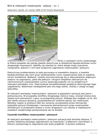 Brd w relacjach rowerzysta - pieszy - cz. I Utworzono: wtorek, 24, marzec 2009 13:45 Tomasz Wawrzonek Wraz z rozwojem ruchu rowerowego w Polsce pojawiło się szereg zjawisk dotychczas w dziedzinie bezpieczeństwa ruchu drogowego nieznanych. Nasiliły się również te, które dotąd miały znaczenie marginalne. Jednym z nich jest wzajemne zagrożenie rowerzystów i pieszych. Dotychczas problematyka ta była poruszana w niewielkim stopniu, a kwestie bezpieczeństwa obu tych grup użytkowników ruchu rozpatrywane były w zupełnie innym kontekście. Badania i analizy brd koncentrują się w zdecydowanie większym stopniu na zagrożeniu, jakie dla jednych i drugich (wspólnie zaliczanych do niechronionych użytkowników ruchu) stwarzają pojazdy niż na wzajemnych relacjach pomiędzy nimi. Stąd brakuje kompleksowego podejścia dotyczącego tego zagadnienia. Natomiast niewątpliwie jest ono tego warte, choćby z uwagi na jego specyfikę. W relacjach pomiędzy rowerzystami i pieszymi a pojazdami sytuacja jest jasna i jednoznaczna. W przypadku konfliktu drogowego różnica masy, energii kinetycznej stawia tych pierwszych z góry na przegranej pozycji. Dlatego bez względu na to, kto jest takiej sytuacji sprawcą, poszkodowanym zostanie pieszy lub rowerzysta. Niestety często w praktyce fakt ten oznacza uzurpowanie przez kierowców pojazdów pozycji silniejszego i naruszania elementarnych praw rowerzystów określonych w przepisach prawa o ruchu drogowym czy choćby w niepisanych zasadach wzajemnego poszanowania się na drodze. Czynniki konfliktu rowerzystów i pieszych W relacjach pomiędzy rowerzystami i pieszymi sytuacja jest bardziej złożona. Z punktu widzenia pieszego zagrożeniem są rowerzyści, a głównym czynnikiem, z którym utożsamiają to zagrożenie jest duża prędkość. Z punktu widzenia 1/7 Phoca PDF Brd w relacjach rowerzysta - pieszy - cz. I Utworzono: wtorek, 24, marzec 2009 13:45 Tomasz Wawrzonek rowerzystów pojawiający się nagle na drodze rowerowej lub wręcz anektujący ją dla siebie piesi stanowią jedną z najważniejszych przeszkód w bezpiecznym i komfortowym poruszaniu się rowerem. Prowadzi to do sytuacji konfliktowych, a ostatecznie skutkuje wypadkami. Skutkiem takiej sytuacji jest również narastający wzajemny brak zrozumienia pomiędzy tymi obiema grupami. Prezentują to wybrane wypowiedzi internatów z jednego z popularnych trójmiejskich portali informacyjnych (są one komentarzami do różnych artykułów prezentujących problematykę rowerową w Gdańsku): „Proponuję zrobić szybki kurs dla bezmyślnych ludzi chodzących po ścieżkach rowerowych, a szczególnie dla matek które puszczają swoje dzieci, a potem lamentują.” „Ja bym dodał do tego jeszcze jeden problem, nieco innej natury... mianowicie piesi chodzący niczym święte krowy po ścieżkach rowerowych! Jak im zwrócisz uwagę, to sapią jak lokomotywa. Czy naprawdę zrozumienie do czego służy chodnik, a do czego ścieżka rowerowa, jest tak trudne?” „Dla mnie to plaga! Pędzą na złamanie karku, ze ścieżki spod domu nie mogę bezpiecznie wejść na ścieżkę ogólnego użytku. Tak jest przy Burzyńskiego 3. Koszmar.” „Obydwie te społeczności są niejednokrotnie powodem nieprzyjemnych sytuacji ... są rowerzyści, co jeżdżą tylko po chodnikach i to z zawrotnymi prędkościami, ale także ludzie wyprowadzający psy na ścieżce (mimo że od chodnika są odgrodzone żywopłotem i kilkoma metrami zieleni) ... wystarczy częściej pojeździć na odcinku ścieżki przy ulicy Hallera na wysokości ZSBO, jeżdżę tam codziennie do pracy i coś o tym wiem.” Infrastruktura rowerowa w Gdańsku Historia dróg rowerowych w Gdańsku zaczęła się w pierwszej połowie lat 90. Wówczas powstała, mająca istotniejsze znaczenie dla obsługi ruchu rowerowego, droga (ścieżka) rowerowa wzdłuż Al. Rzeczpospolitej i ul. Chłopskiej (osiedla Zaspa i Przymorze). Wydzielono ją z chodnika za pomocą oznakowania poziomego, tworząc osobne przestrzenie dla pieszych i rowerzystów. Przy realizacji tej ścieżki kryterium bezpieczeństwa miało znaczenie marginalne, ale stanowiła ona istotny krok w rozwoju ruchu rowerowego w mieście. Na przestrzeni kolejnych lat (1994-1995) zaczęły powstawać następne drogi rowerowe, które już w dużo większym stopniu odpowiadały ówczesnym standardom bezpiecznego i nowoczesnego ciągu komunikacyjnego dla cyklistów. Drogi te zlokalizowane były na obszarze nadmorskim i służyły przede wszystkim celom rekreacyjnym. Niezwykle ważnym etapem w rozwoju gdańskiej sieci tras rowerowych było powołanie przez Pawła Adamowicza - prezydenta Gdańska, Społecznego Zespołu Konsultacyjnego do spraw dróg rowerowych. Stał się on platformą wymiany poglądów i kreowania działań promujących ruch rowerowy. W skład tego zespołu weszli zarówno przedstawiciele instytucji miejskich, jak również aktywiści rowerowi z takich organizacji, jak Obywatelska Liga Ekologiczna czy Polski Klub Ekologiczny. 2/7 Phoca PDF Brd w relacjach rowerzysta - pieszy - cz. I Utworzono: wtorek, 24, marzec 2009 13:45 Tomasz Wawrzonek Jednym z pierwszych efektów pracy Zespołu było przyjęcie Standardów Projektowych dla Infrastruktury Rowerowej. Współpraca służb miejskich oraz organizacji pozarządowych przyniosły opracowanie wytycznych, które do realizowanych dróg rowerowych wniosły elementy poprawy jakości możliwie bliskie oczekiwaniom rowerzystów. W oparciu o te standardy w 2001 roku powstała wzorcowa droga rowerowa wzdłuż ul. Hallera. Przełomowym momentem, który otworzył Gdańsk dla szeregu inwestycji związanych z drogami rowerowymi było podpisanie wiosną 2002 roku umowy z ONZ-owskim Funduszem na Rzecz Globalnego Środowiska (GEF - Global Environment Facility) o wdrożeniu Gdańskiego Rowerowego Projektu Inwestycyjno–Promocyjnego. Stało się to w głównej mierze dzięki organizacjom skupiającym środowiska rowerzystów, przy bardzo d