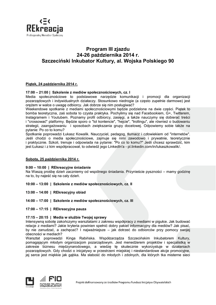 Program III zjazdu 24-26 października 2014 r. Szczeciński Inkubator Kultury, al. Wojska Polskiego 90 Piątek, 24 października 2014 r. 17:00 – 21:00 | Szkolenie z mediów społecznościowych, cz. I Media społecznościowe to podstawowe narzędzie komunikacji i promocji dla organizacji pozarządowych i indywidualnych działaczy. Stosunkowo niedrogie (a często zupełnie darmowe) jest orężem w walce o uwagę odbiorcy. Jak dobrze się nim posługiwać? Weekendowe spotkanie z mediami społecznościowymi będzie podzielone na dwie części. Piątek to bomba teoretyczna, zaś sobota to czysta praktyka. Pochylimy się nad Facebookiem, G+, Twitterem, Instagramem i Youtubem. Poznamy profil odbiorcy, zasięgi, a także nauczymy się dobierać treści i "crossować" platformy. Będzie sporo o "lol kontencie", "hejcie", "trollingu", ale również o budowaniu strategii, zaangażowaniu i sposobach zwiększania grupy docelowej. Odpowiemy sobie także na pytanie: Po co to komu? Spotkanie poprowadzi Łukasz Kowalik. Nauczyciel, pedagog, tłumacz i człowiekiem od "internetów". Jeśli chodzi o media społecznościowe, zajmuje się nimi zawodowo i prywatnie, teoretycznie i praktycznie. Szkoli, trenuje i odpowiada na pytanie: "Po co to komu?" Jeśli chcesz sprawdzić, kim jest Łukasz i z kim współpracował, to odwiedź jego LinkedIn'a - pl.linkedin.com/in/lukaszkowalik/. Sobota, 25 października 2014 r. 9:00 – 10:00 | REkreacyjne śniadanie Na Waszą prośbę dzień zaczniemy od wspólnego śniadania. Przynieście pyszności – mamy godzinę na to, by najeść się na cały dzień. 10:00 – 13:00 | Szkolenie z mediów społecznościowych, cz. II 13:00 – 14:00 | REkreacyjny obiad 14:00 – 17:00 | Szkolenie z mediów społecznościowych, cz. III 17:00 – 17:15 | REkreacyjna pauza 17:15 – 20:15 | Media w służbie Twojej sprawy Intensywną sobotę zakończymy warsztatami z zakresu współpracy z mediami w pigułce. Jak budować relacje z mediami? Jakie kryteria powinien spełnić dobry pakiet informacyjny dla mediów? Jak pisać, by nie zanudzać, a zachęcać? I najważniejsze – jak dotrzeć do odbiorców przy pomocy swojej obecności w mediach? Warsztat poprowadzi Kinga Rabińska. Współzarządza Szczecińskim Inkubatorem Kultury, pomagającym młodym organizacjom pozarządowym. Jest menedżerem projektów i specjalistką w zakresie biznesu międzynarodowego, a wiedzę tę skutecznie wykorzystuje w działaniach pozarządowych. Gdy chodzi o inicjatywy w przestrzeni miejskiej i niestandardowe akcje promocyjne, jej serce jest miękkie jak gąbka. Ma słabość do młodych i zdolnych, dla których tka misterne sieci wsparcia. Działa w kolektywie freelancerskim m.advertizing, gdzie zajmuje się copywritingiem. Kocha kino, a buty Larsa von Triera czyściłaby ściereczką z irchy. Współorganizowała spotkania filmowego klubu dyskusyjnego w Kontrastach, jest tłumaczem języka angielskiego, współpracowała ze szczecińskimi portalami informacyjnymi, m.in. ze wszczecinie.pl. Niedziela, 26 października 2014 r. 10:00 – 14:00 | Szkolenie z organizacji imprez i wydarzeń o charakterze kulturalnym, sportowym i rekreacyjnym Niedzielę poświęcimy na zdobywanie wiedzy z zakresu organizacji imprez i wydarzeń o charakterze kulturalnym, sportowym i rekreacyjnym w oparciu o obowiązujące przepisy prawa. Centralnym punktem odniesienia będzie Ustawa z dnia 20 marca 2009 r. o bezpieczeństwie imprez masowych. Podczas tego spotkania dowiecie się jak zgłaszać planowaną imprezę w Urzędzie Miasta, co to znaczy zmiana organizacji ruchu czy zajęcie pasa drogowego w sposób szczególny. Opowiemy jak zgłosić zgromadzenie i logistycznie zabezpieczyć imprezę. Zdobędziecie wiedzę z zakresu zasad zabezpieczania medycznego Waszego wydarzenia oraz ochrony osób i mienia. Omówimy planowanie i przygotowanie akcji oraz pokrótce jej promocję i reklamę. Szkolenie poprowadzi ekspercki duet – ojciec i syn. Tomasz Łuczkowski (syn) jest prawnikiem i prezesem firmy COMPLEX Studio Profesjonalnej Obsługi Imprez. Pomysłodawca i realizator wielu imprez o charakterze masowym i kameralnym o zakresie lokalnym, ogólnopolskim i międzynarodowym. Wspomagać go będzie Ryszard Łuczkowski (ojciec) – animator Towarzystwa Wspierania Inicjatyw Kulturalno-Społecznych TWIKS. Organizator imprez masowych, koncertów, festynów, imprez rekreacyjno-sportowych oraz przedsięwzięć reklamowych i promocyjnych (m.in. Szczecińskiego Spotkania Organizacji Pozarządowych POD PLATANAMI). Autor materiałów metodycznych i repertuarowych. Jak przygotować się do Zjazdu? 1. Wyśpij się i nie stresuj – wszyscy jesteśmy tu po to, by dobrze się bawić i dużo nauczyć, a do tego potrzeba spokojnego umysłu. 2. Nie spóźniaj się i opuszczaj zajęć – utrudni to pracę wszystkim, a przede wszystkim Tobie. 3. Bądź aktywna/-y. Jeśli z jakąś częścią zajęć jesteś lepiej zaznajomiona/-y, podziel się swoją wiedzą! 4. Ubierz się wygodnie i weź potrzebne Ci akcesoria. Niektóre działania mogą wymagać zaangażowania ruchowego, a przyda się także coś na notatki. Zapewniamy podstawowe materiały, lecz jeśli marzy Ci się robienie notatek na tablecie, to chętnie popatrzymy, bo sami nie mamy 5. Komunikuj się! Jeśli jest jakiś problem lub masz dla nas sugestie – powiedz to nam. 6. Nie bój się liczby godzin przewidzianych zajęć – przygotowujemy je tak, by minęły w okamgnieniu. Pisz, dzwoń, wpadnij! Kinga Rabińska ([email protected], 91 424 04 64) Katarzyna Sadowska ([email protected], 91 424 04 64) Szczeciński Inkubator Kultury, al. Wojska Polskiego 90, I piętro