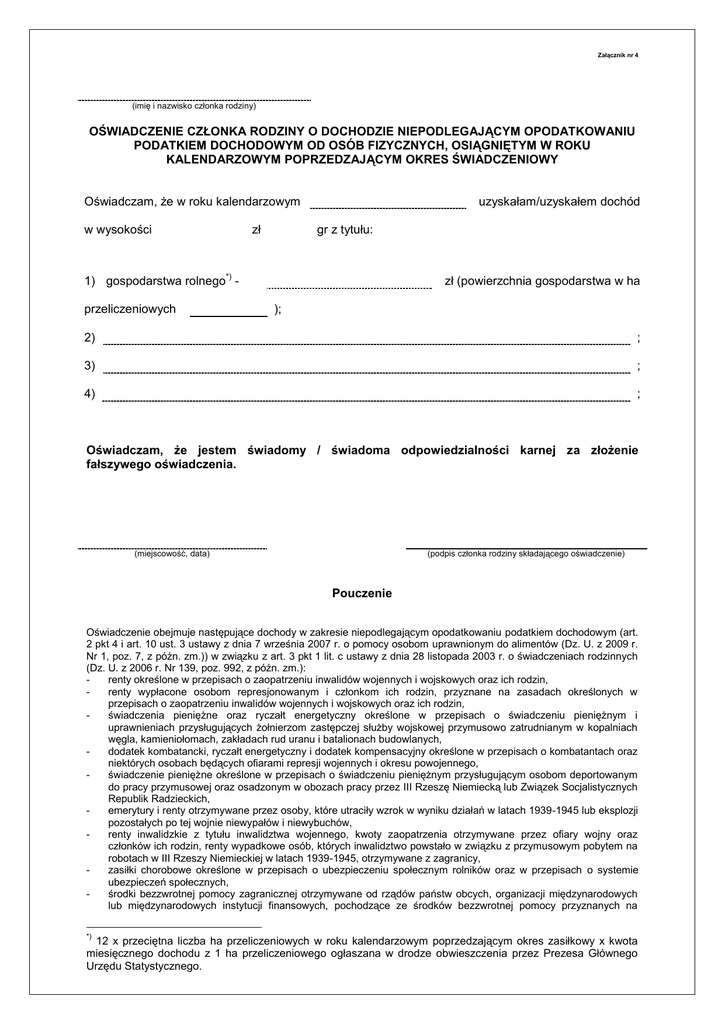 Załącznik nr 4 (imię i nazwisko członka rodziny) OŚWIADCZENIE CZŁONKA RODZINY O DOCHODZIE NIEPODLEGAJĄCYM OPODATKOWANIU PODATKIEM DOCHODOWYM OD OSÓB FIZYCZNYCH, OSIĄGNIĘTYM W ROKU KALENDARZOWYM POPRZEDZAJĄCYM OKRES ŚWIADCZENIOWY Oświadczam, że w roku kalendarzowym w wysokości zł uzyskałam/uzyskałem dochód gr z tytułu: *) zł (powierzchnia gospodarstwa w ha 1) gospodarstwa rolnego przeliczeniowych ); 2) ; 3) ; 4) ; Oświadczam, że jestem świadomy / świadoma odpowiedzialności karnej za złożenie fałszywego oświadczenia. (miejscowość, data) (podpis członka rodziny składającego oświadczenie) Pouczenie Oświadczenie obejmuje następujące dochody w zakresie niepodlegającym opodatkowaniu podatkiem dochodowym (art. 2 pkt 4 i art. 10 ust. 3 ustawy z dnia 7 września 2007 r. o pomocy osobom uprawnionym do alimentów (Dz. U. z 2009 r. Nr 1, poz. 7, z późn. zm.)) w związku z art. 3 pkt 1 lit. c ustawy z dnia 28 listopada 2003 r. o świadczeniach rodzinnych (Dz. U. z 2006 r. Nr 139, poz. 992, z późn. zm.): renty określone w przepisach o zaopatrzeniu inwalidów wojennych i wojskowych oraz ich rodzin, renty wypłacone osobom represjonowanym i członkom ich rodzin, przyznane na zasadach określonych w przepisach o zaopatrzeniu inwalidów wojennych i wojskowych oraz ich rodzin, świadczenia pieniężne oraz ryczałt energetyczny określone w przepisach o świadczeniu pieniężnym i uprawnieniach przysługujących żołnierzom zastępczej służby wojskowej przymusowo zatrudnianym w kopalniach węgla, kamieniołomach, zakładach rud uranu i batalionach budowlanych, dodatek kombatancki, ryczałt energetyczny i dodatek kompensacyjny określone w przepisach o kombatantach oraz niektórych osobach będących ofiarami represji wojennych i okresu powojennego, świadczenie pieniężne określone w przepisach o świadczeniu pieniężnym przysługującym osobom deportowanym do pracy przymusowej oraz osadzonym w obozach pracy przez III Rzeszę Niemiecką lub Związek Socjalistycznych Republik Radzieckich, emerytury i renty otrzymywane przez osoby, które utraciły wzrok w wyniku działań w latach 1939-1945 lub eksplozji pozostałych po tej wojnie niewypałów i niewybuchów, renty inwalidzkie z tytułu inwalidztwa wojennego, kwoty zaopatrzenia otrzymywane przez ofiary wojny oraz członków ich rodzin, renty wypadkowe osób, których inwalidztwo powstało w związku z przymusowym pobytem na robotach w III Rzeszy Niemieckiej w latach 1939-1945, otrzymywane z zagranicy, zasiłki chorobowe określone w przepisach o ubezpieczeniu społecznym rolników oraz w przepisach o systemie ubezpieczeń społecznych, środki bezzwrotnej pomocy zagranicznej otrzymywane od rządów państw obcych, organizacji międzynarodowych lub międzynarodowych instytucji finansowych, pochodzące ze środków bezzwrotnej pomocy przyznanych na *) 12 x przeciętna liczba ha przeliczeniowych w roku kalendarzowym poprzedzającym okres zasiłkowy x kwota miesięcznego dochodu z 1 ha przeliczeniowego ogłaszana w drodze obwieszczenia przez Prezesa Głównego Urzędu Statystycznego. - - - - - - - - podstawie jednostronnej deklaracji lub umów zawartych z tymi państwami, organizacjami lub instytucjami przez Radę Ministrów, właściwego ministra lub agencje rządowe, w tym również w przypadkach, gdy przekazanie tych środków jest dokonywane za pośrednictwem podmiotu upoważnionego do rozdzielania środków bezzwrotnej pomocy zagranicznej na rzecz podmiotów, którym ma służyć ta pomoc, należności ze stosunku pracy lub z tytułu stypendium osób fizycznych mających miejsce zamieszkania na terytorium Rzeczypospolitej Polskiej, przebywających czasowo za granicą - w wysokości odpowiadającej równowartości diet z tytułu podróży służbowej poza granicami kraju ustalonych dla pracowników zatrudnionych w państwowych lub samorządowych jednostkach sfery budżetowej na podstawie ustawy z dnia 26 czerwca 1974 r. Kodeks pracy (Dz. U. z 1998 r. Nr 21, poz. 94, z późn. zm.), należności pieniężne wypłacone policjantom, żołnierzom, celnikom i pracownikom jednostek wojskowych i jednostek policyjnych użytych poza granicami państwa w celu udziału w konflikcie zbrojnym lub wzmocnienia sił państwa albo państw sojuszniczych, misji pokojowej, akcji zapobieżenia aktom terroryzmu lub ich skutkom, a także należności pieniężne wypłacone żołnierzom, policjantom, celnikom i pracownikom pełniącym funkcje obserwatorów w misjach pokojowych organizacji międzynarodowych i sił wielonarodowych, należności pieniężne ze stosunku służbowego otrzymywane w czasie służby kandydackiej przez funkcjonariuszy Policji, Państwowej Straży Pożarnej, Straży Granicznej, Biura Ochrony Rządu obliczone za okres, w którym osoby te uzyskały dochód, dochody członków rolniczych spółdzielni produkcyjnych z tytułu członkostwa w rolniczej spółdzielni produkcyjnej, pomniejszone o składki na ubezpieczenia społeczne, alimenty na rzecz dzieci, stypendia doktoranckie i habilitacyjne przyznane na podstawie ustawy z dnia 14 marca 2003 r. o stopniach naukowych i tytule naukowym oraz o stopniach i tytule w zakresie sztuki (Dz. U. Nr 65, poz. 595, z późn. zm.), stypendia doktoranckie określone w art. 200 ustawy z dnia 27 lipca 2005 r. – Prawo o szkolnictwie wyższym (Dz. U. Nr 164, poz. 1365, z późn. zm.), stypendia sportowe przyznane na podstawie ustawy z dnia 25 czerwca 2010 r. o sporcie (Dz. U. Nr 127, poz. 857, z późn. zm.) oraz inne stypendia o charakterze socjalnym przyznane uczniom lub studentom, kwoty diet nieopodatkowane podatkiem dochodowym od osób fizycznych, otrzymywane przez osoby wykonujące czynności związane z pełnieniem obowiązków społecznych i obywatelskich, należności pieniężne otrzymywane z tytułu wynajmu pokoi gościnnych w budynkach mieszkalnych położonych na terenach wiejskich w gospodarstwie rolnym osobom przebywającym na wypoczynku oraz uzyskane z tytułu wy