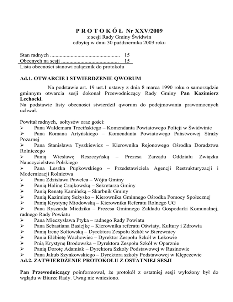 P R O T O K Ó Ł Nr XXV/2009 z sesji Rady Gminy Świdwin odbytej w dniu 30 października 2009 roku Stan radnych ................................................... 15 Obecnych na sesji .......................................... 15 Lista obecności stanowi załącznik do protokołu Ad.1. OTWARCIE I STWIERDZENIE QWORUM Na podstawie art. 19 ust.1 ustawy z dnia 8 marca 1990 roku o samorządzie gminnym otwarcia sesji dokonał Przewodniczący Rady Gminy Pan Kazimierz Lechocki. Na podstawie listy obecności stwierdził qworum do podejmowania prawomocnych uchwał. Powitał radnych, sołtysów oraz gości: Pana Waldemara Trzcińskiego – Komendanta Powiatowego Policji w Świdwinie Pana Romana Artyńskiego – Komendanta Powiatowego Państwowej Straży Pożarnej Pana Stanisława Tyszkiewicz – Kierownika Rejonowego Ośrodka Doradztwa Rolniczego Panią Wiesławę Reszczyńską – Prezesa Zarządu Oddziału Związku Nauczycielstwa Polskiego Pana Leszka Pupkowskiego – Przedstawiciela Agencji Restrukturyzacji i Modernizacji Rolnictwa Pana Zdzisława Pawelca – Wójta Gminy Panią Halinę Czajkowską – Sekretarza Gminy Panią Renatę Kamińską – Skarbnik Gminy Panią Kazimierę Seżysko – Kierownika Gminnego Ośrodka Pomocy Społecznej Panią Krystynę Miodowską – Kierownika Referatu Rolnego UG Pana Ryszarda Miedzika – Prezesa Gminnego Zakładu Gospodarki Komunalnej, radnego Rady Powiatu Pana Mieczysława Ptyka – radnego Rady Powiatu Pana Sebastiana Basiejkę – Kierownika referatu Oświaty, Kultury i Zdrowia Panią Irenę Sołtowską – Dyrektora Zespołu Szkół w Bierzwnicy Pania Elżbietę Wachowiec – Dyrektor Zespołu Szkół w Lekowie Pnią Krystynę Brodowska – Dyrektora Zespołu Szkół w Oparznie Panią Dorotę Adamiak – Dyrektora Szkoły Podstawowej w Rusinowie Pana Jakub Szynkowskiego – Dyrektora szkoły Podstawowej w Klępczewie Ad.2. ZATWIERDZENIE PROTOKOŁU Z OSTATNIEJ SESJI Pan Przewodniczący poinformował, że protokół z ostatniej sesji wyłożony był do wglądu w Biurze Rady. Uwag nie wniesiono. 2 Radni w głosowaniu jawnym protokół przyjęli jednogłośnie Ad.3. PRZYJĘCIE PORZĄDKU OBRAD Przewodniczący Rady Pan Kazimierz Lechocki przedstawił propozycję porządku obrad, który był podany w zaproszeniach na Sesję. W głosowaniu jawnym radni porządek obrad przyjęli jednogłośnie, przedstawia się następująco: 1. 2. 3. 4. 5. 6. 7. 8. 9. 10. 11. 12. 13. 14. 15. a Otwarcie i stwierdzenie qworum Zatwierdzenie protokołu z ostatniej sesji Przyjęcie porządku obrad Interpelacje radnych Sprawozdanie Przewodniczących Komisji Rady Gminy z prac w okresie między sesjami Sprawozdanie Wójta Gminy z wykonania uchwał i pracy w okresie między sesjami. Założenia polityki społeczno-gospodarczej gminy na 2010 rok Stawki podatkowe na 2010 rok Informacja Wójta o stanie oświaty na terenie gminy „Czas dla Samorządów” Dyskusja Podjęcie uchwał Odpowiedzi na interpelacje i zapytania Wolne wnioski Zakończenie Ad.4. INTERPELACJE RADNYCH Radny Pan Antoni Giluk zgłosił problem odcinka drogi powiatowej w Cieszeniewie. Od strony Borkowa z cieku melioracyjnego wypływa i stoi woda. Nadchodzi czas zimy i lód będzie stanowił niebezpieczeństwo. Podobny problem przedstawiła radna Pani Halina Cybul. Przy wjeździe do Ząbrowa stykają się dwie nawierzchnie: kostka brukowa z asfaltem. Przy niewielkich nawet opadach deszczu stoi tam duża kałuża wody. Pani Halina Cybul zwróciła się również z prośbą o rozważenie możliwości ustawienia znaku ograniczenia prędkości, bądź spowalniaczy na drodze brukowej. Przemieszczający się po niej ciężki sprzęt powoduje wstrząsy, co jest bardzo uciążliwe dla mieszkańców („trzęsą się mury”). Zastępca Przewodniczącego Rady Gminy Pan Krzysztof Kaszuba zwrócił uwagę na pilne zabezpieczenie budynków po POLFARM. Ad.5. SPRAWOZDANIE PRZEWODNICZĄCYCH KOMISJI RADY GMINY Z PRAC W OKRESIE MIĘDZY SESJAMI 3 Przewodnicząca Komisji Rewizyjnej Pani Halina Cybul odczytała protokół z przeprowadzonej kontroli wydatków na zabezpieczenie przeciwpożarowe za okres od stycznia do września 2009 roku. Protokół sporządzony w dniu 15 października 2009 roku do wglądu znajduje się w aktach Komisji Rewizyjnej. Pani Daniela Bodnar – Przewodnicząca Komisji Oświaty, Kultury, Zdrowia, Sportu i Etyki Radnych. Komisja w okresie między sesjami odbyła jedno posiedzenie, wspólnie z Komisją Budżetową, na którym analizowano realizację budżetu oświaty (wszystkich szkół gminnych) za I-sze półrocze 2009 roku. Komisja stwierdziła, że szkoły przeznaczają zbyt małe środki na remonty. Istnieje zagrożenie, że po dwóch, trzech latach samodzielnego funkcjonowania będą wymagały kapitalnych remontów, a środki na ten cel będzie musiała zabezpieczyć gmina. Na spotkaniu Pan Sebastian Basiejko – Kierownik Referatu Oświaty, Kultury i Zdrowia przedstawił bardzo obszerny materiał (w formie multimedialnej) podsumowujący pracę szkół i osiągnięcia poszczególnych placówek w roku szkolnym 2008/2009. Przewodniczący Komisji Budżetowej, Rozwoju Gospodarczego, Handlu, Usług, Bezrobocia i Opieki Społecznej Pan Antoni Giluk – Komisja w okresie między sesjami odbyła trzy posiedzenia, na których omawiano: bezrobocie i opieka społeczna wspólnie z Komisją Oświaty – Realizacja budżetu oświaty za I-sze półrocze 2009 roku pod kątem założeń polityki społeczno – gospodarczej gminy na 2010 rok założenia polityki społeczno gospodarczej gminy oraz propozycje stawek podatkowych na 2010 rok Pan Ryszard Pawlonka – Przewodniczący Komisji Rolnictwa, Leśnictwa, Ochrony Środowiska, Bezpieczeństwa i Przestrzegania Prawa. Komisja uczestniczyła w jednym wspólnym posiedzeniu, gdzie omawiane były propozycje stawek podatkowych na 2010 rok oraz rozpatrzone projekty uchwał na XXV/2009 Sesję Rady Gminy. Ad.6. SPRAWOZDANIE WÓJTA GMINY Z I PRACY W OKRESIE MIĘDZY SESJAMI. WYKONANIA 