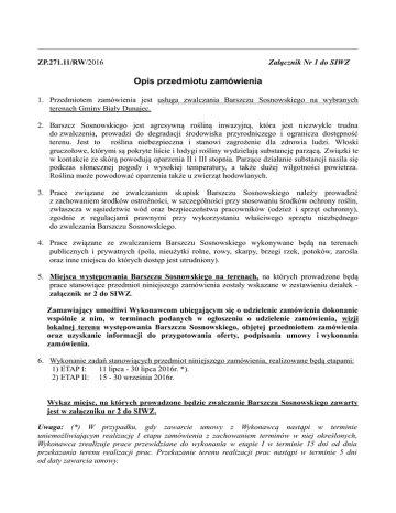 ZP.271.11/RW/2016 Załącznik Nr 1 do SIWZ Opis przedmiotu zamówienia 1. Przedmiotem zamówienia jest usługa zwalczania Barszczu Sosnowskiego na wybranych terenach Gminy Biały Dunajec. 2. Barszcz Sosnowskiego jest agresywną rośliną inwazyjną, która jest niezwykle trudna do zwalczenia, prowadzi do degradacji środowiska przyrodniczego i ogranicza dostępność terenu. Jest to roślina niebezpieczna i stanowi zagrożenie dla zdrowia ludzi. Włoski gruczołowe, którymi są pokryte liście i łodygi rośliny wydzielają substancję parzącą. Związki te w kontakcie ze skórą powodują oparzenia II i III stopnia. Parzące działanie substancji nasila się podczas słonecznej pogody i wysokiej temperatury, a także dużej wilgotności powietrza. Roślina może powodować oparzenia także u zwierząt hodowlanych. 3. Prace związane ze zwalczaniem skupisk Barszczu Sosnowskiego należy prowadzić z zachowaniem środków ostrożności, w szczególności przy stosowaniu środków ochrony roślin, zwłaszcza w sąsiedztwie wód oraz bezpieczeństwa pracowników (odzież i sprzęt ochronny), zgodnie z regulacjami prawnymi przy wykorzystaniu właściwego sprzętu niezbędnego do zwalczania Barszczu Sosnowskiego. 4. Prace związane ze zwalczaniem Barszczu Sosnowskiego wykonywane będą na terenach publicznych i prywatnych (pola, nieużytki rolne, rowy, skarpy, brzegi rzek, potoków, zarośla oraz inne miejsca do których dostęp jest utrudniony). 5. Miejsca występowania Barszczu Sosnowskiego na terenach, na których prowadzone będą prace stanowiące przedmiot niniejszego zamówienia zostały wskazane w zestawieniu działek załącznik nr 2 do SIWZ. Zamawiający umożliwi Wykonawcom ubiegającym się o udzielenie zamówienia dokonanie wspólnie z nim, w terminach podanych w ogłoszeniu o udzielenie zamówienia, wizji lokalnej terenu występowania Barszczu Sosnowskiego, objętej przedmiotem zamówienia oraz uzyskanie informacji do przygotowania oferty, podpisania umowy i wykonania zamówienia. 6. Wykonanie zadań stanowiących przedmiot niniejszego zamówienia, realizowane będą etapami: 1) ETAP I: 11 lipca - 30 lipca 2016r. *). 2) ETAP II: 15 - 30 września 2016r. Wykaz miejsc, na których prowadzone będzie zwalczanie Barszczu Sosnowskiego zawarty jest w załączniku nr 2 do SIWZ. Uwaga: (*) W przypadku, gdy zawarcie umowy z Wykonawcą nastąpi w terminie uniemożliwiającym realizację I etapu zamówienia z zachowaniem terminów w niej określonych, Wykonawca zrealizuje prace przewidziane do wykonania w etapie I w terminie 15 dni od dnia przekazania terenu realizacji prac. Przekazanie terenu realizacji prac nastąpi w terminie 5 dni od daty zawarcia umowy. 7. Prace przewidziane do wykonania w ramach zabiegów agrotechnicznych i chemicznych: 1) Zabieg mechaniczny i chemiczny – koszenie kosiarką mulczującą i opryskiwacz ciągnikowy – pow. m2 - 0,700 ha ( 1 etap) 2) Zabieg agrotechniczny ręczny - wycinanie sprzętem ręcznym (np. sierp szwajcarski, maczeta, tasak) l i opryskiwanie opryskiwaczem plecakowym – pow. m2 - 4,871 ha ( 1 etap) 3) Zabieg chemiczny ręczny – (strzykawkowy) oraz wykopanie ręczne lub ucinanie poniżej szyjki korzennej (zabiegi wykonywane na brzegach cieków lub zbiorników wodnych).pow. m2 - 1,203 ha ( 1 etap). 8.Wykonanie zabiegów musi gwarantować usunięcie 100% roślin na zakończenie okresu wegetacyjnego w danym roku, skuteczne zatrucie preparatami chemicznymi systemu korzeniowego ( z zastrzeżeniem obszarów na których niedozwolone będzie stosowanie środków chemicznych ) 9.Wykonawca zapewnia sprzęt, narzędzia, środki chemiczne oraz ludzi w ilościach niezbędnych do sprawnej realizacji przedmiotu zamówienia, w terminach określonych w pkt 6 i gwarantujące prawidłowe wykonywanie prac. 1) Wykonawca będzie używał jedynie takiego sprzętu, który nie spowoduje niekorzystnego wpływu na jakość wykonywanych prac. 2) Sprzęt, który posłuży do wykonywania zabiegów musi być w dobrym stanie technicznym (gotowy do pracy), musi spełniać wymagania norm ochrony środowiska, przepisów dotyczących jego użytkowania i musi być stosowany zgodnie z przeznaczeniem. 3) Opryskiwacze stosowane do wykonywania zabiegów chemicznych muszą posiadać atestację Państwowej Inspekcji Ochrony Roślin i Nasiennictwa - aktualną co najmniej w terminach określonych w pkt 6. 4) Osoby wykonujące zabiegi chemiczne muszą być odpowiednio przeszkolone, w szczególności z zakresu: a) bezpieczeństwa pracy w rolnictwie, b) stosowania środków ochrony roślin, w szczególności przy użyciu opryskiwaczy (muszą posiadać stosowne zaświadczenia lub inne dokumenty). 10.Zamawiający nie zapewnia środków chemicznych potrzebnych do wykonania zabiegów chemicznych. 11.Środki chemiczne stosowane do wykonania zabiegów muszą posiadać aktualne zezwolenie Ministerstwa Rolnictwa i Rozwoju Wsi dopuszczające ich stosowanie na terenie Polski. 12. Środki chemiczne nie mogą być stosowane w formie oprysku powierzchniowego w odległości mniejszej niż 10 m od nurtu cieków i zbiorników wodnych. 13. W przypadku występowania stanowisk barszczu na odsypiskach żwirowych i wyspach w obrębie rzek, potoków i zbiorników wodnych oraz na ich skarpach brzegowych w odległości mniejszej niż 2 m od lustra wody – zabronione jest stosowanie środków chemicznych. Jedyna dozwolona metoda to zabieg agrotechniczny ręczny – wykopanie polegające na przecięciu szyjki korzeniowej na głębokości min. 20-30 cm poniżej powierzchni gruntu. 14. Do zabiegów chemicznych zwalczania barszczu Sosnowskiego należy stosować mieszankę herbicydową: Roundup Ulta 360 SL 4l/ha+Chikara 25 WG 200 gramów + As( adiuwant 1 litr). 15. Pozyskane po skoszeniu masy zielone nie mogą być przedmiotem obrotu towarowego. Masy zielone pozostałe po ścięciu należy rozdrobnić i pozostawić w miejscu wykonywania zabiegu. 16. Przy likwidacji barszczu Sosnowskiego nad brzegami wód oraz na poje